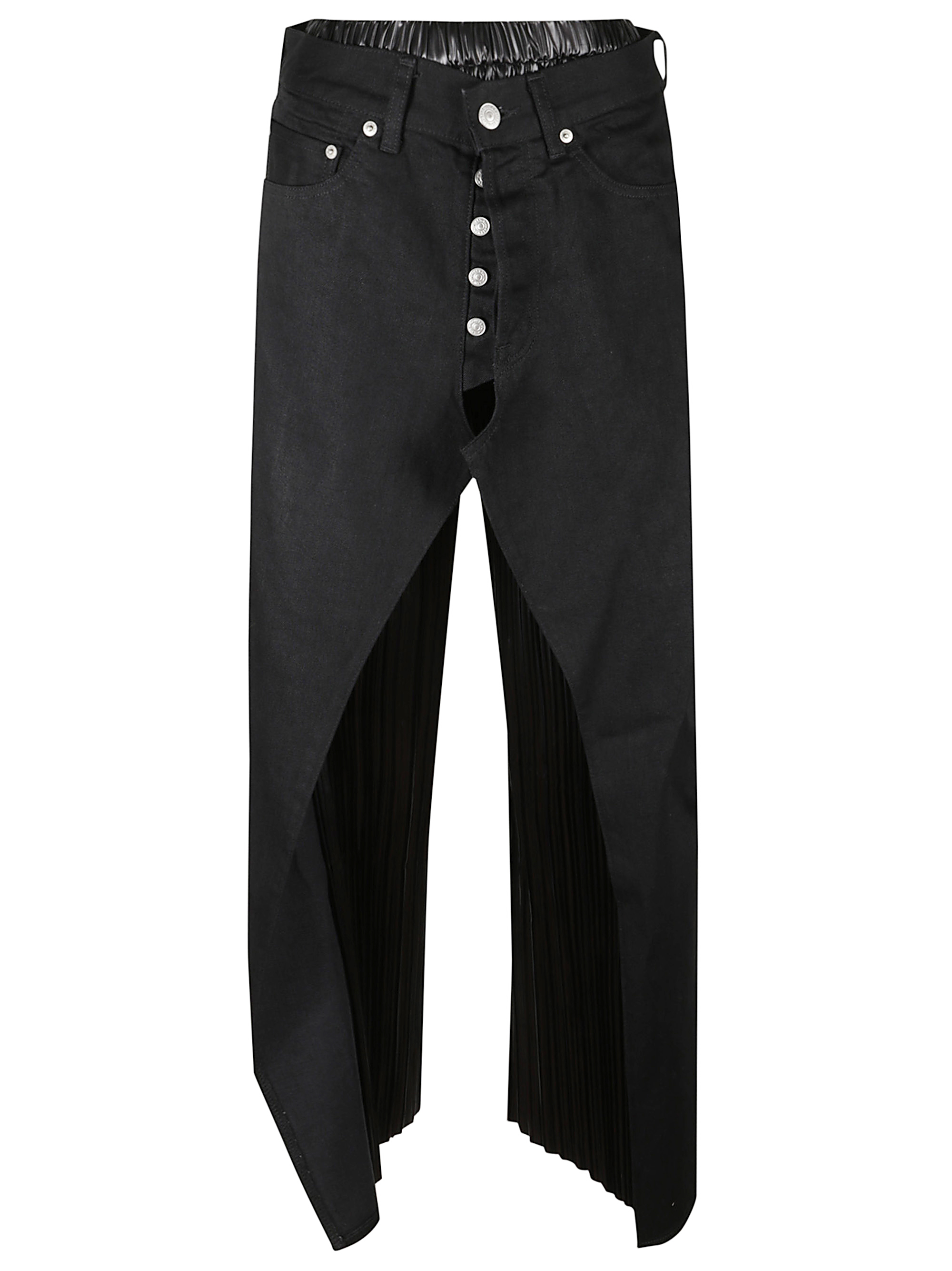 Jeans neri di JUNYA WATANABE caratterizzati da dettagli in ecopelle plissettati, vita elasticizzata e sovrapposizioni in tessuto.