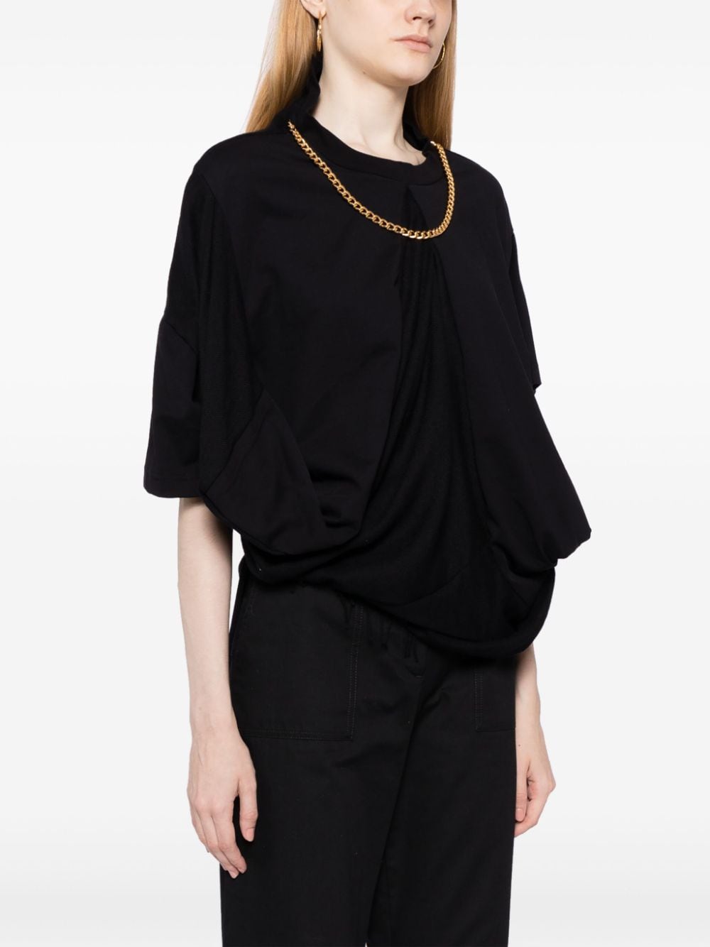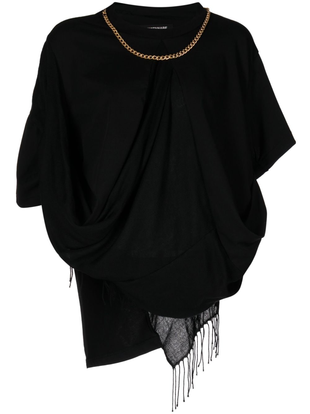 T-shirt in cotone di JUNYA WATANABE colore nero, caratterizzato da design asimmetrica, girocollo, maniche corte, dettaglio orlo con frange e dettaglio a collana.