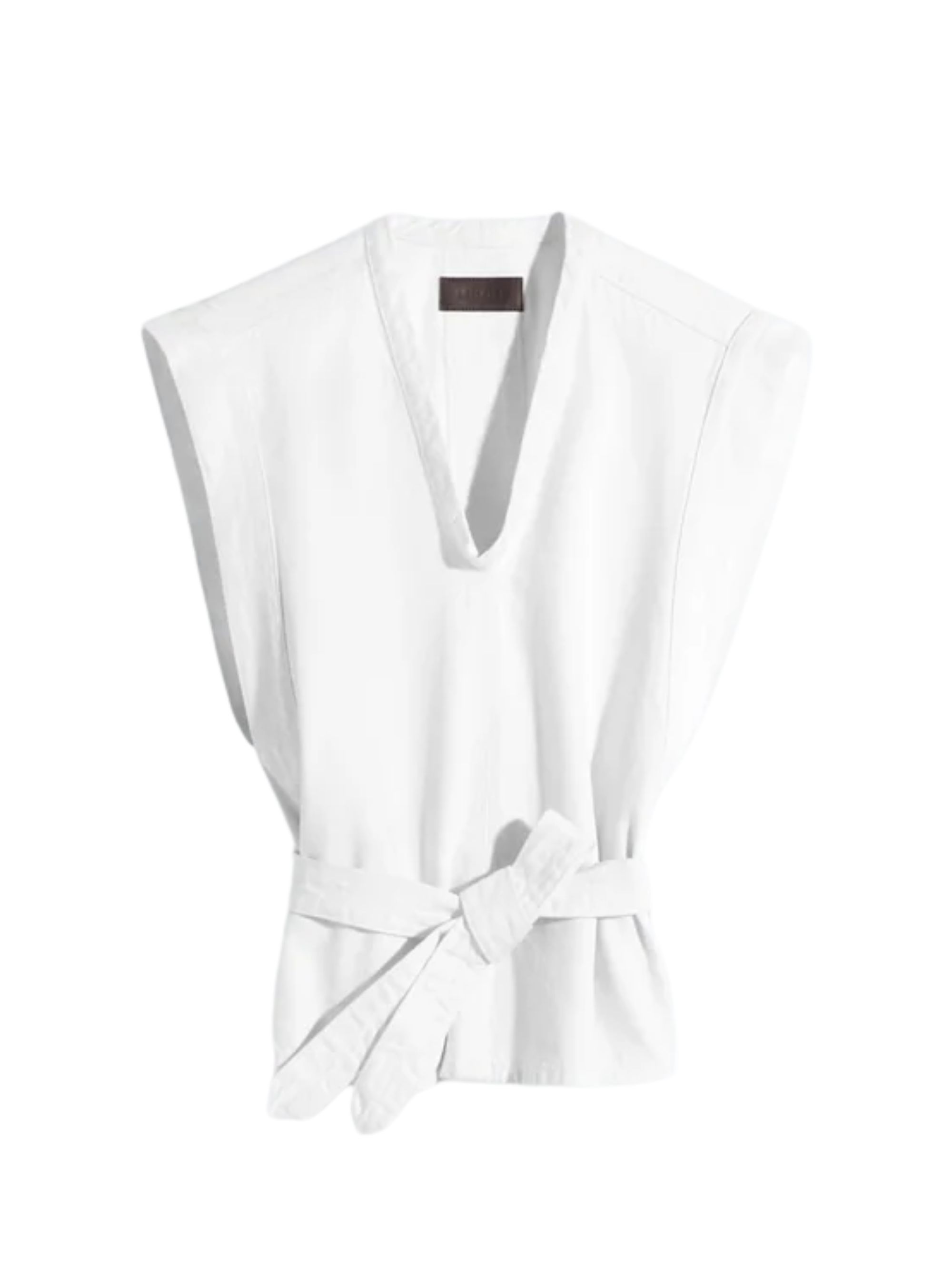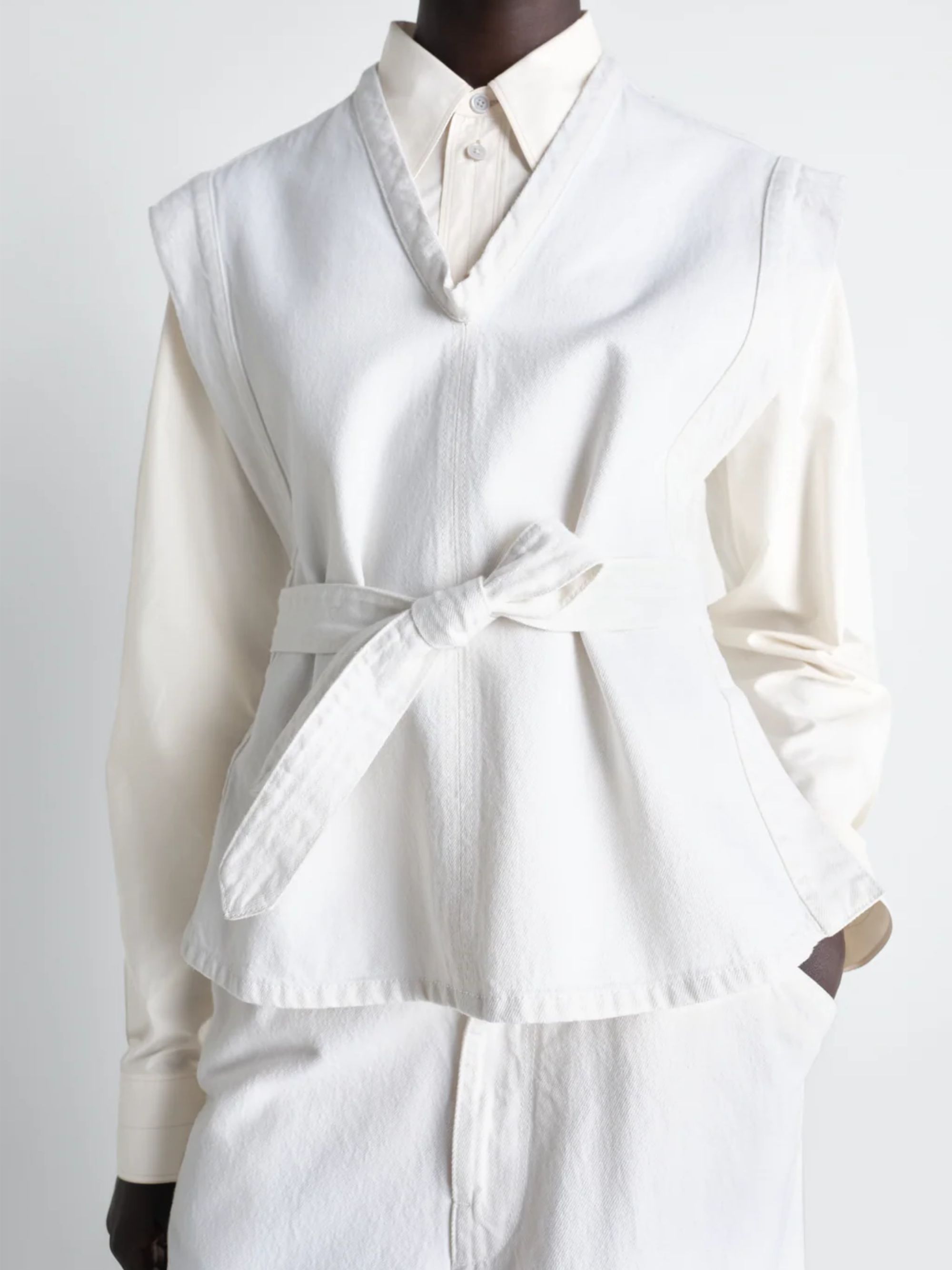 Camicia Chasuble di LEMAIRE bianca in denim sbiancato senza maniche, caratterizzata da vestibilità dritta, scollo a V, cintura con passante posteriore e etichetta in pelle con logo in rilievo.