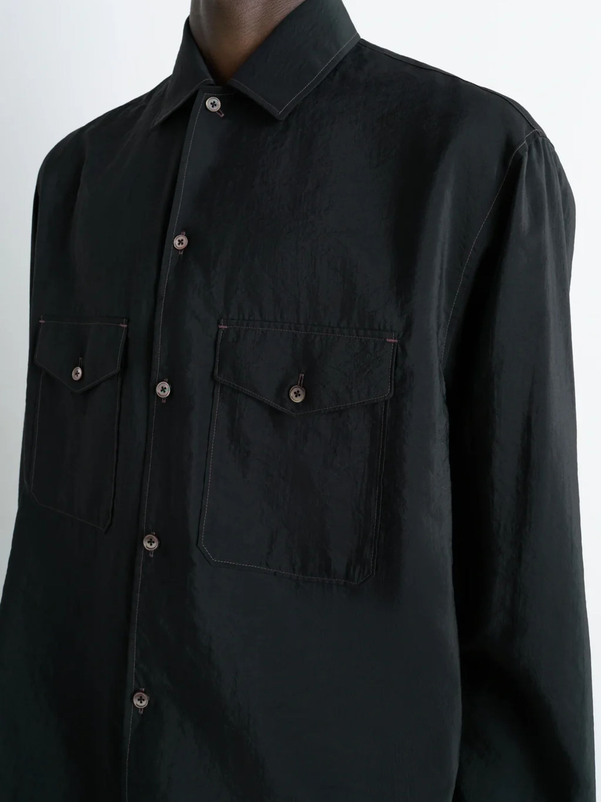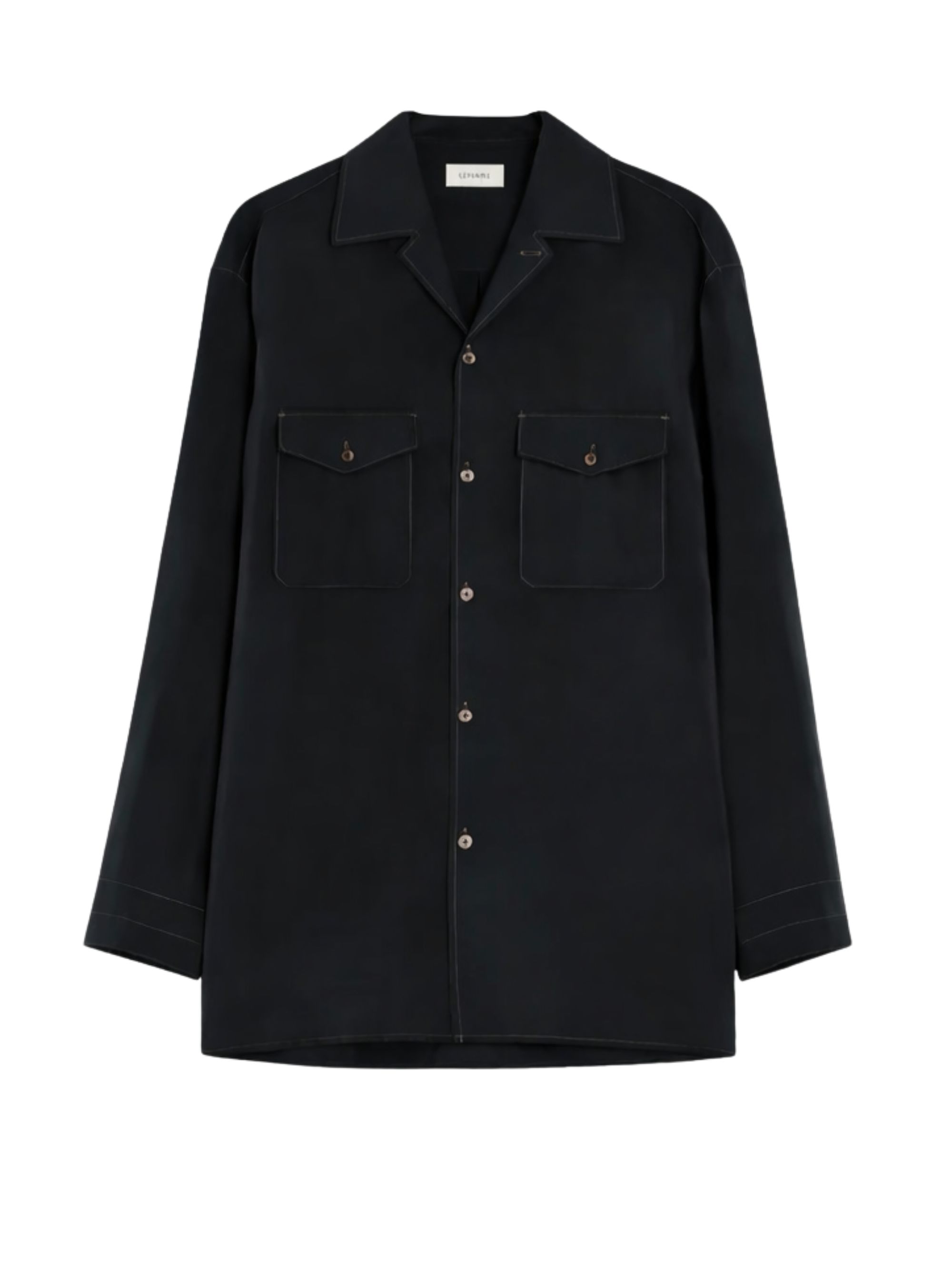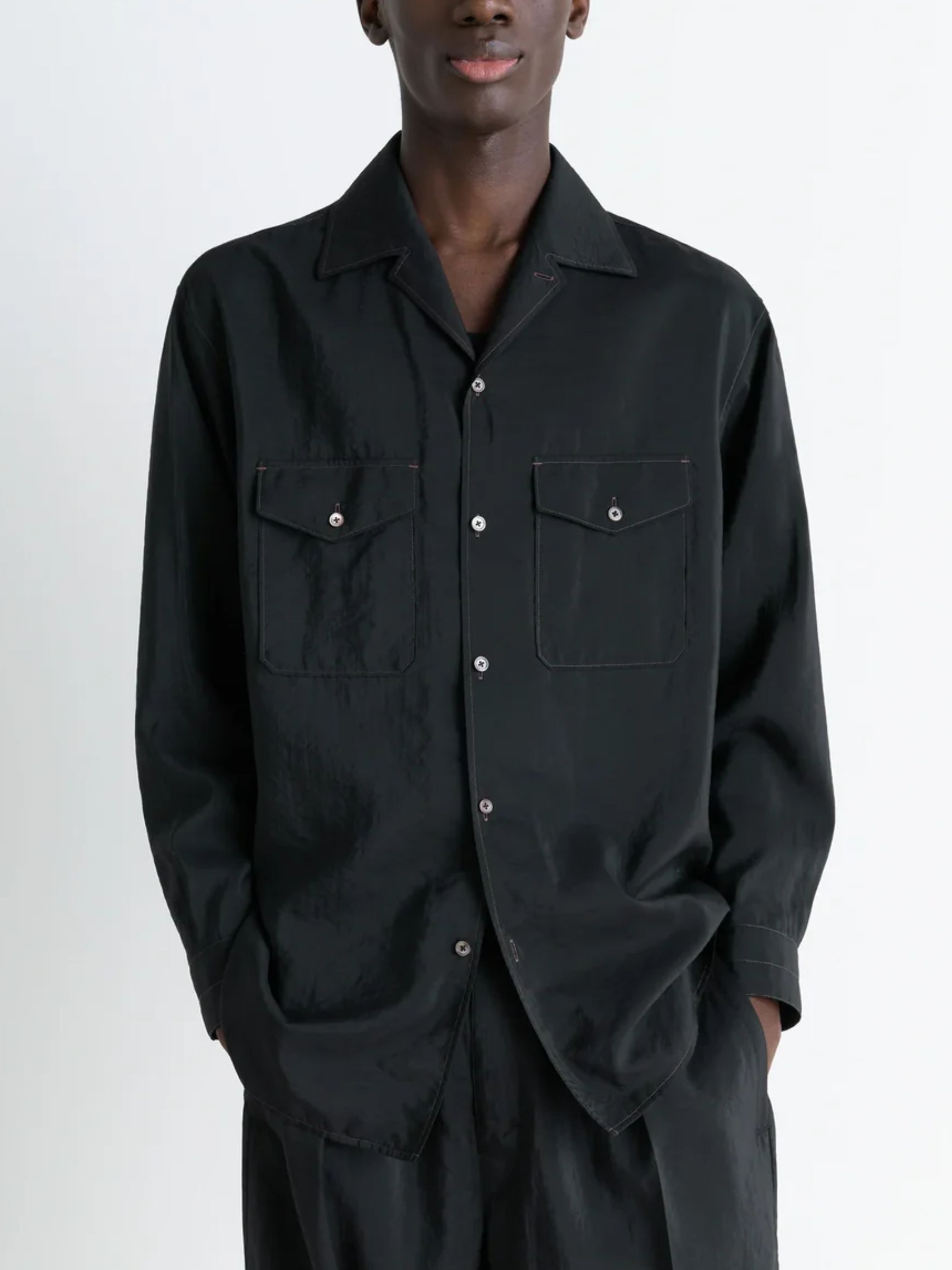 Camicia Convertible di LEMAIRE nera in seta, caratterizzata da colletto convertibile, chiusura con bottoni, maniche lunghe, polsini dritti con bottoni, tasche sul petto con patta e bottone, bottoni in madreperla e spacchi laterali.