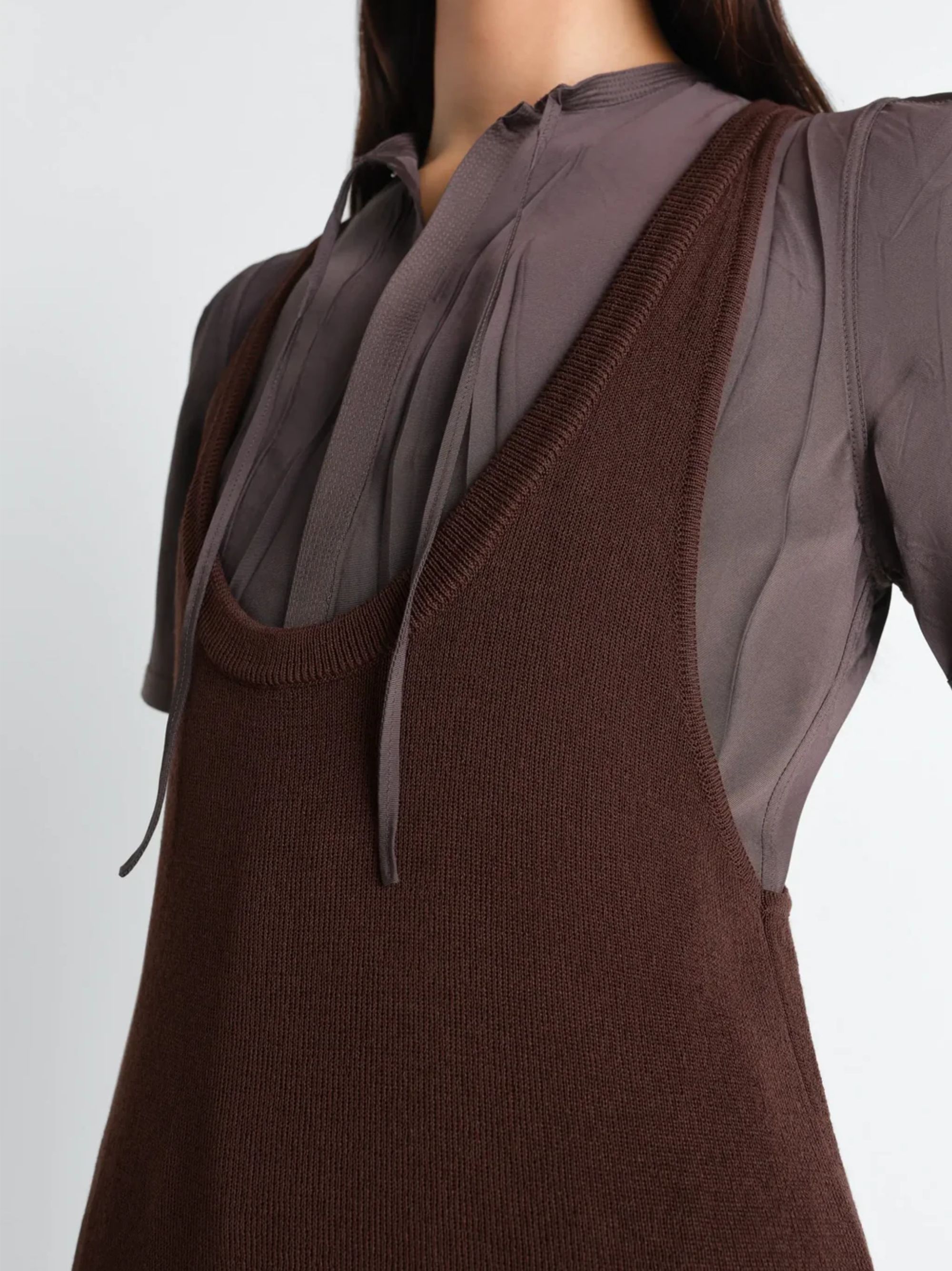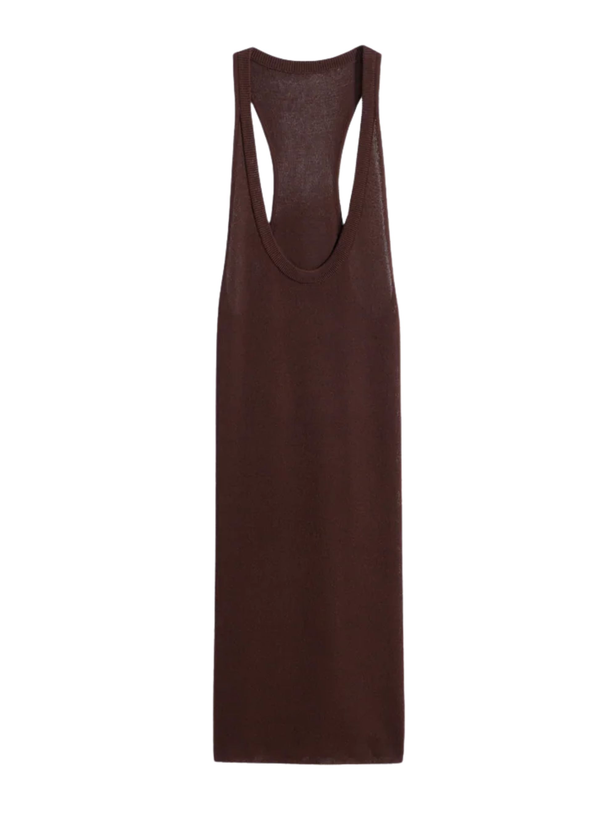Mini abito canotta di LEMAIRE marrone in crepe di viscosa, caratterizzato da scollatura profonda e finitura aderente a coste.