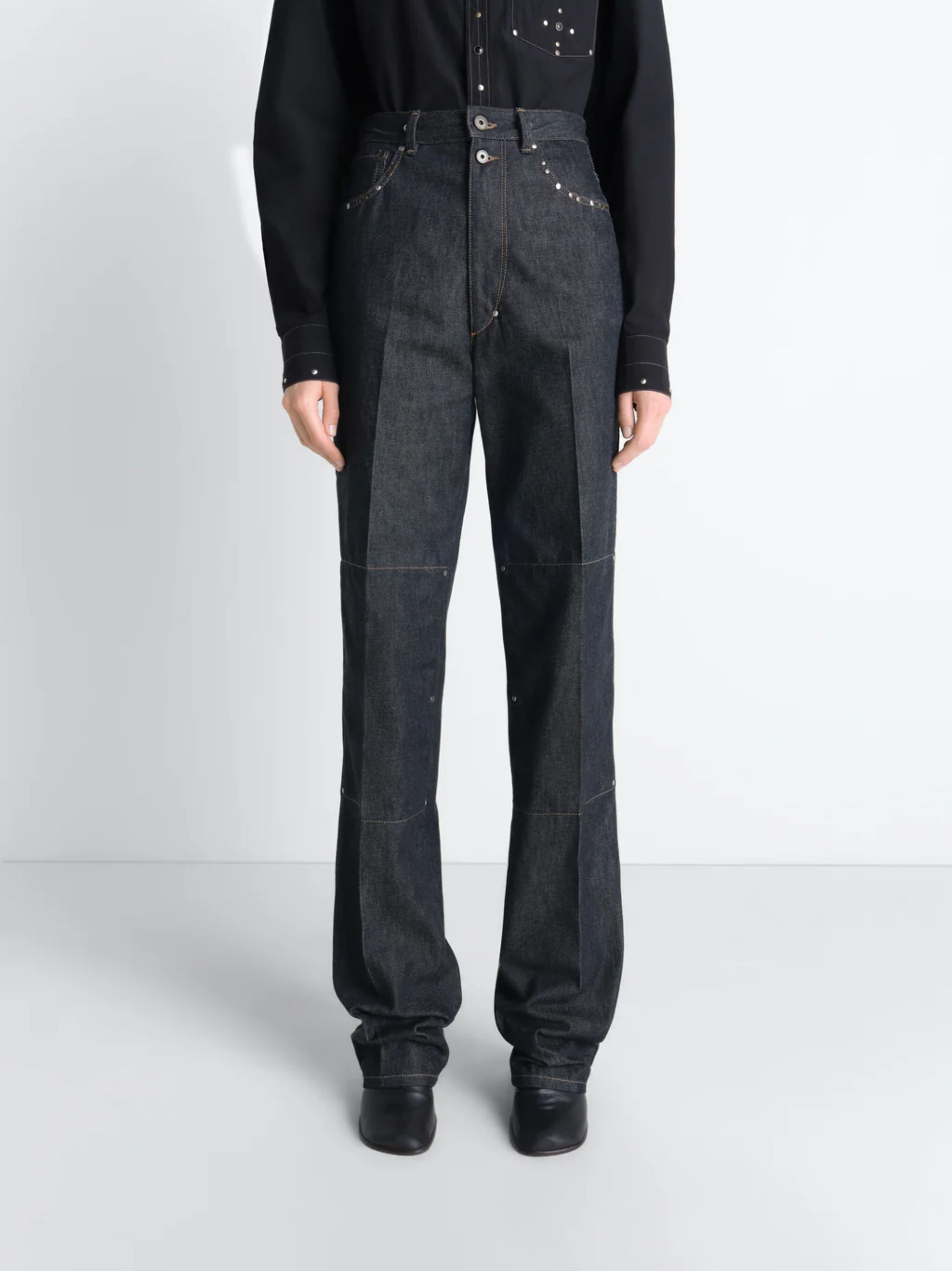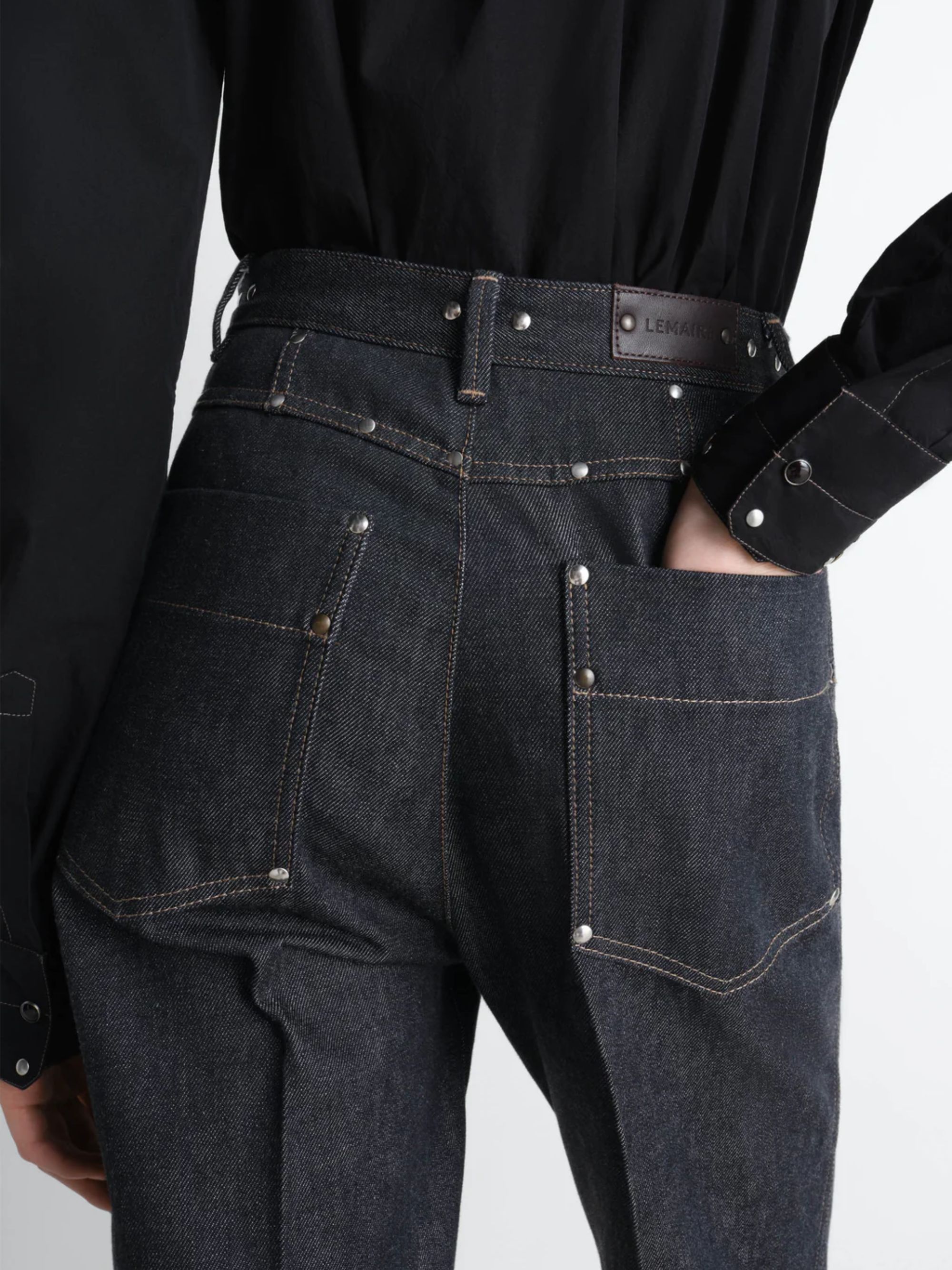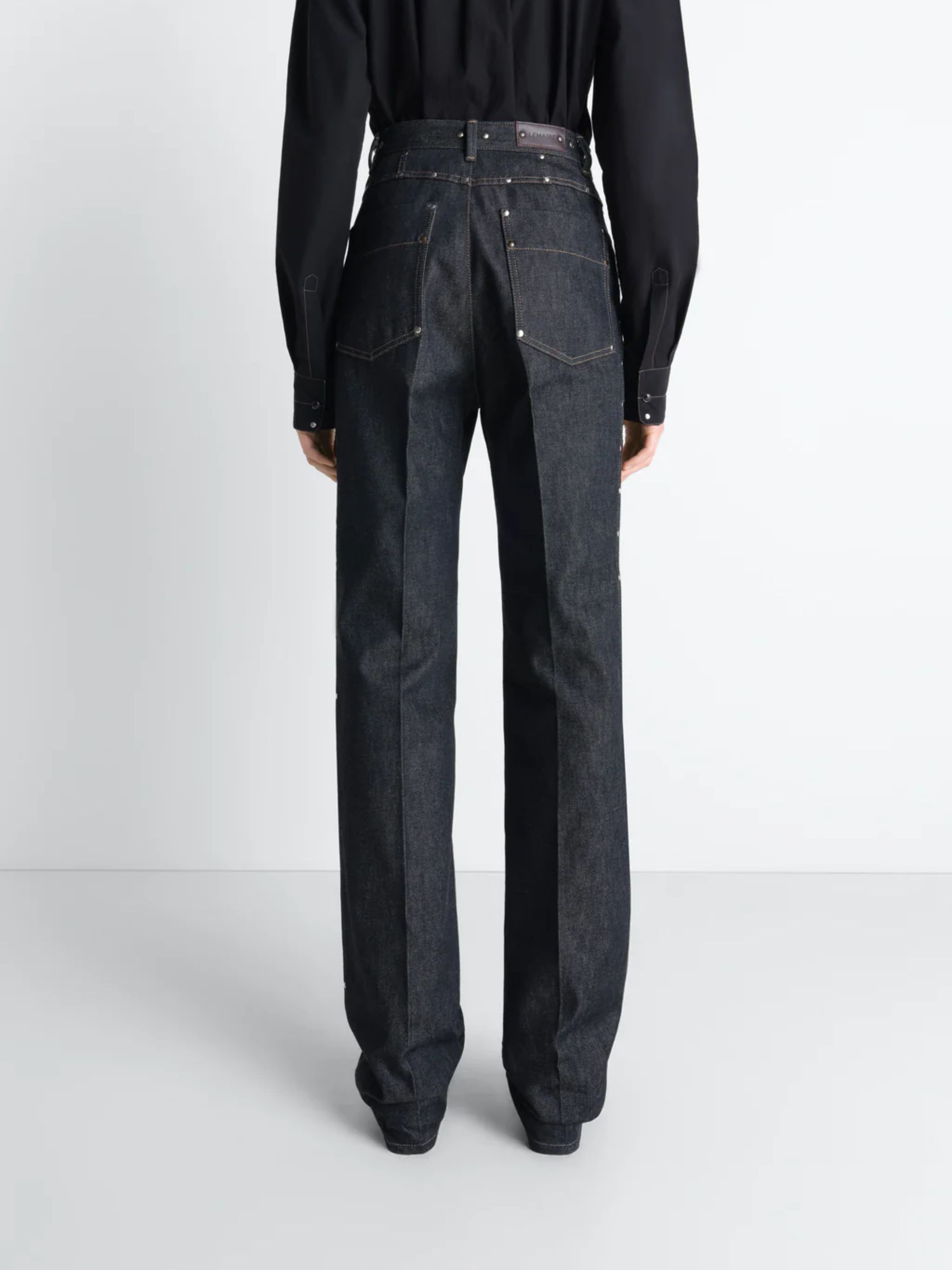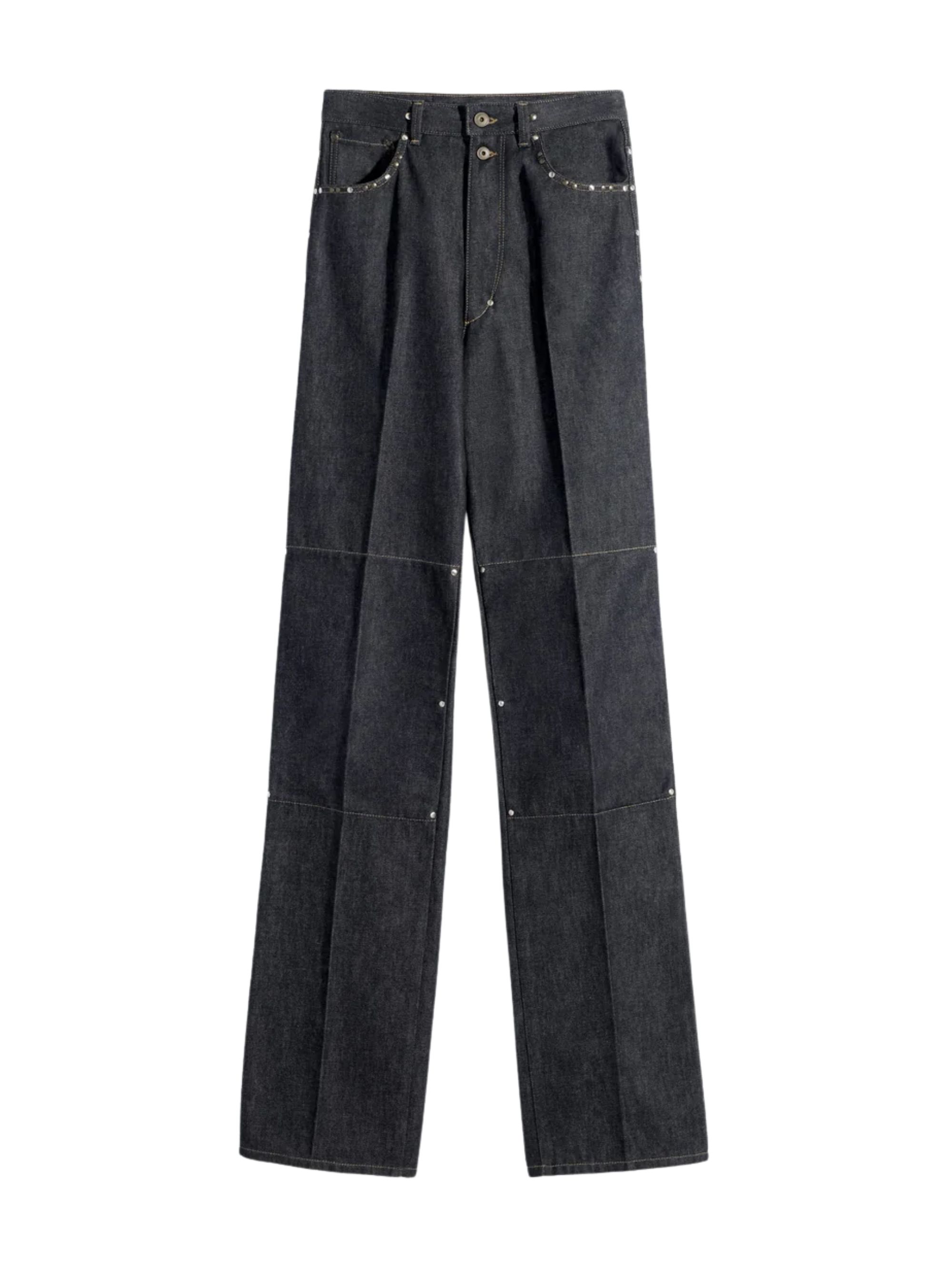 Pantalone con borchie di LEMAIRE blu in denim, caratterizzato da vita alta, taglio dritto, due bottoni metallici in vita, tasche anteriori con rivetti, taschino portamonete, tasche posteriori spplicate e etichetta con logo.