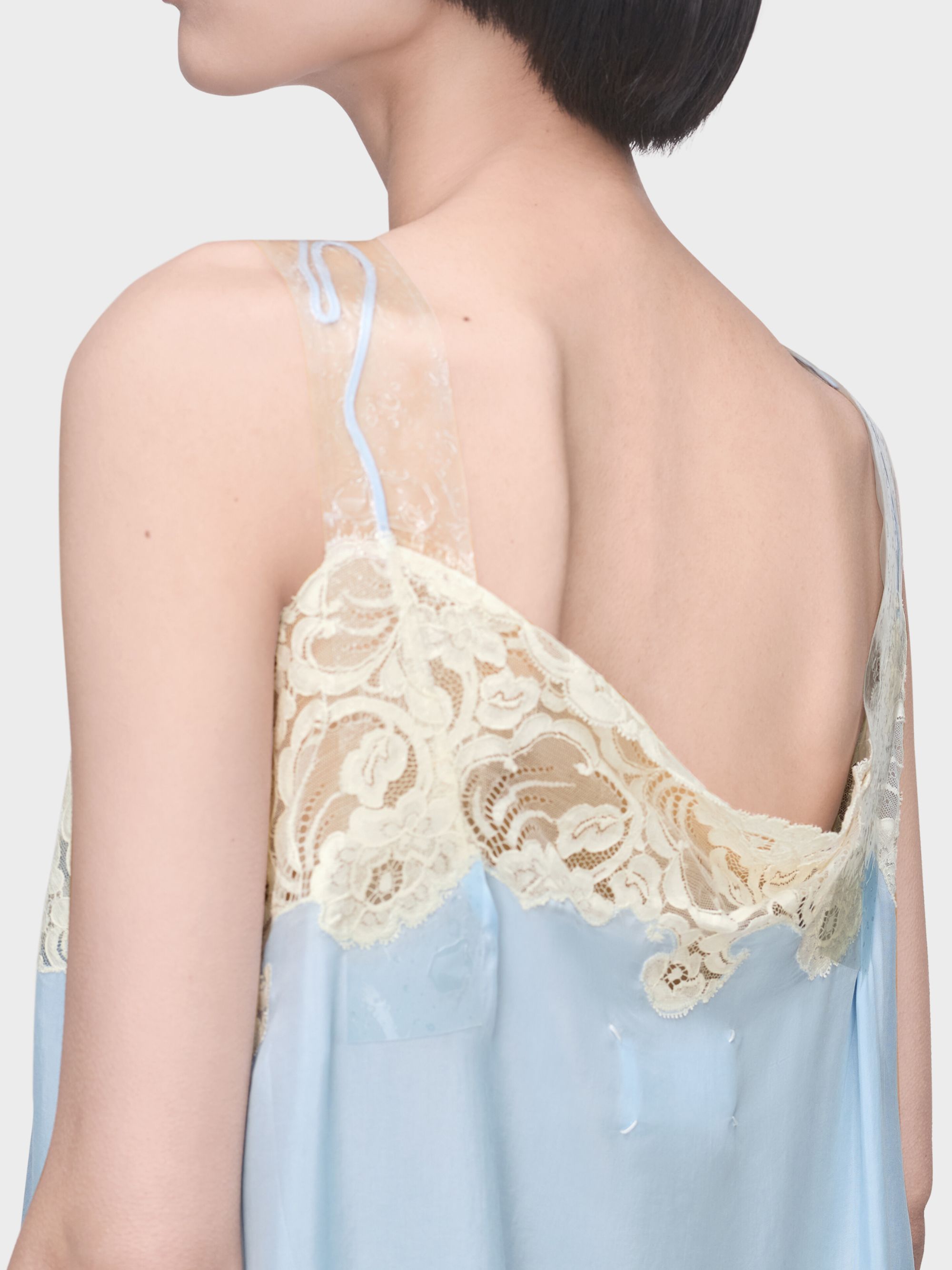 Abito sottoveste taped di MAISON MARGIELA azzurro in cupro, caratterizzato da lunghezza mini, senza maniche, scollo a V, aperto sulla schiena, impunture iconiche sulla schiena e dettagli con nastro trasparente e pizzo.