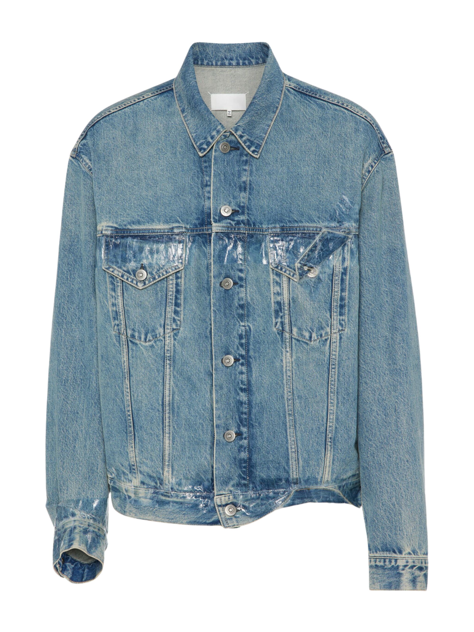 Giacca Taped di MAISON MARGIELA azzurro in denim di cotone con effetto dipinto a mano sul petto e sulla parte anteriore, colletto, quattro punti sul retro e chiusura con bottoni.