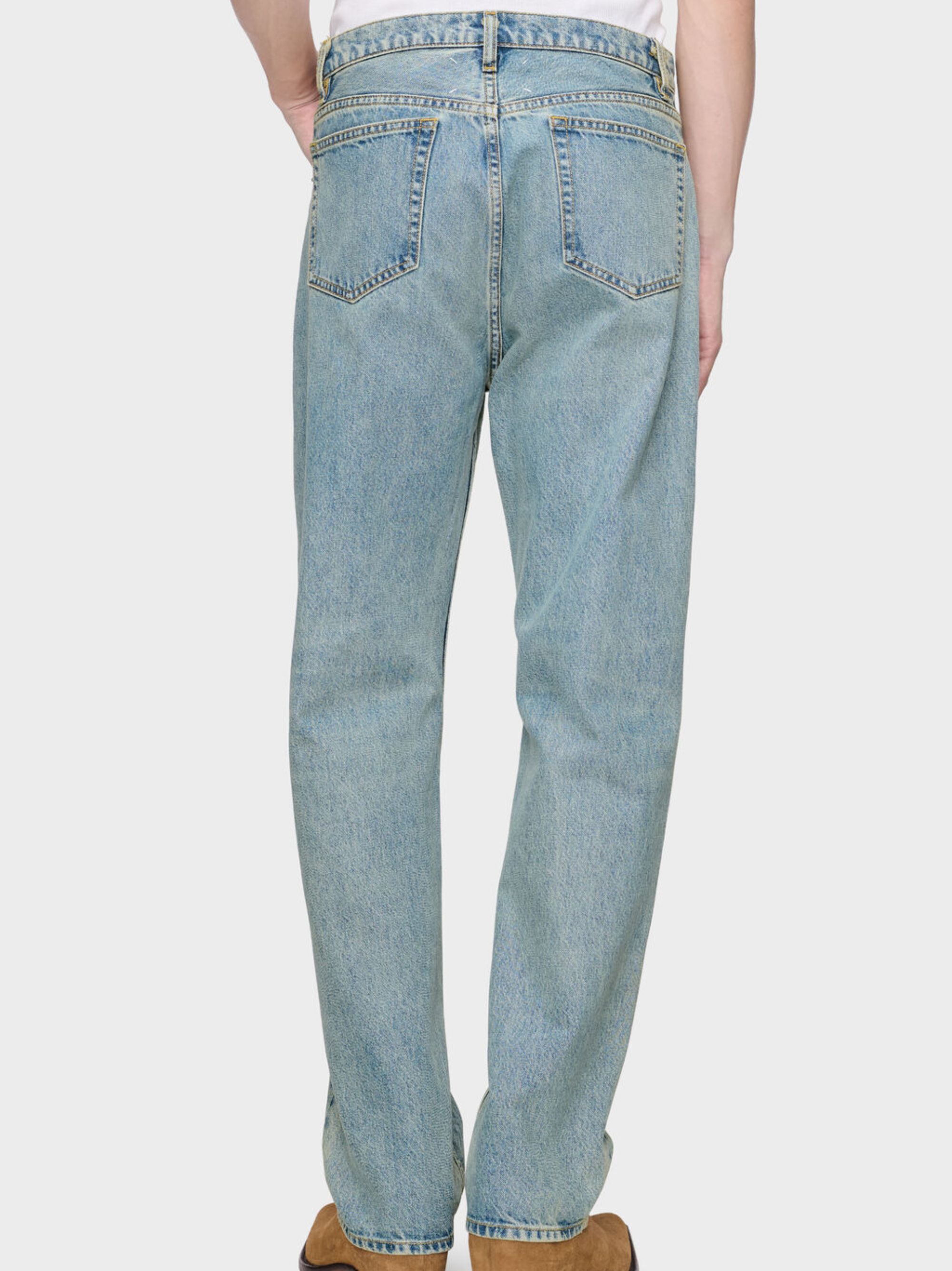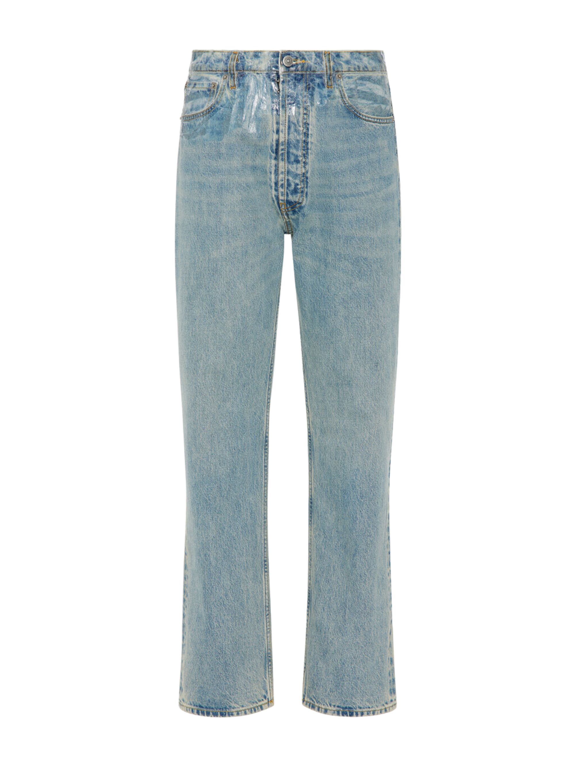 Jeans a gamba dritta taped di MAISON MARGIELA azzurro in denim di cotone caratterizzato da nastro adesivo trasparente, taglio a cinque tasche, passanti per cintura e chiusura con bottone.