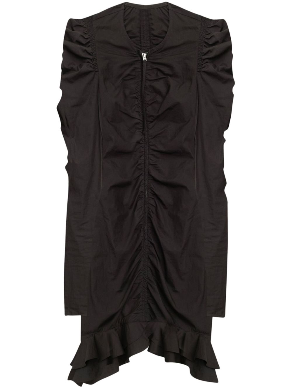 Abito Briali di MARANT ETOILE nero in cotone biologico con scollo a V, design drappeggiato, orlo increspato e asimmetrico, lunghezza sopra il ginocchio, maniche lunghe drappeggiate e chiusura frontale con zip.