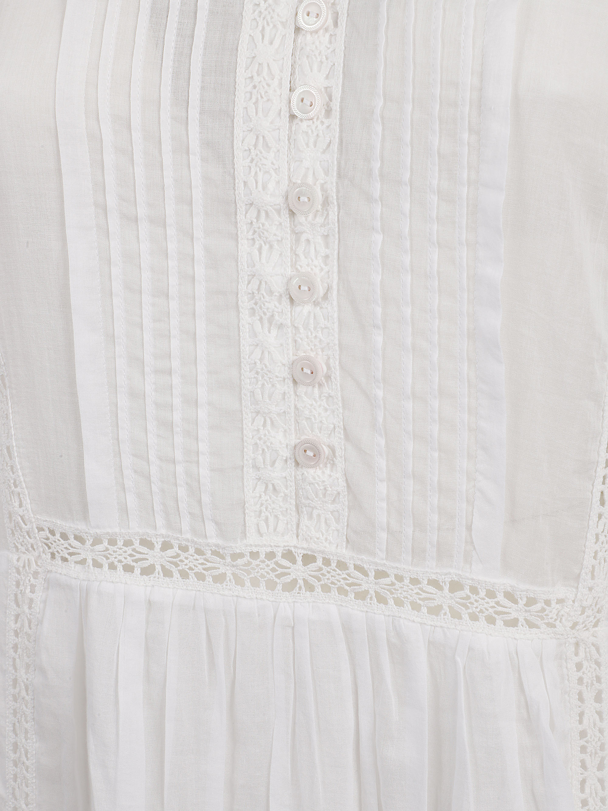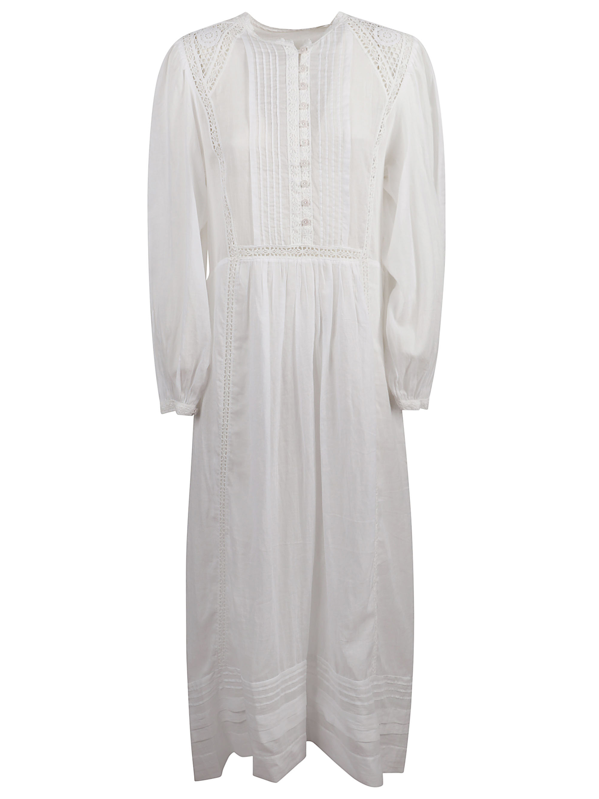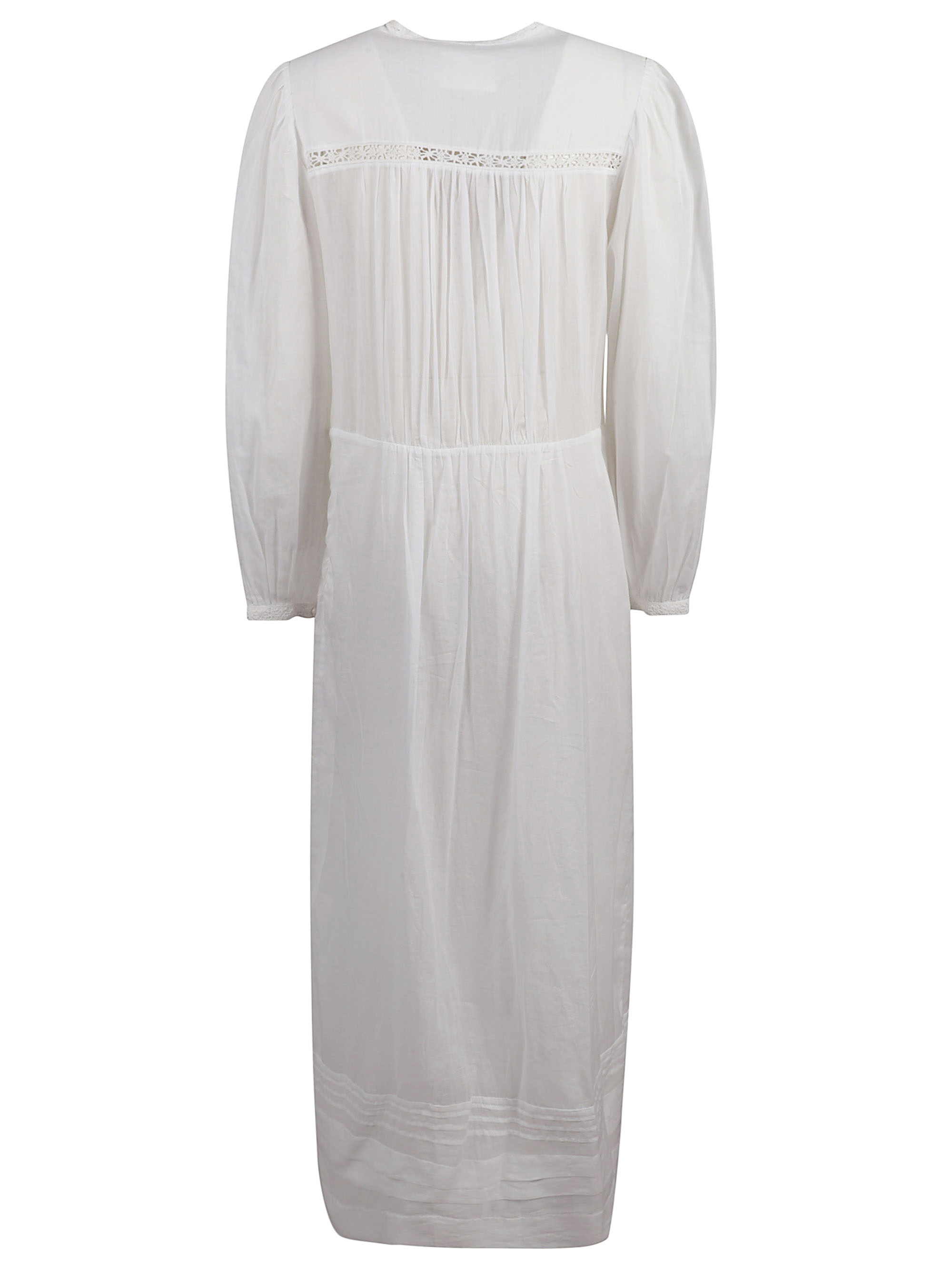 Abito bianco di MARANT ETOILE caratterizzato da ricami in pizzo, maniche lunghe, tasche laterali e scollo a v.