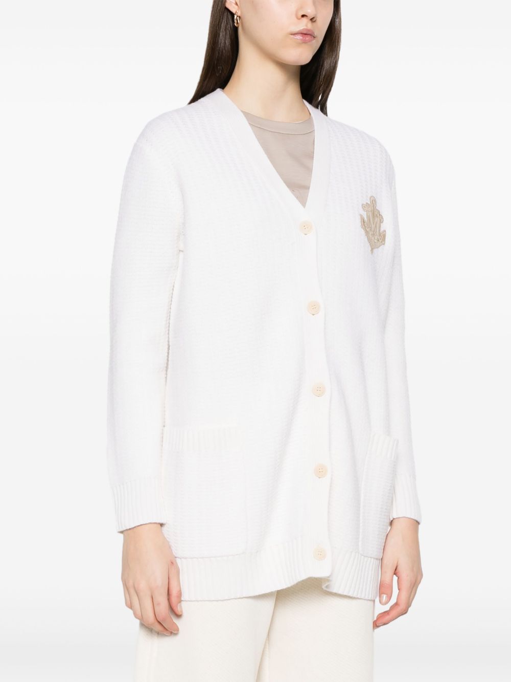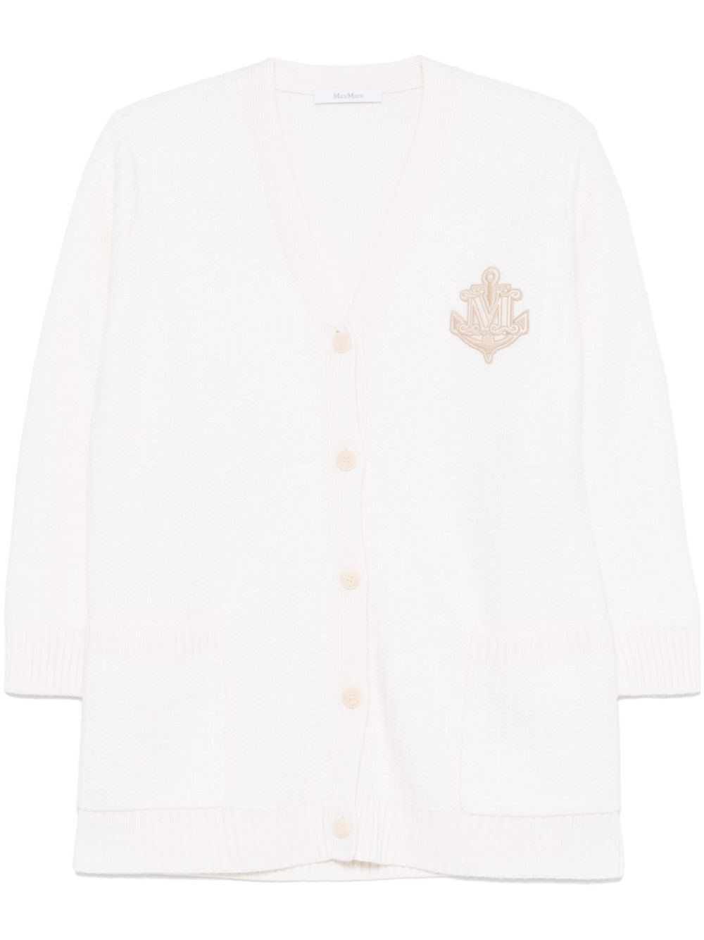 Cardigan bianco di MAX MARA caratterizzato da logo sul petto, scollo a v, maniche lunghe e chiusura con bottoni.