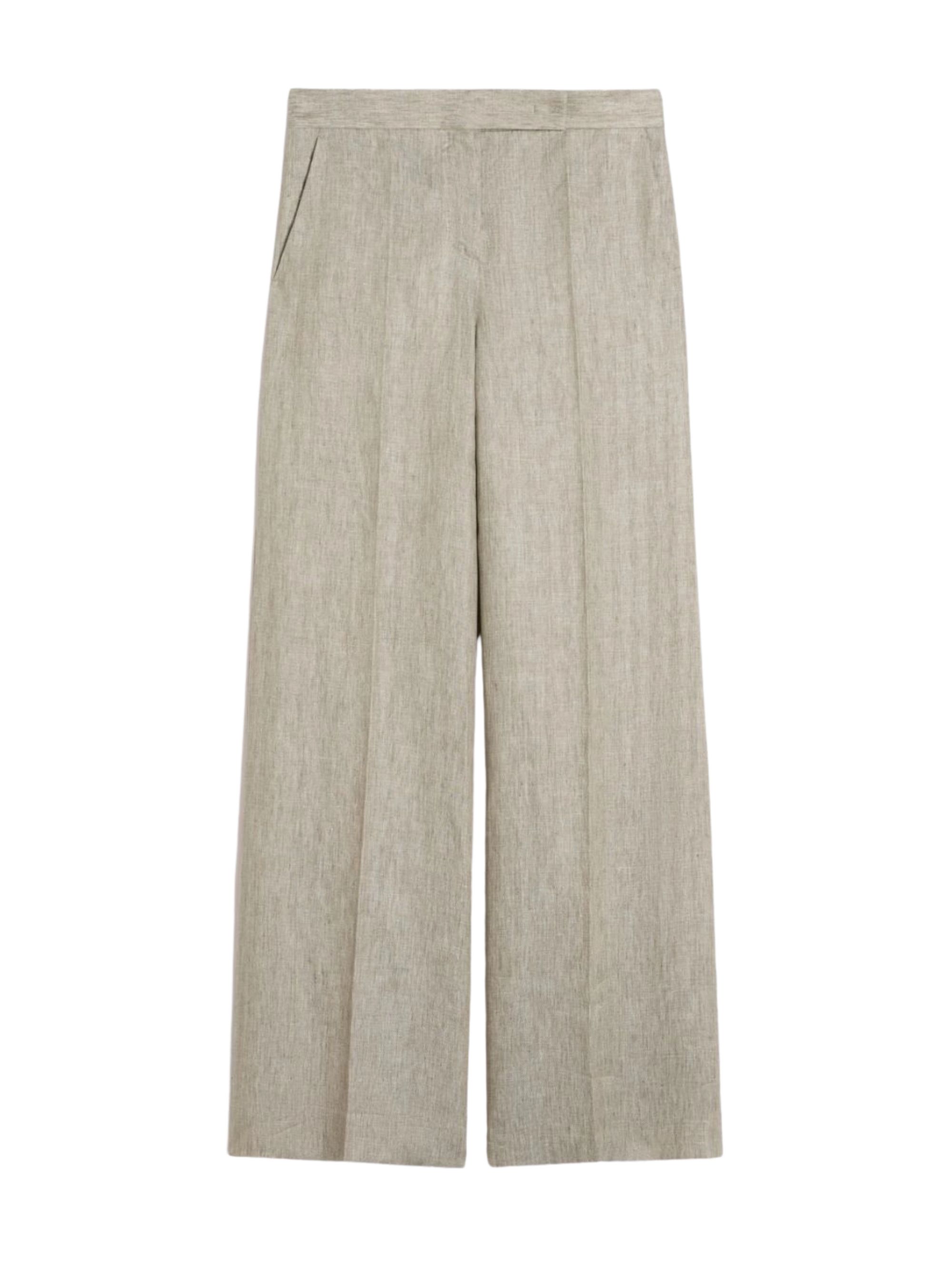Pantalone Deserto in lino di MAX MARA beige, lavorazione Chevron a gamba larga con chiusura a listino alto in vita, patta e gancetto. Tasche alla francese sui fianchi.