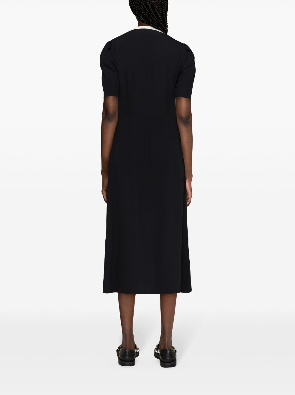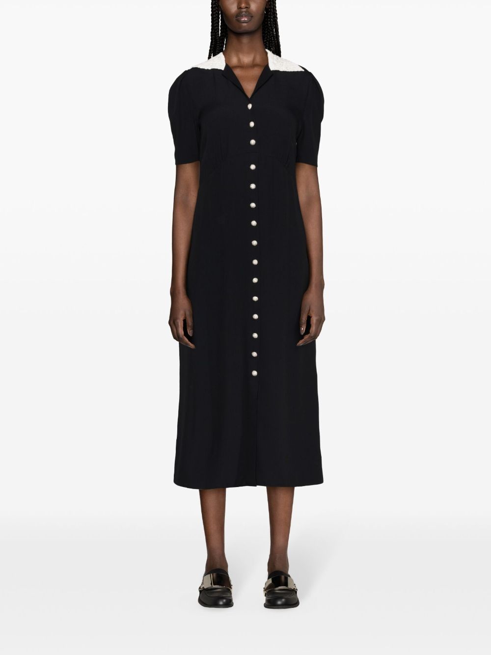 Abito con logo di MIU MIU colore nero, caratterizzato da chiusura frontale a bottoni, maniche corte, dettaglio in maglia bianca.