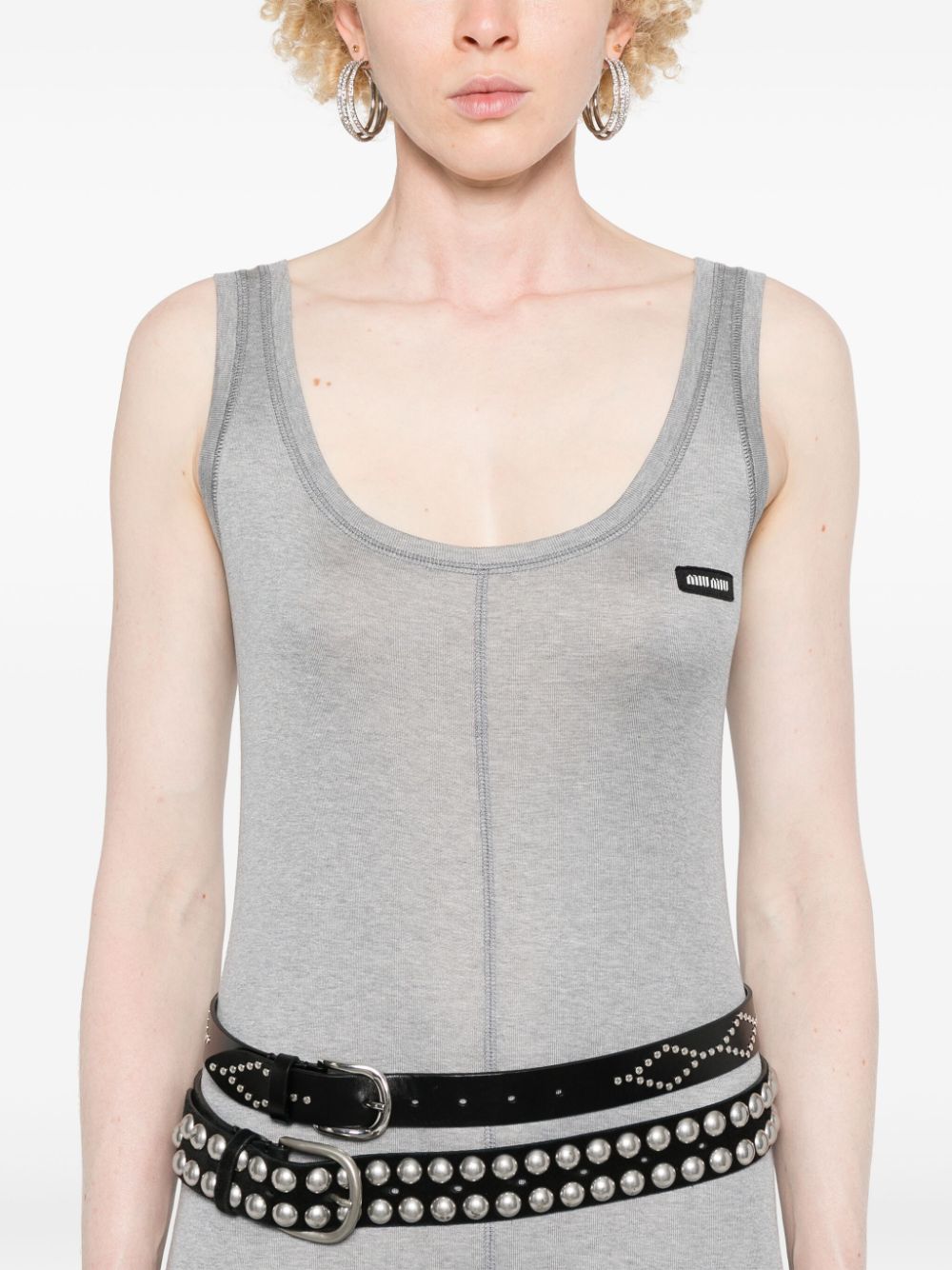 Abito midi di MIU MIU grigio senza maniche con cucitura centrale e patch logo lato cuore.