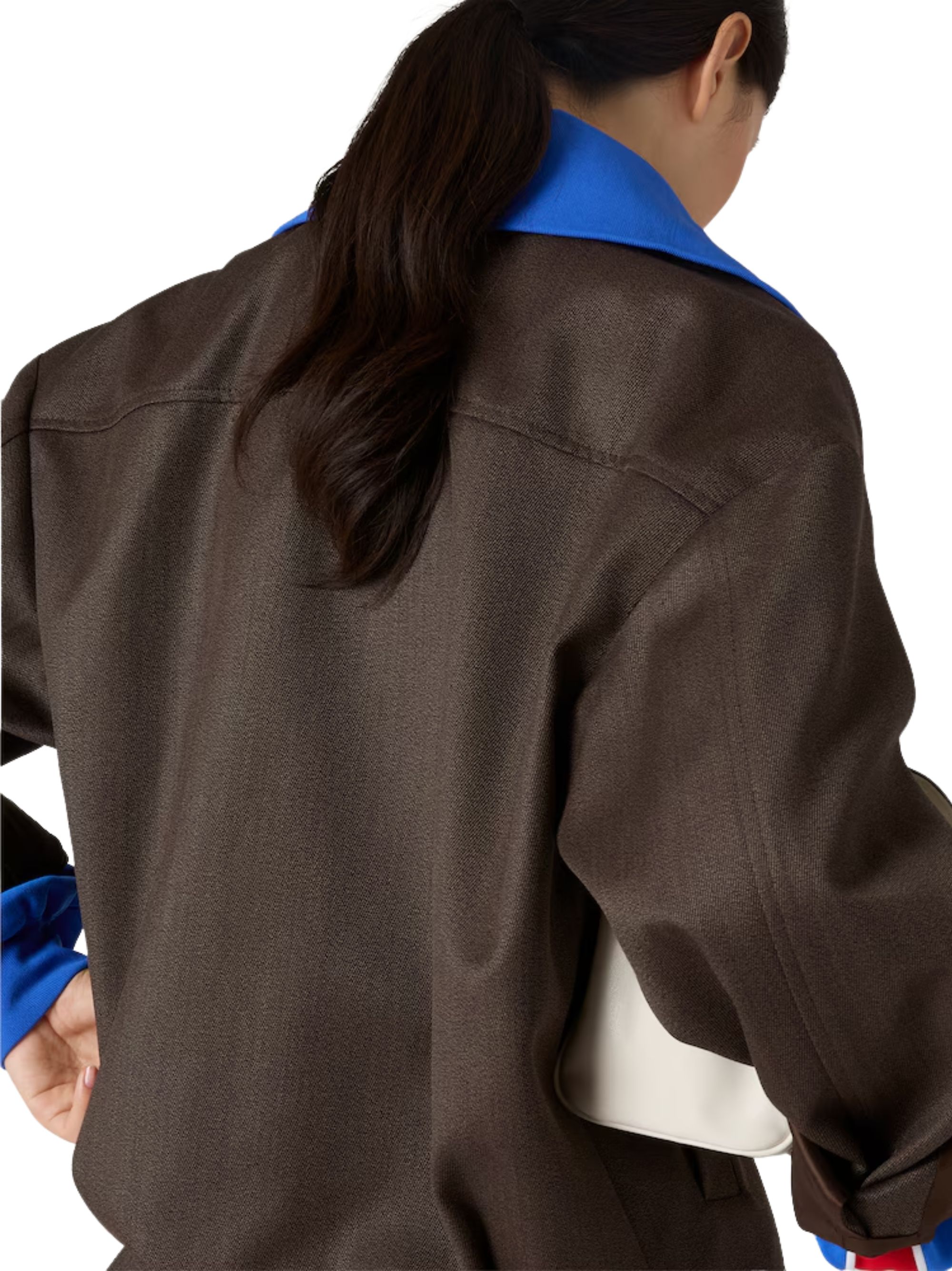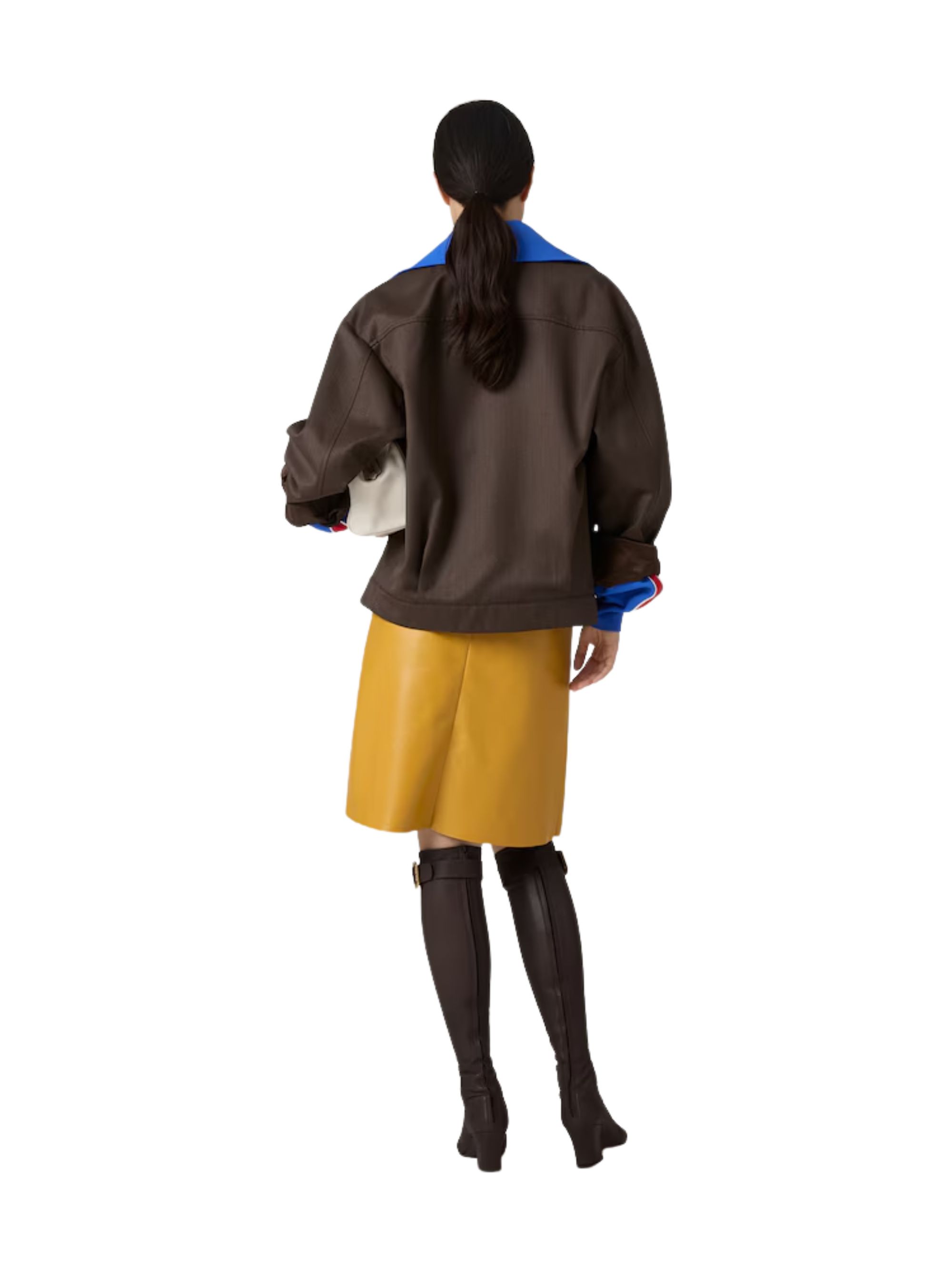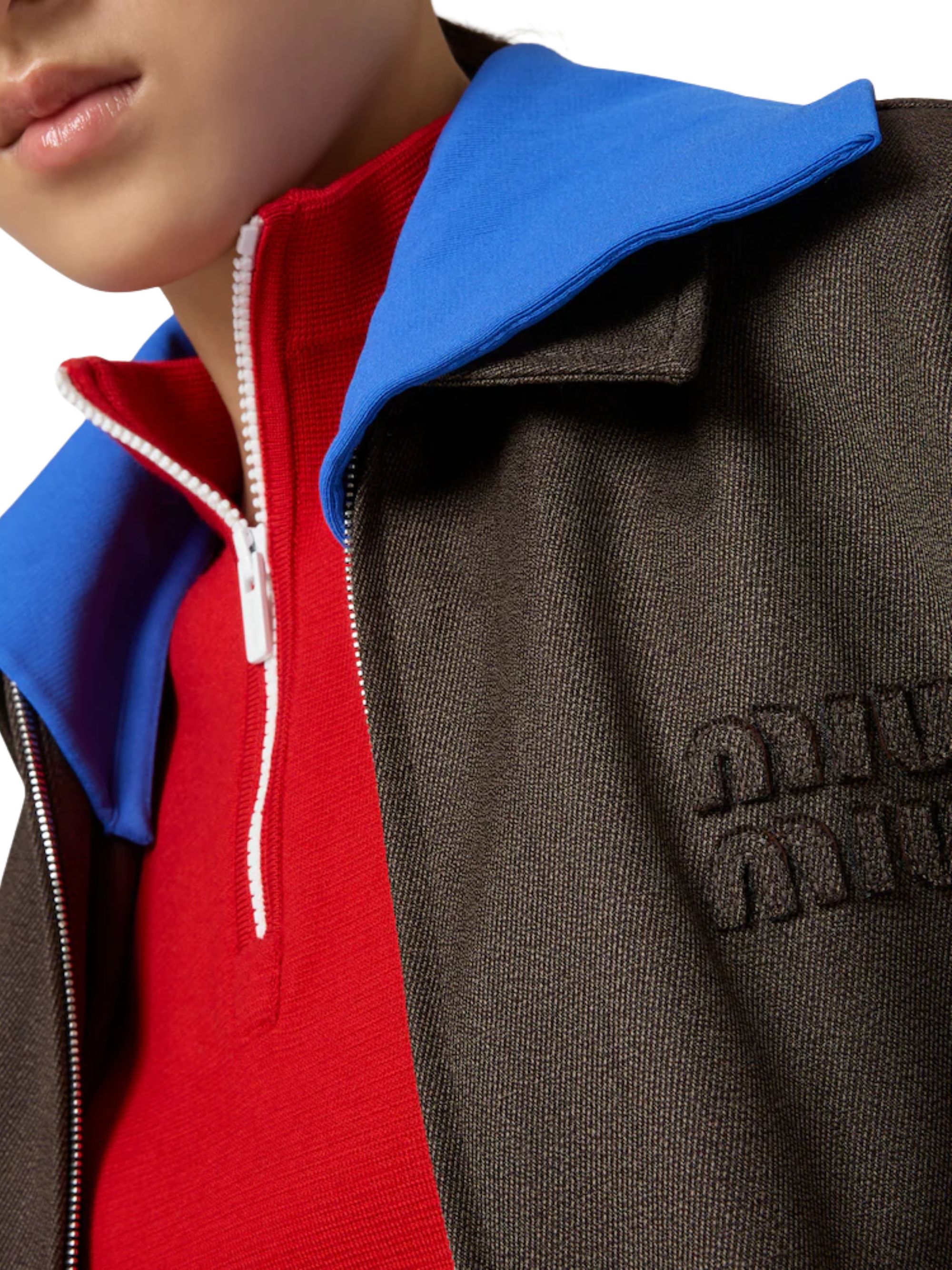 Blouson in tessuto cover di MIU MIU marrone e blu, caratterizzato da chisura con zip, tasche a filetto, polsini e colletto a contrasto in maglia e logo sul petto.
