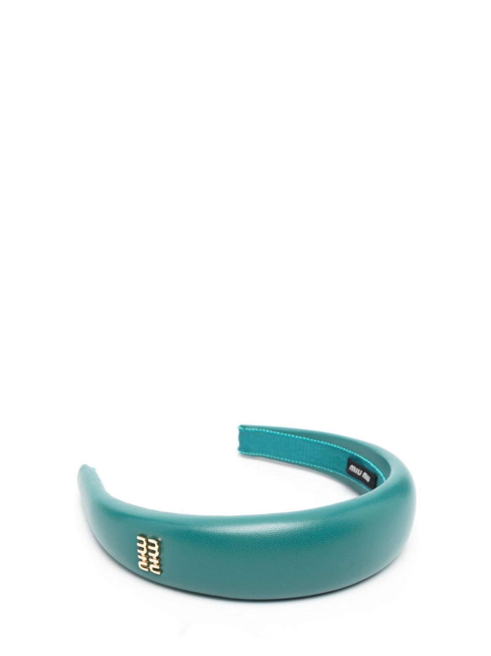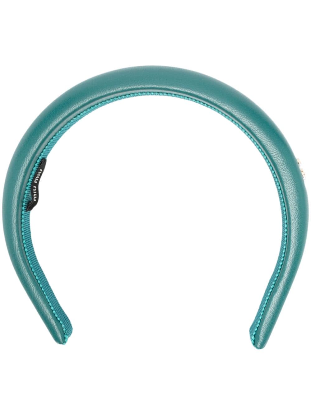 Cerchietto di MIU MIU color ottanio caratterizzato dal design imbottito e placca logo metallico laterale.