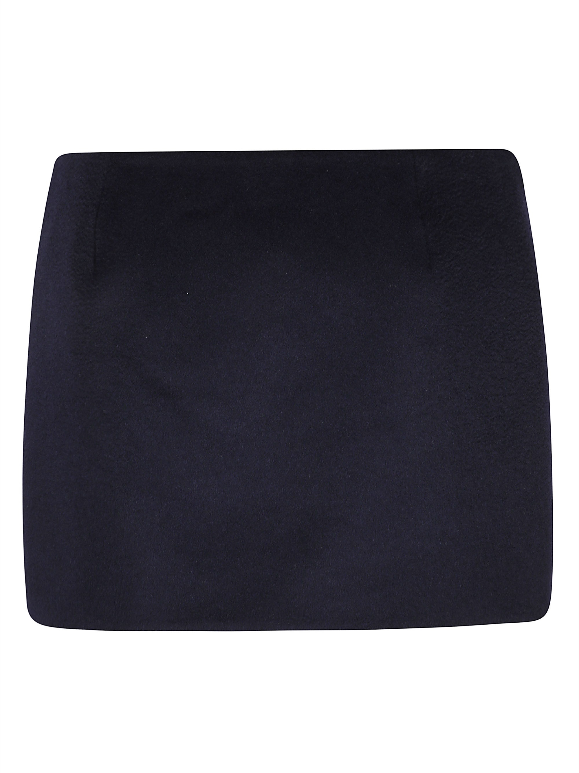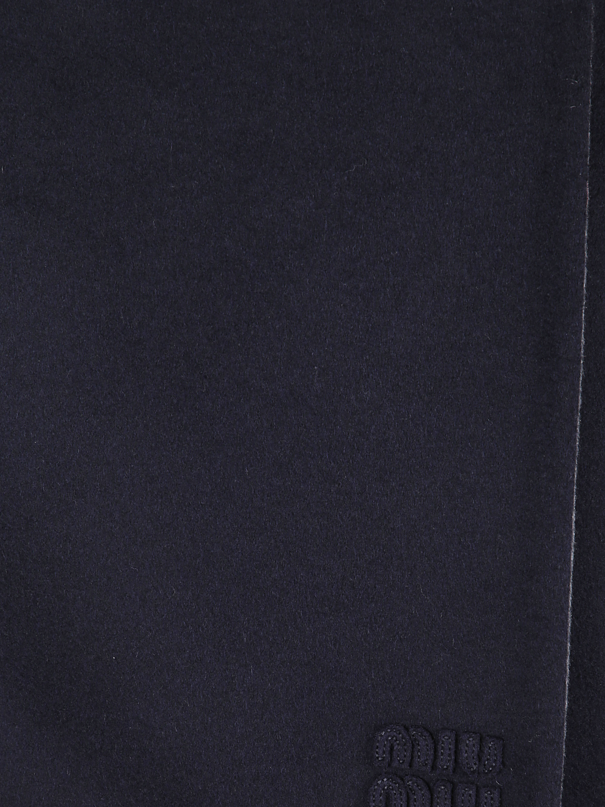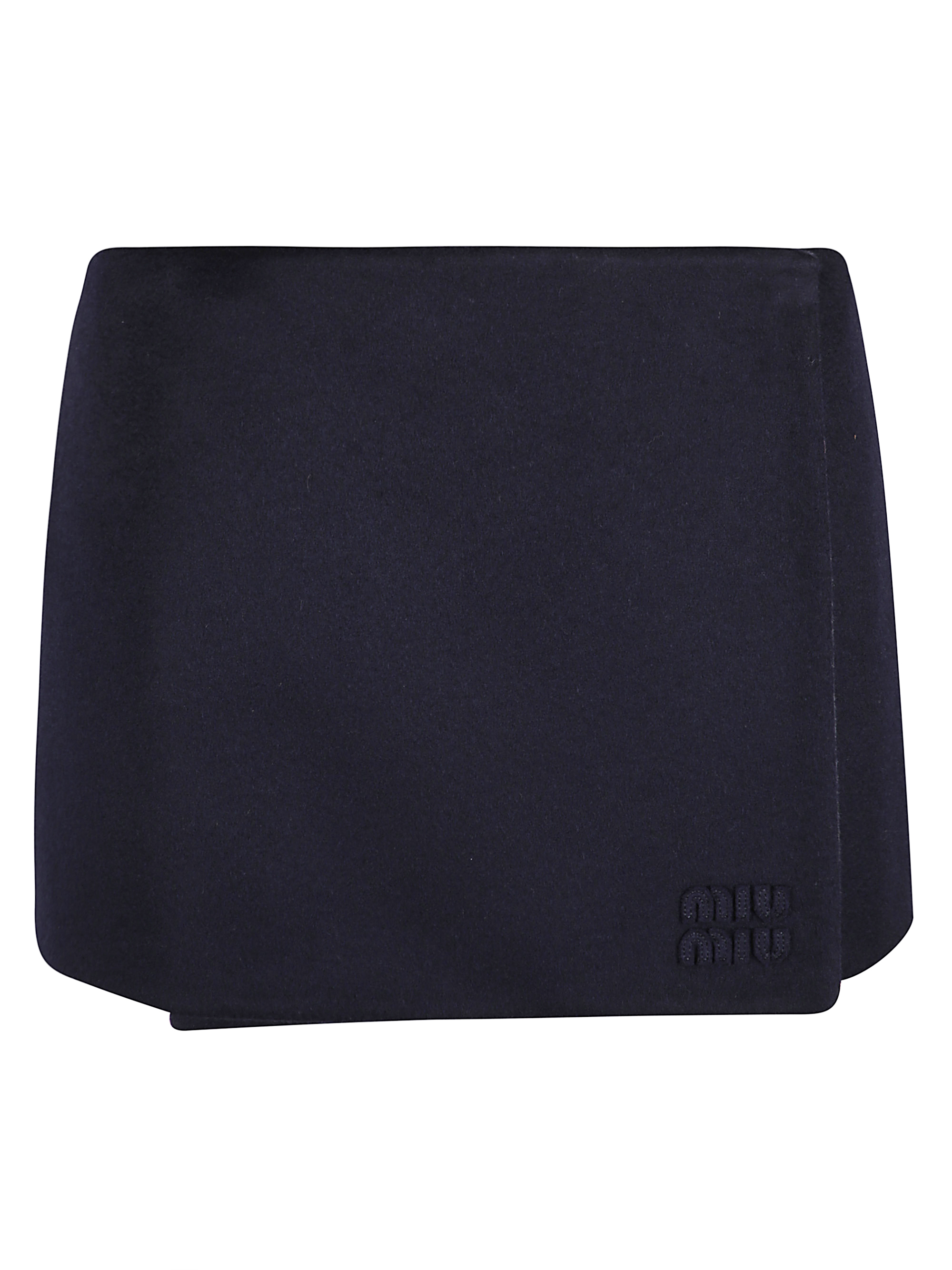 Minigonna con logo di MIU MIU blu in flanella con logo impresso sul davanti .