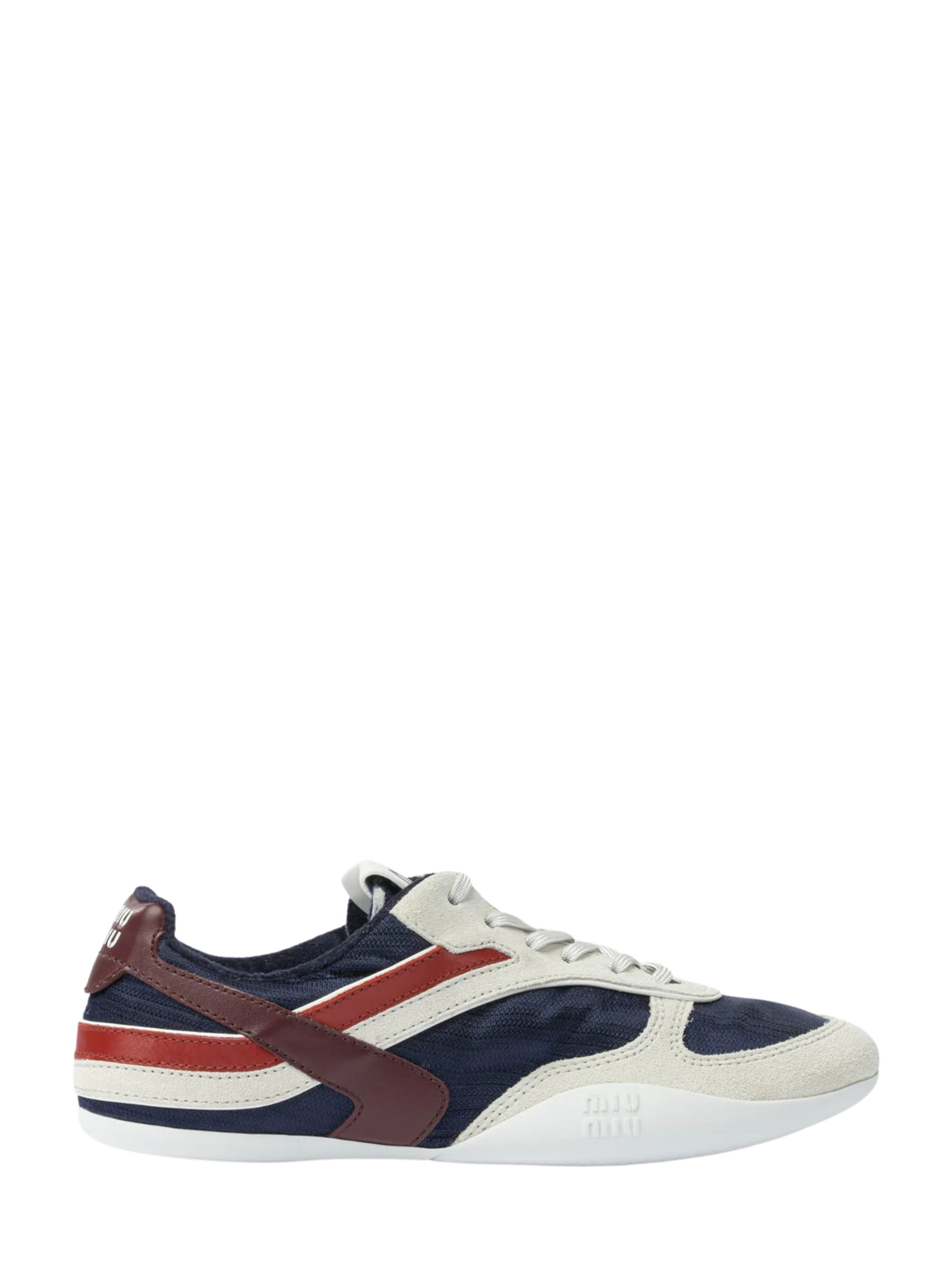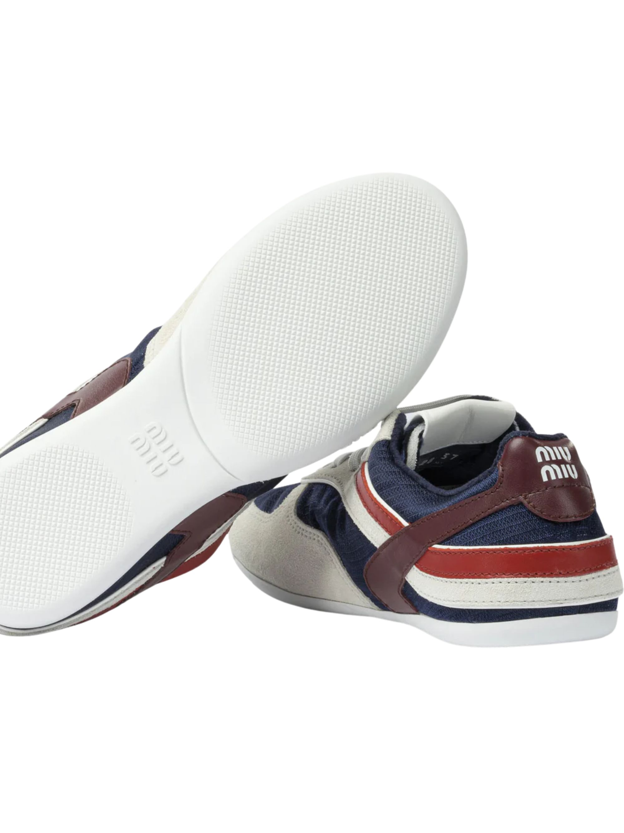 Sneaker Gymnasium di MIU MIU multicolor in pelle e tessuto, caratterizzata da chiusura frontale con lacci, suola piatta in gomma, rinforzo sul tallone a contrasto con logo e soletta con logo.