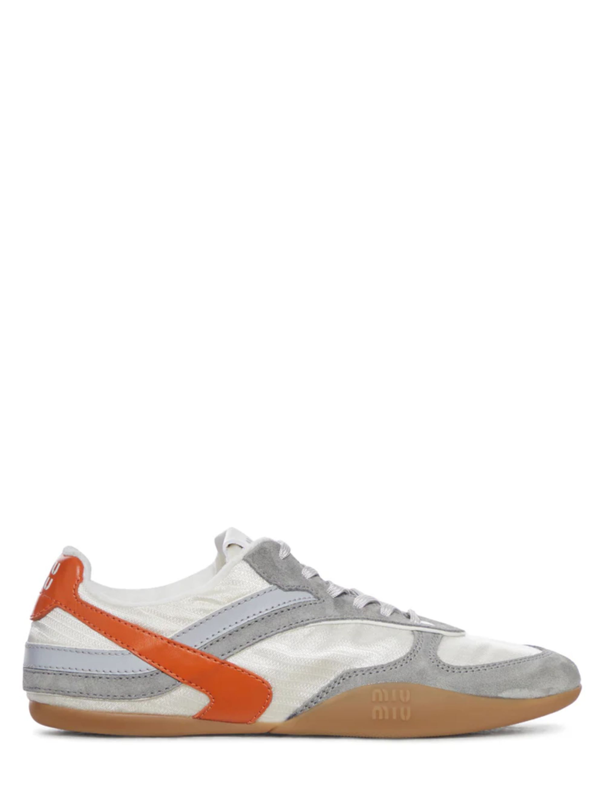 Sneaker Gymnasium di MIU MIU arancione in pelle, caratterizzata da chiusura con lacci, suola in gomma con logo e logo serigrafato su linguetta, dietrino e sottopiede.