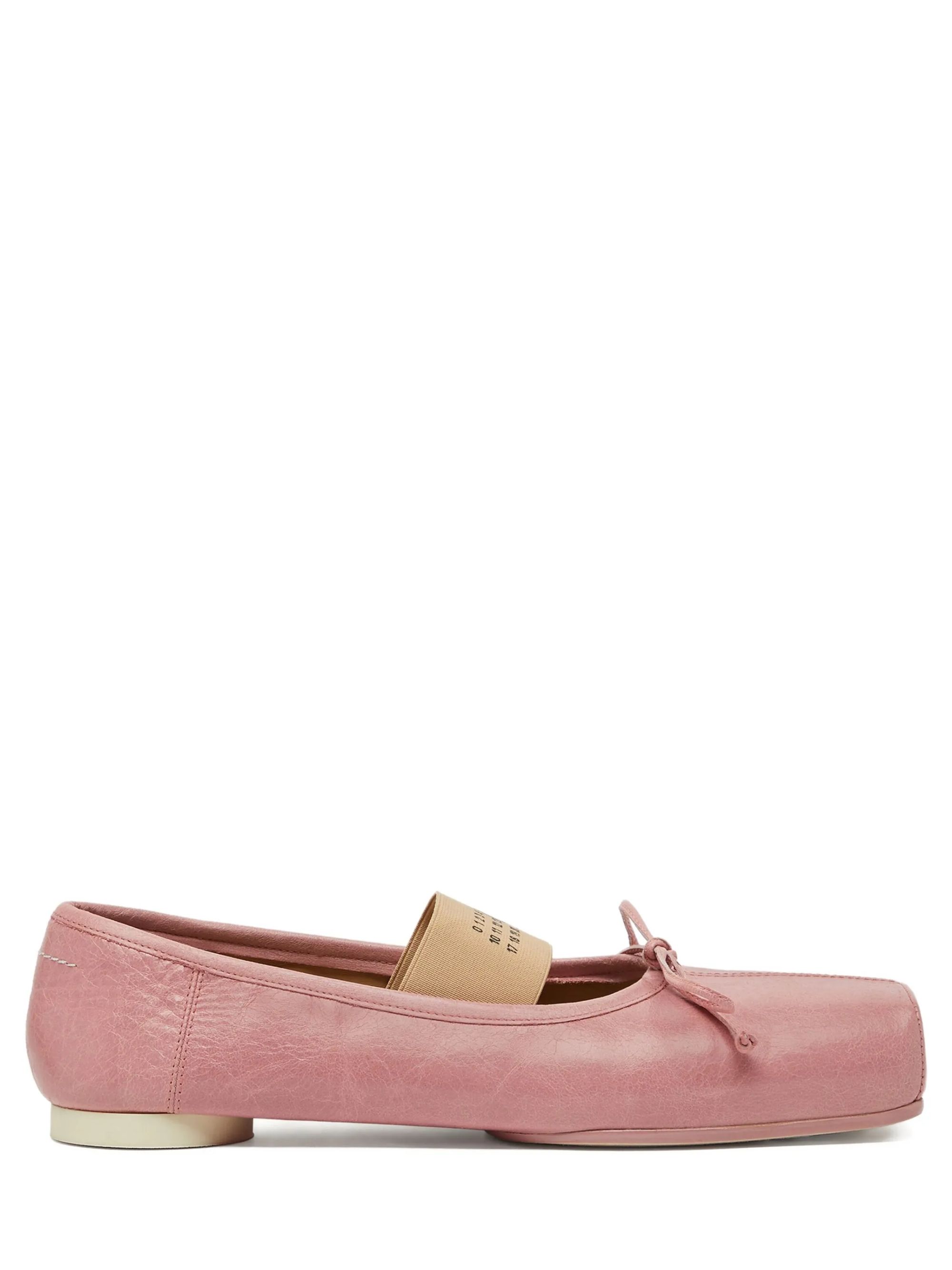 Ballerina a punta quadrata di MM6 rosa in pelle, caratterizzata da estremità quadrata, dettaglio del nodo, suola piatta e fascia con logo.