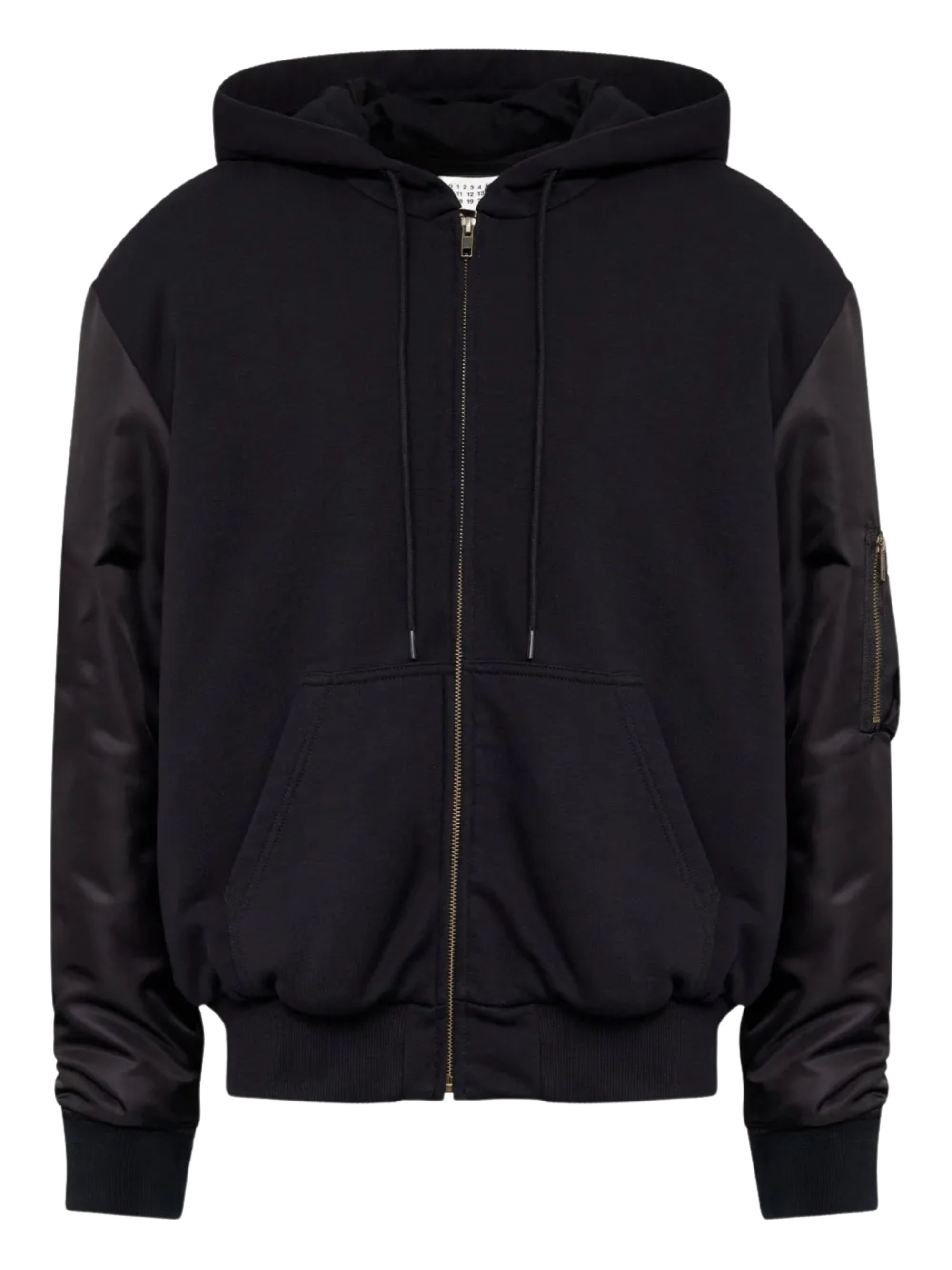 Giacca con cappuccio di MM6 nera in cotone, caratterizzata da cappuccio con coulisse, chiusura con zip, tasche anteriori e tasca con zip sulla manica.