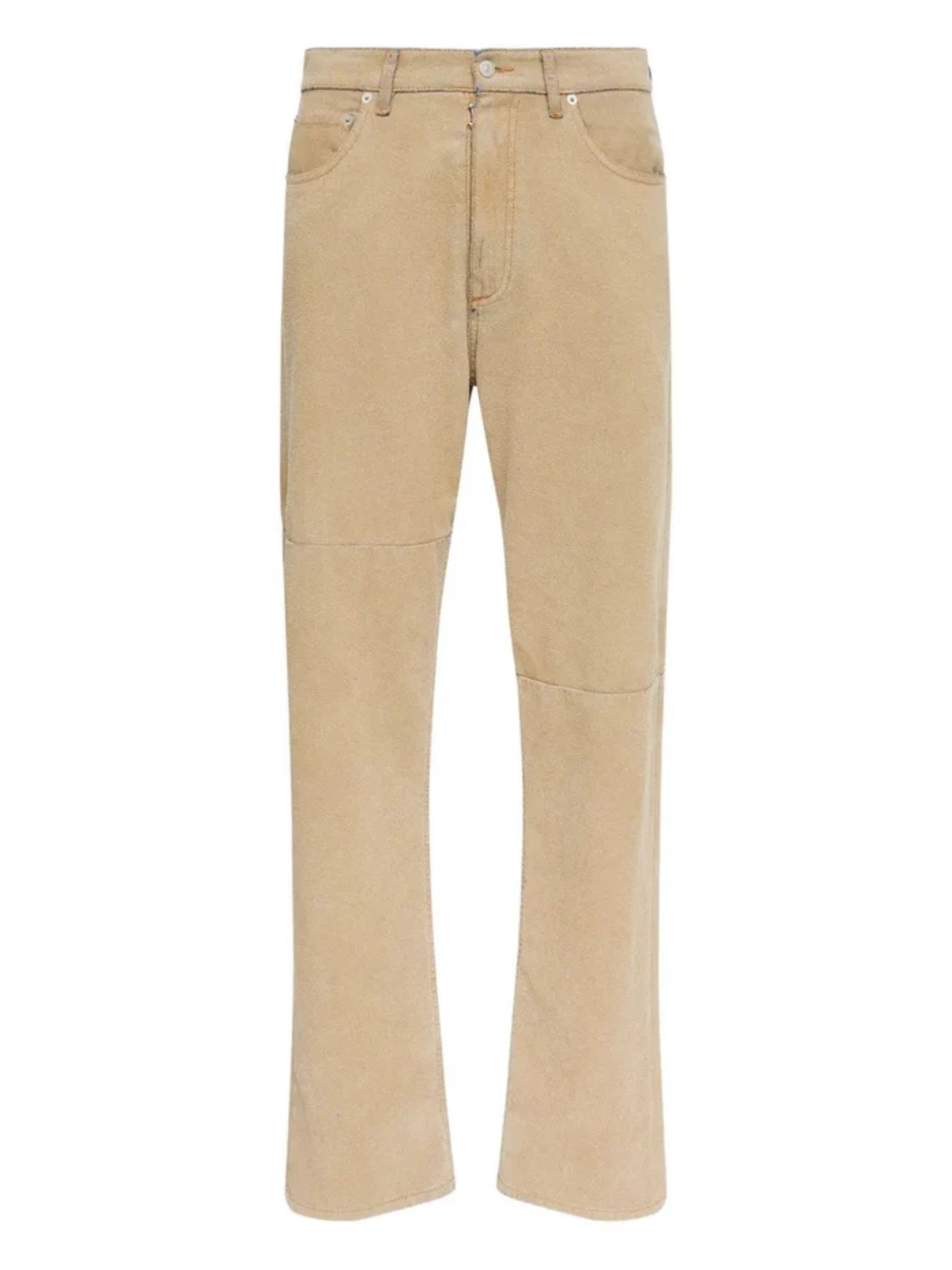 Jeans a gamba dritta di MM6 beige in cotone, caratterizzato da dettaglio cucitura visibile al ginocchio, costruzione a cinque tasche, chiusura frontale con zip e bottone e impunture bianche della Maison sul retro.