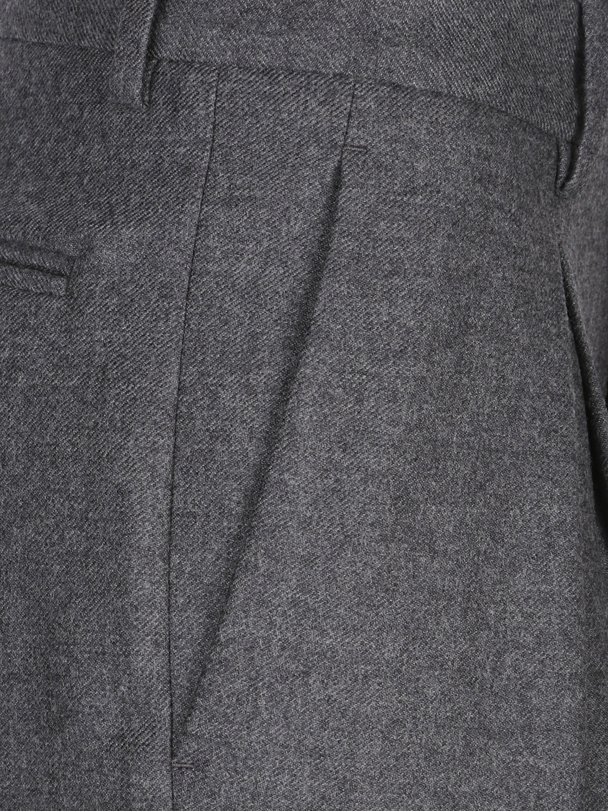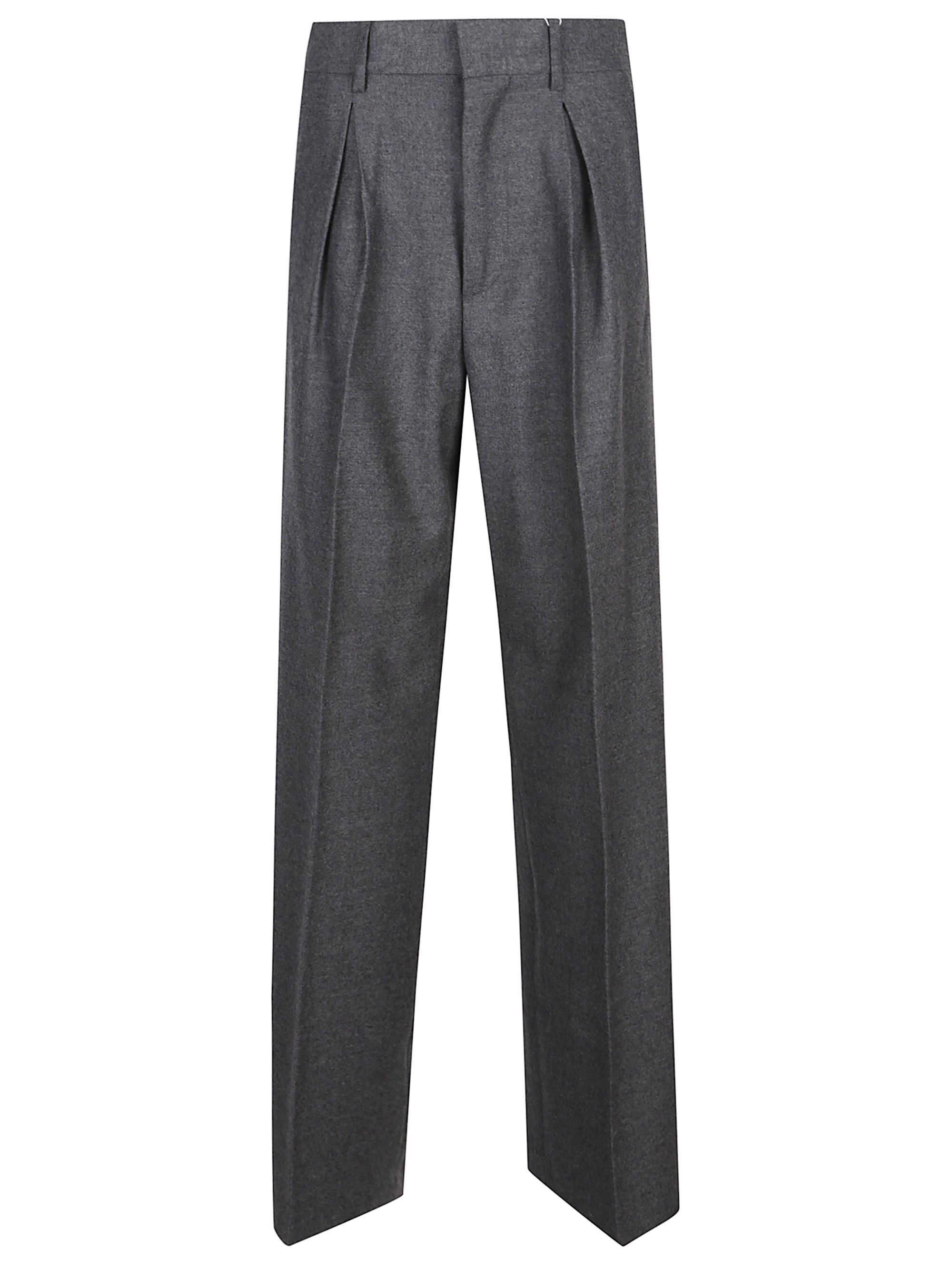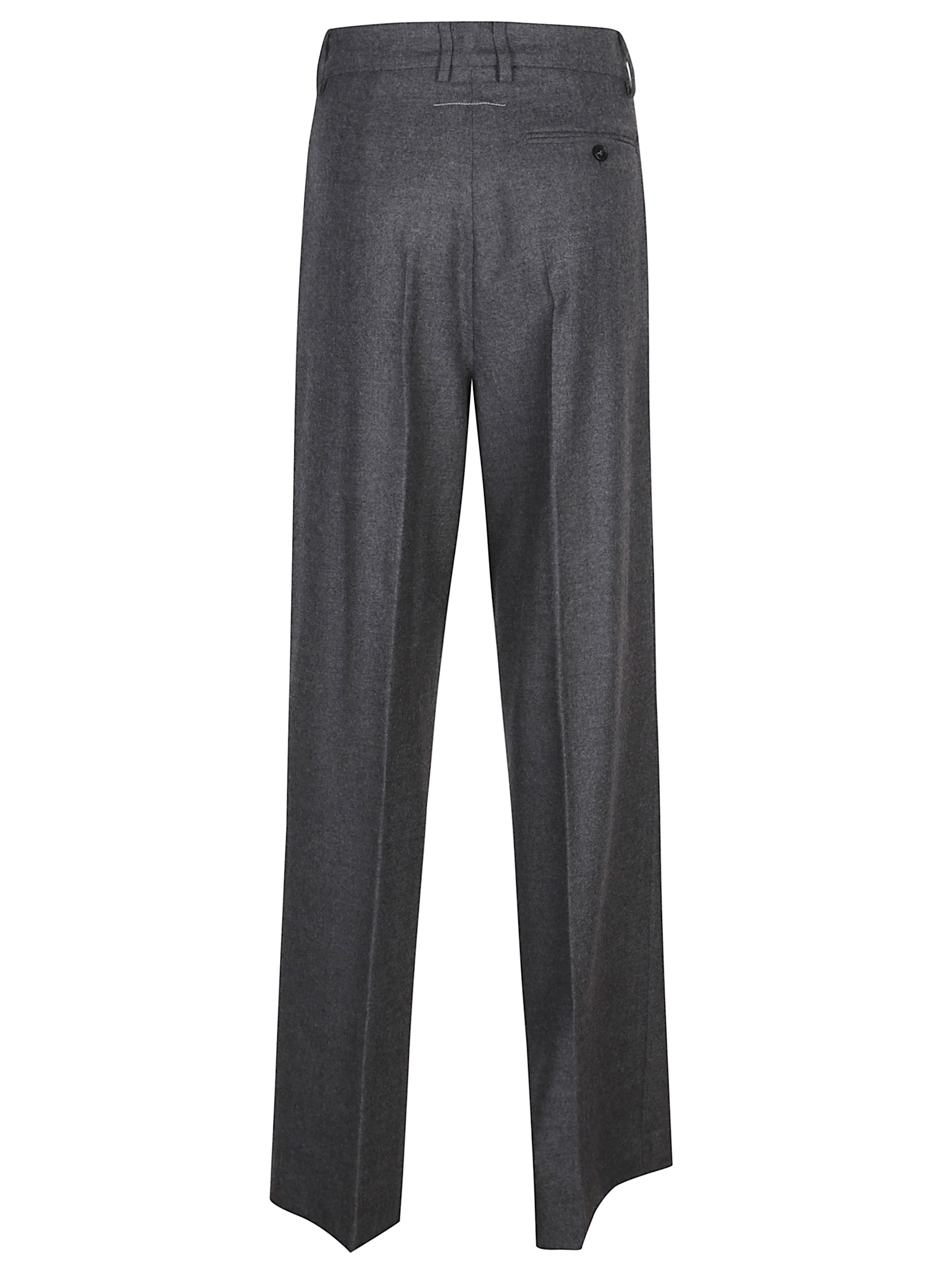 Pantalone lungo di MM6 grigio medio in lana vergine con tasche laterali a filetto, tasca posteriore nascosta con bottoni, pieghe invertite e chiusura con occhiello a zip.