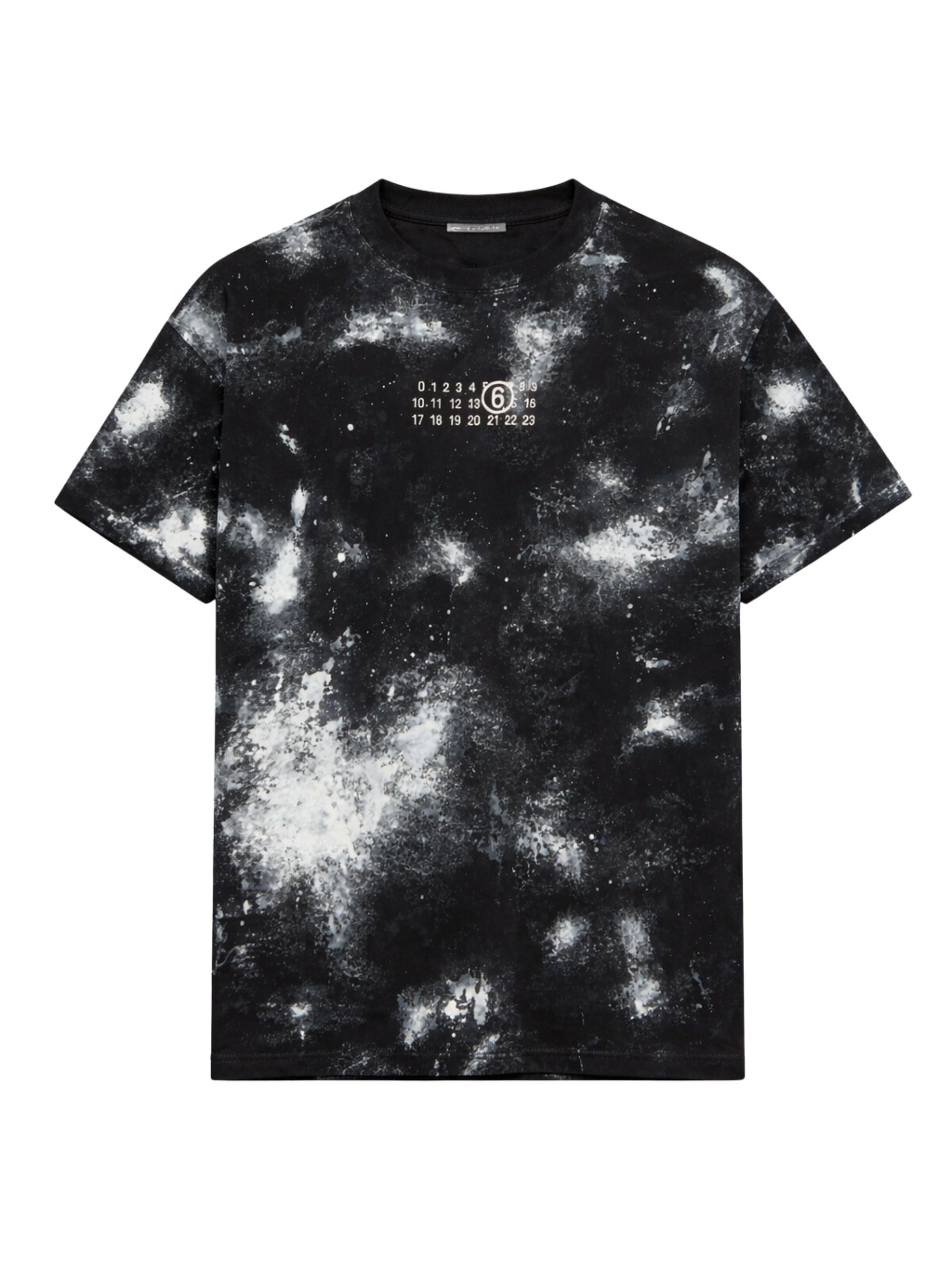 T-shirt Painted di MM6 nera in cotone, caratterizzata da maniche corte, girocollo, applicazione del logo sul davanti, cucitura bianca sul retro e segni di pittura irregolari all-over.