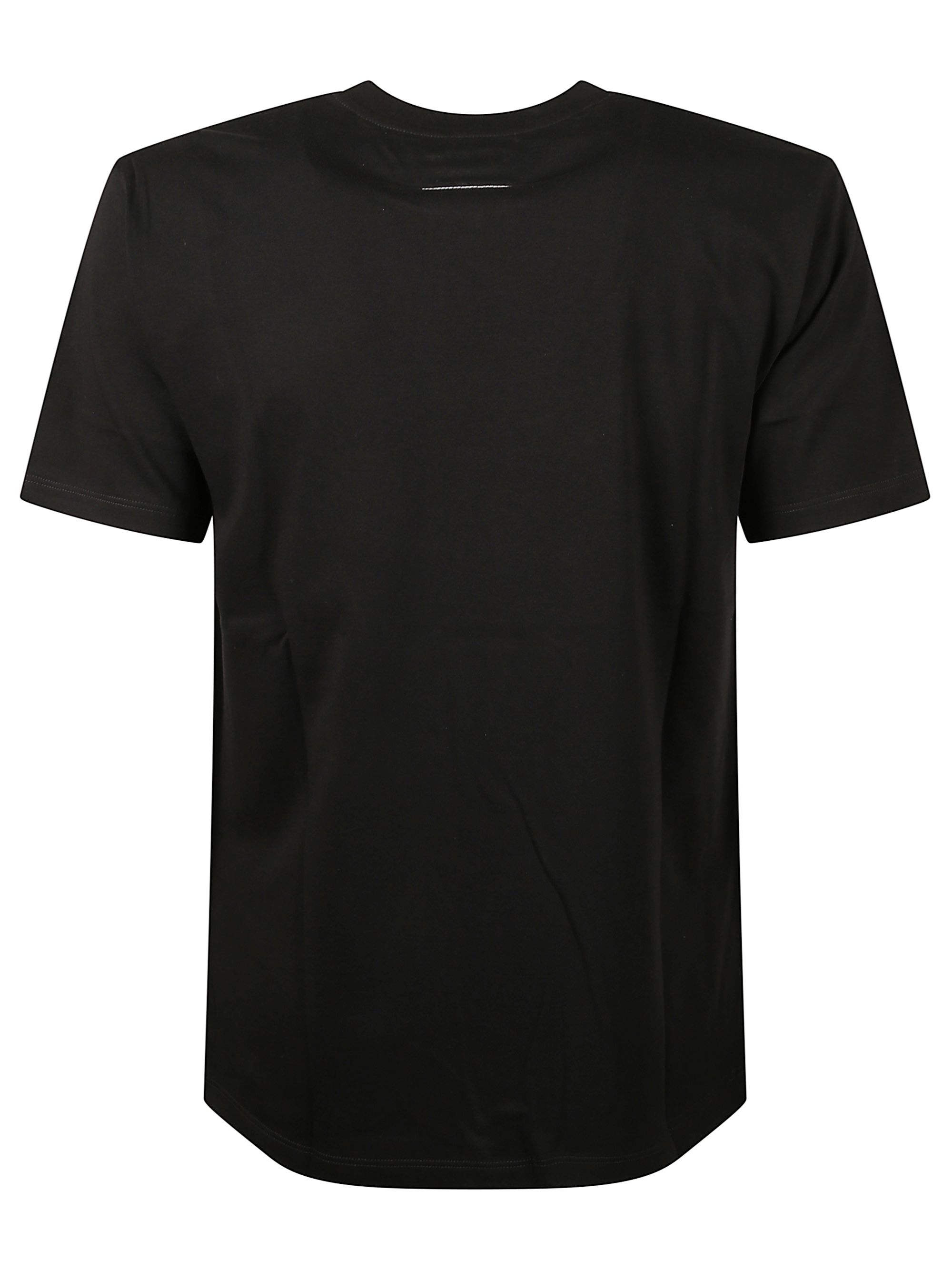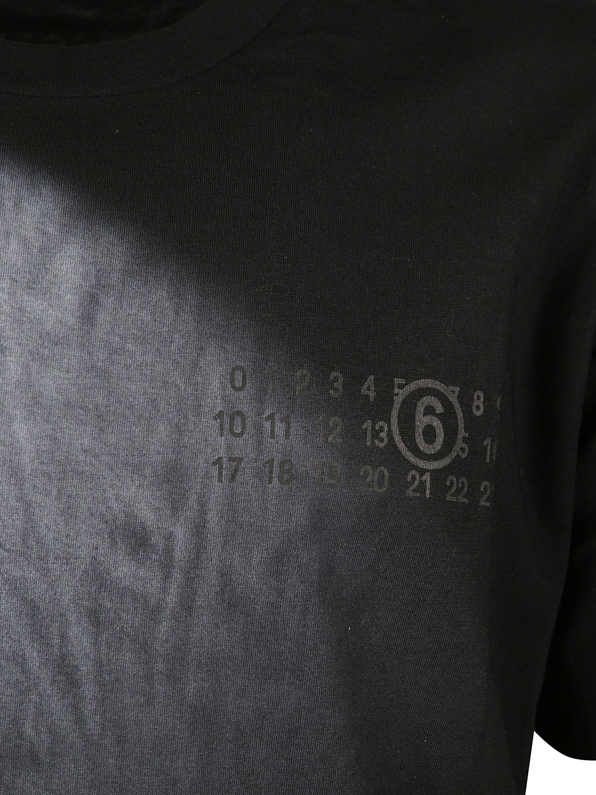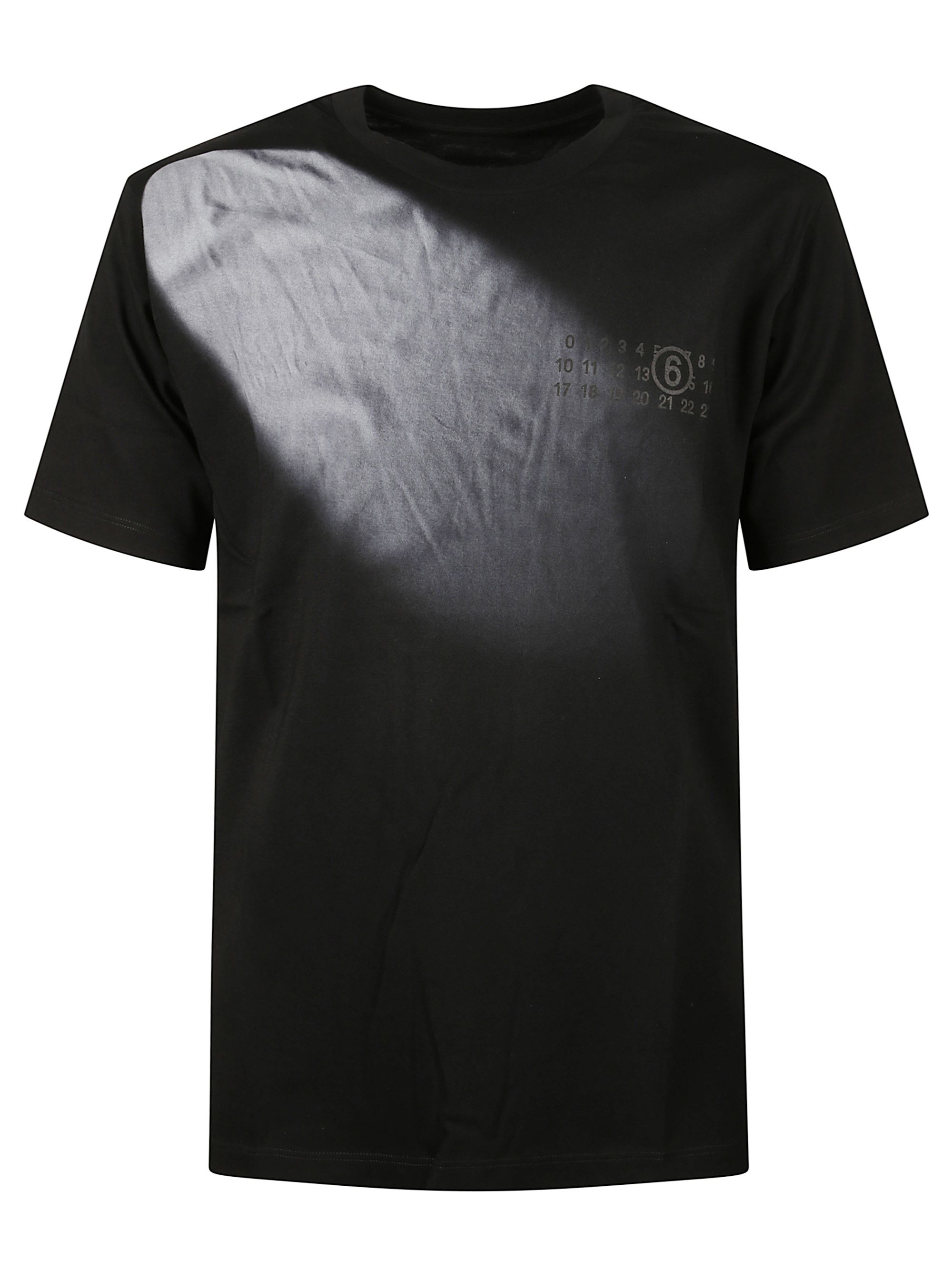 T-shirt Spray Print di MM6 nera in cotone, caratterizzata da dipinto a spruzzo sul petto, girocollo, maniche corte e cucitura bianca della Maison.