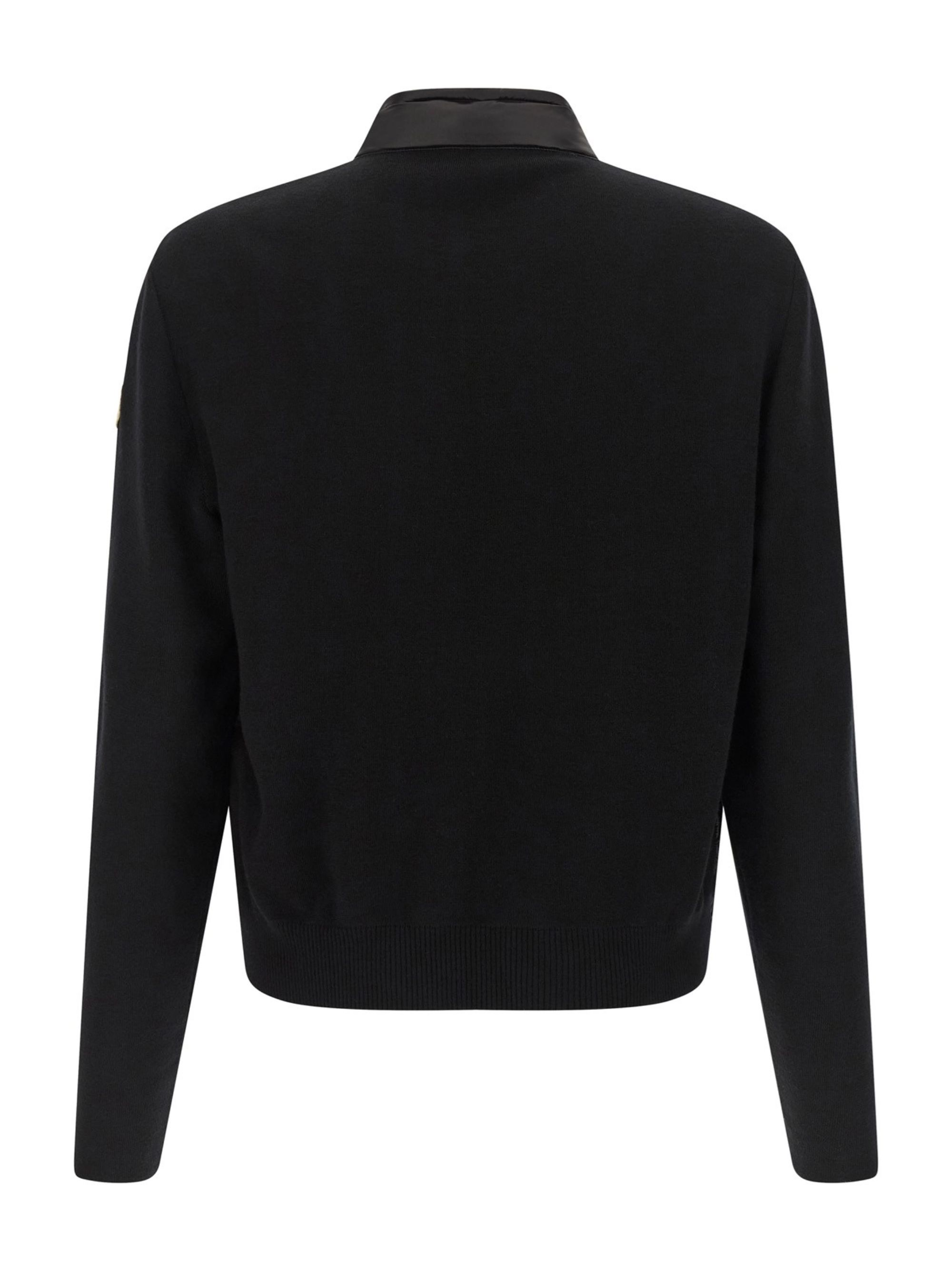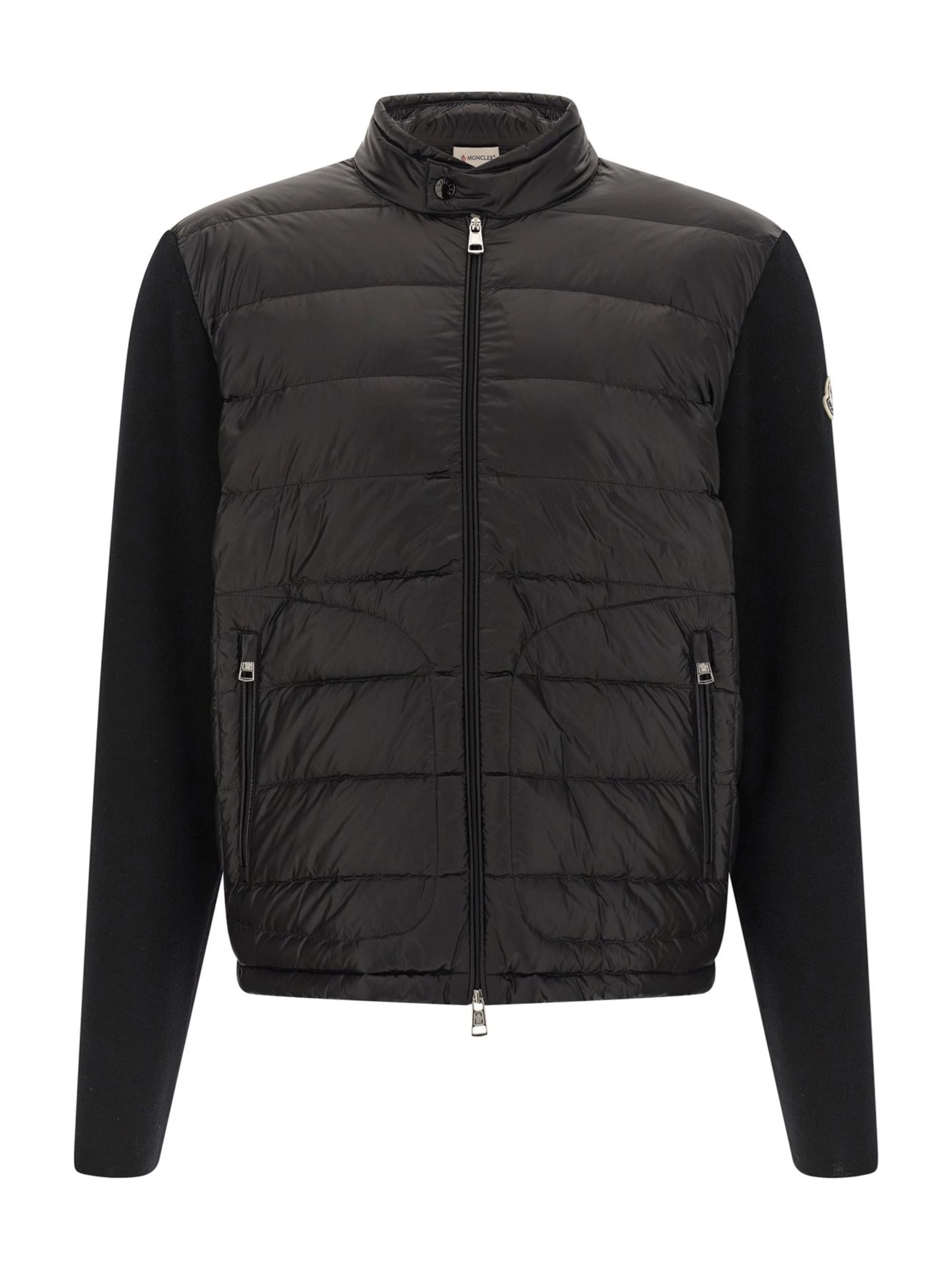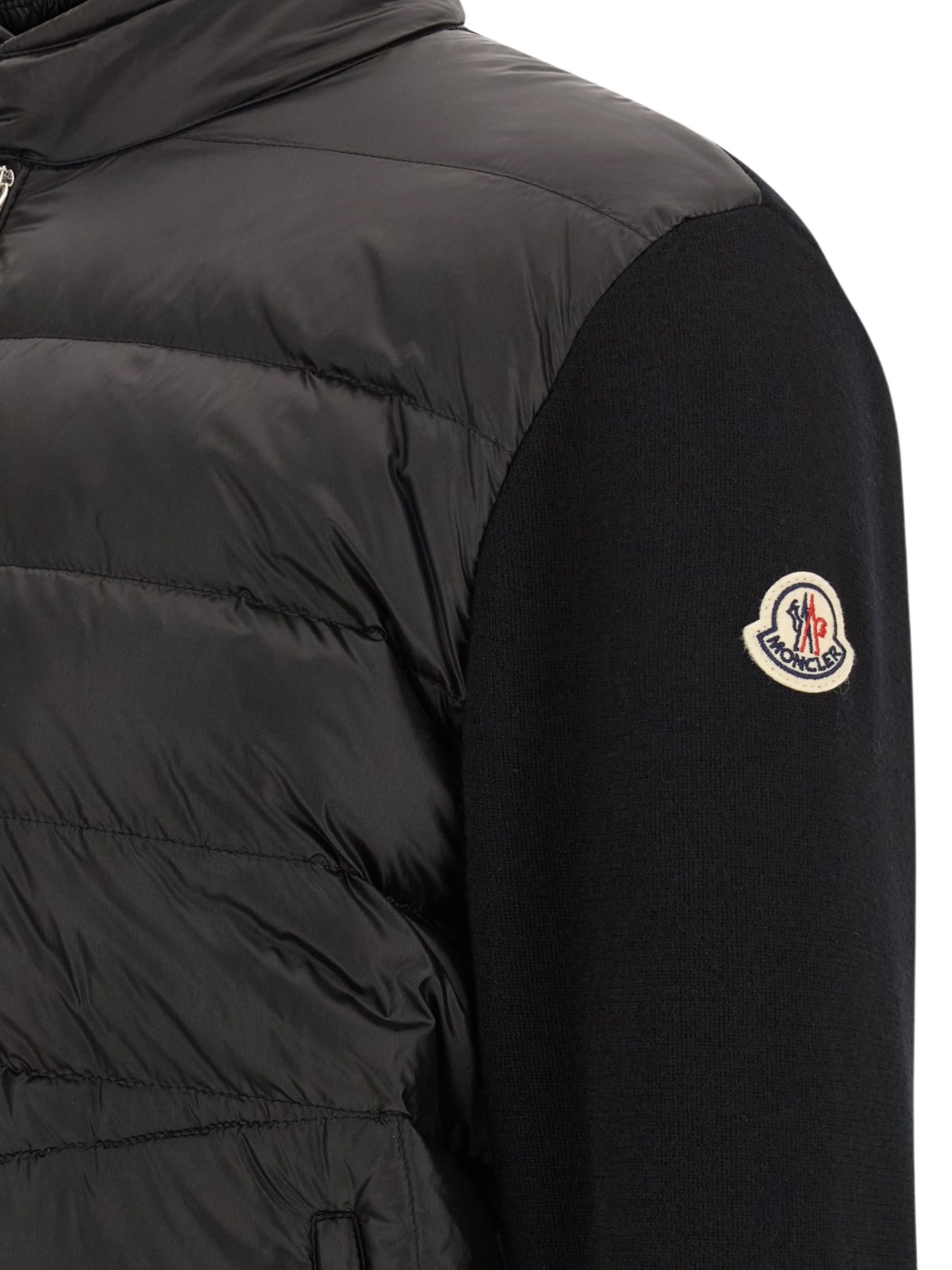 Cardigan imbottito di MONCLER nero in lana e nylon, caratterizzato da parte anteriore in nylon imbottito e trapuntato, collo alto, chiusura con zip, maniche con polsini, patch logo e tasche con zip.
