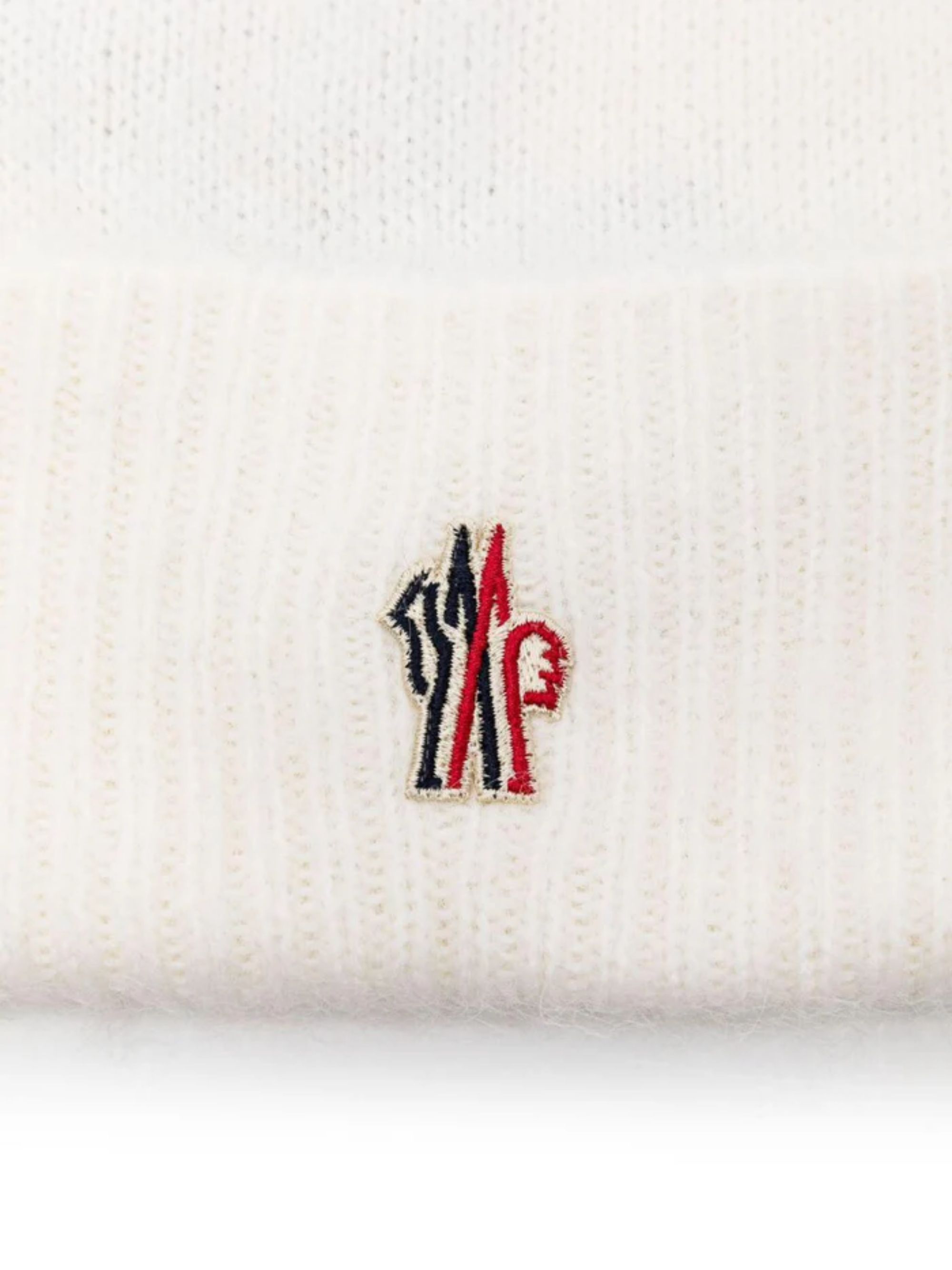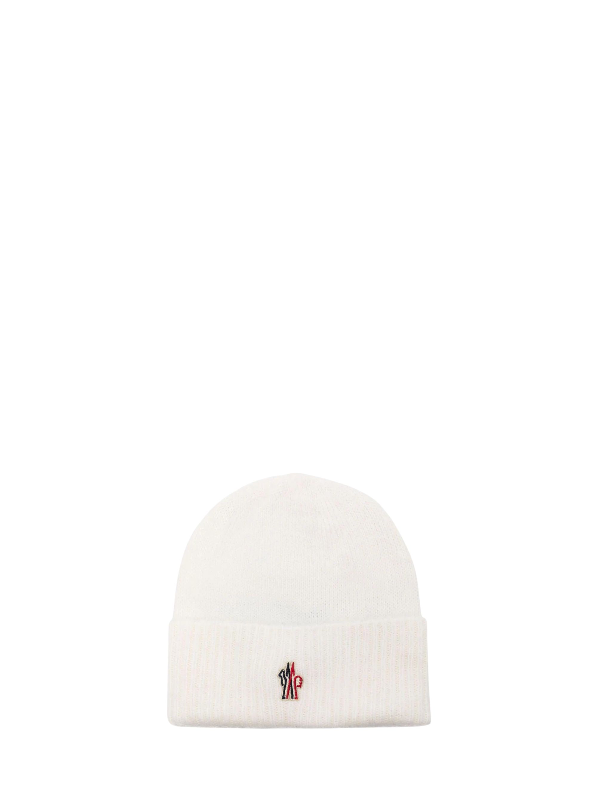 Berretto con logo di MONCLER GRENOBLE bianco in lana, caratterizzato da logo sul davanti e lavorazione a costine.