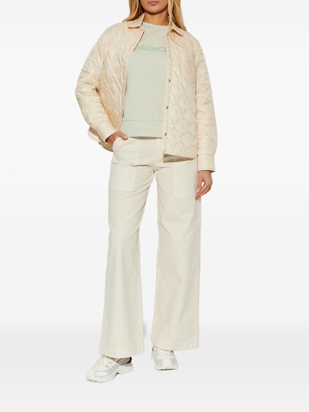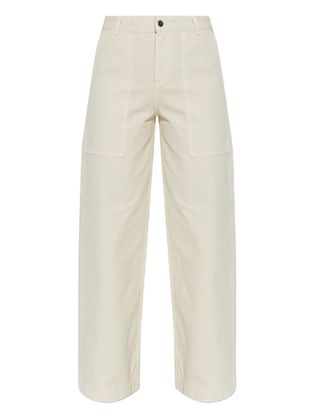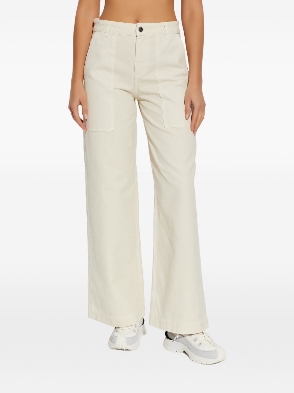 Pantalone con logo di MONCLER beige in cotone, caratterizzato da passanti per cintura, chiusura con zip e bottone, due tasche laterali, due tasche sul retro, logo patch in pelle sul retro e gamba larga.