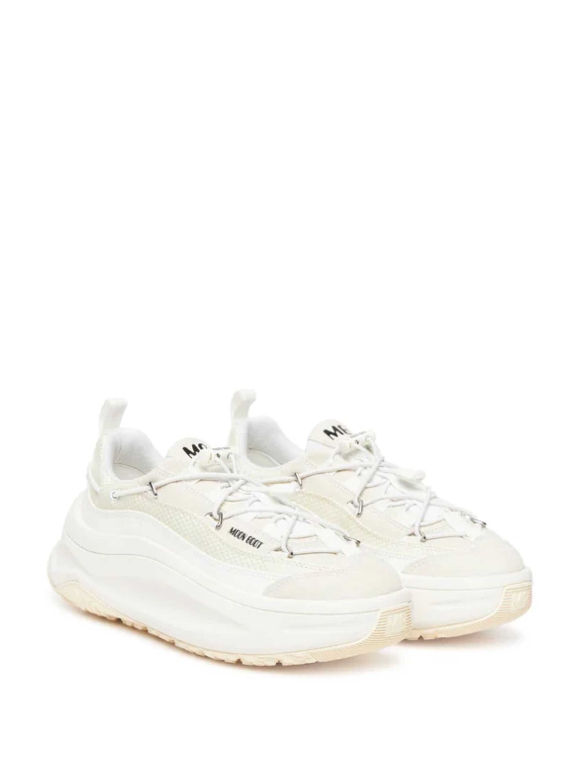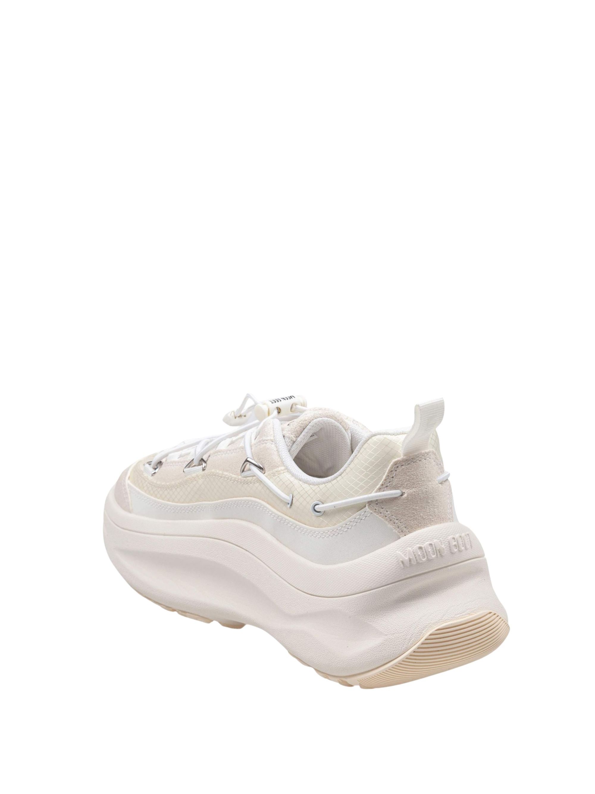Sneaker Moon247 di MOON BOOT bianca in pelle scamosciata, caratterizzata da logo in rilievo sulla suola, occhielli in metallo, chiusura con lacci tubolari, intersuola in EVA e suola battistrada in gomma termoplastica.