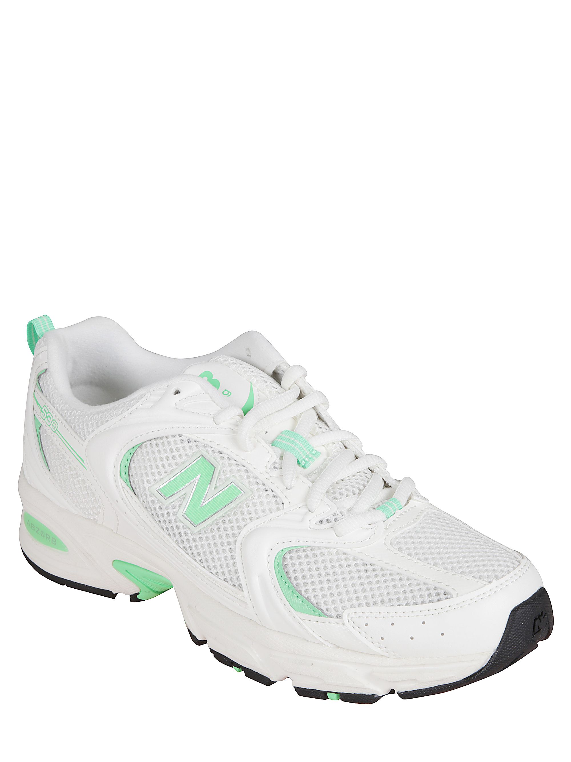 Sneaker 530 di NEW BALANCE verde e bianca in tessuto e mesh, caratterizzata da controtallone con imbottitura morbida, suola in gomma e chisura con lacci.