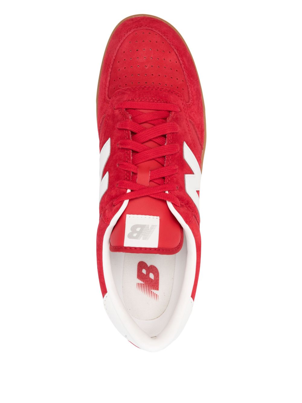Sneaker T500 di NEW BALANCE rossa in pelle scamosciata e nabuk, logo, punta tonda traforata e suola in gomma bianca.