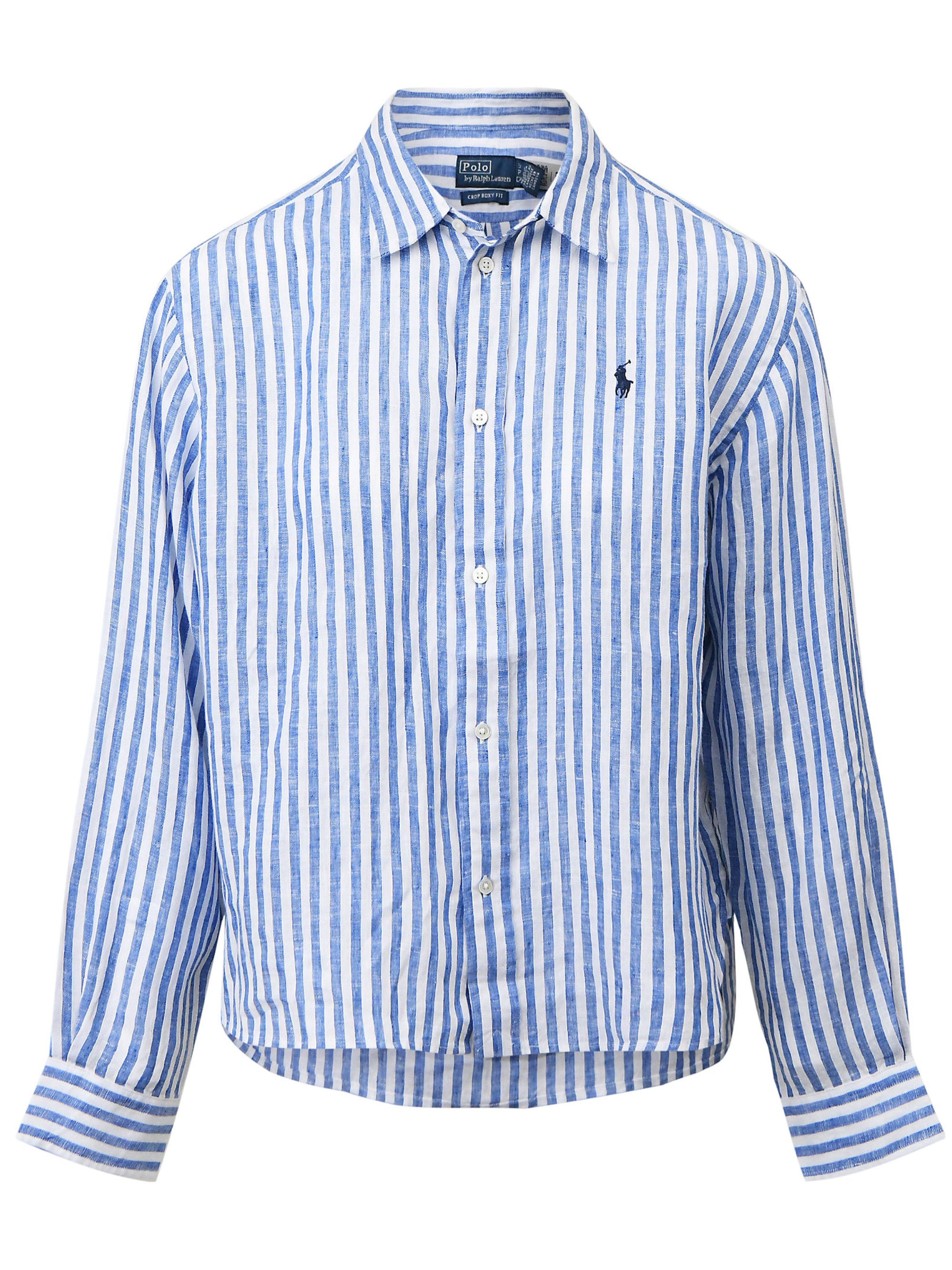 Camicia a righe di RALPH LAUREN bianca e azzurra in lino con colletto, logo lato cuore e chiusura con bottoni.