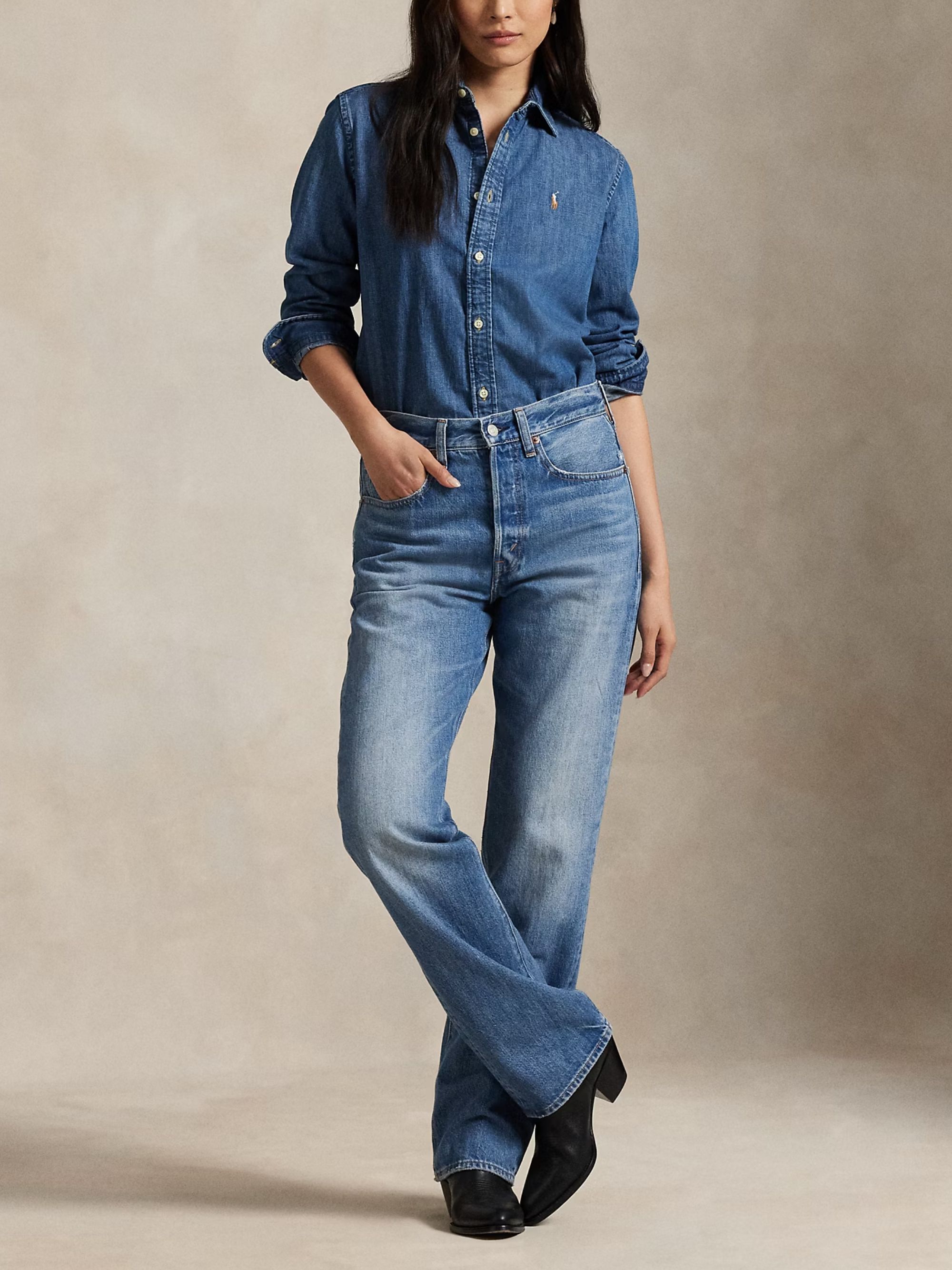 Camicia in denim di RALPH LAUREN blu in cotone, caratterizzata da chiusura con bottoni, colletto classico, polsini con bottoni e logo sul petto.