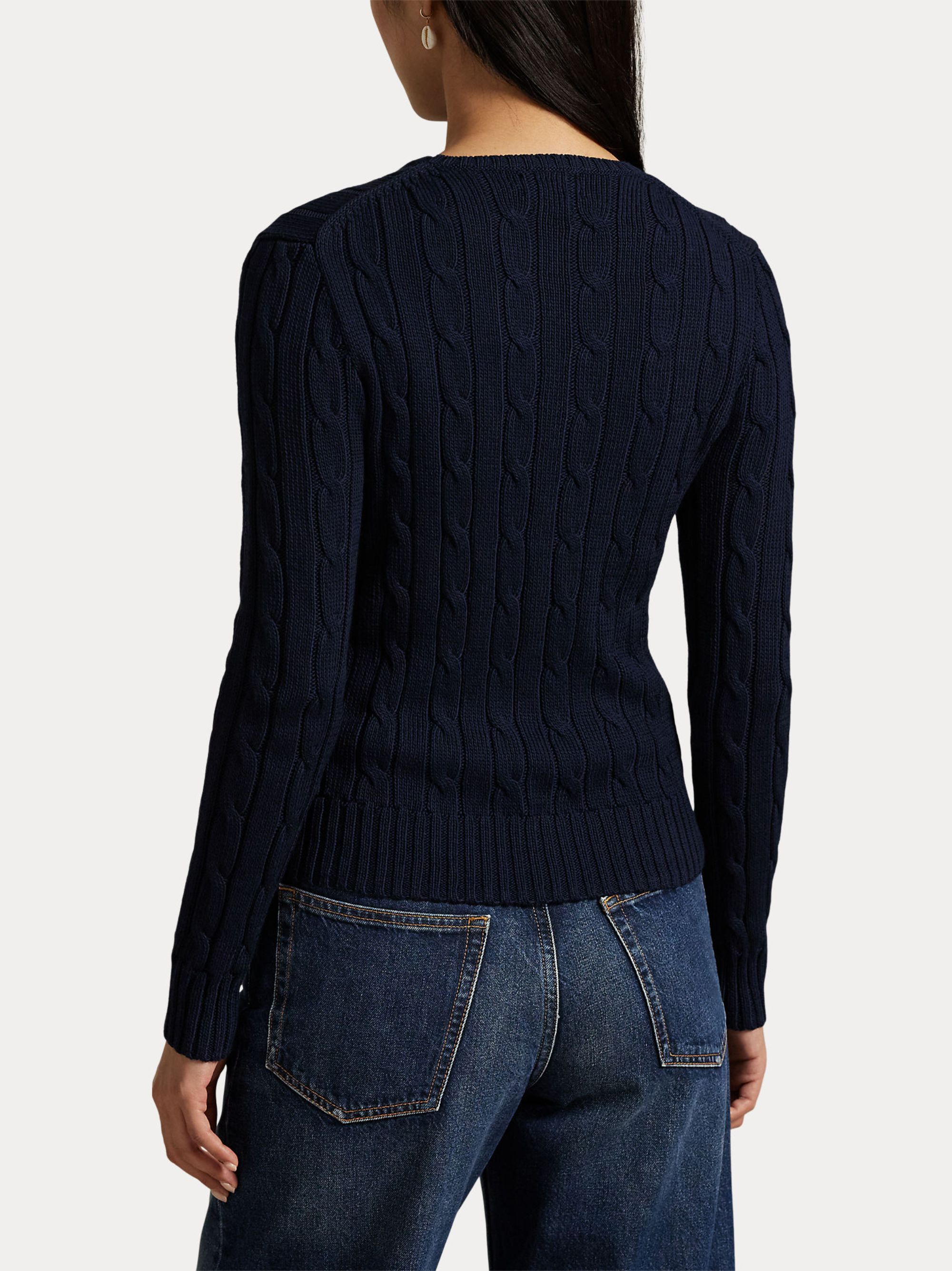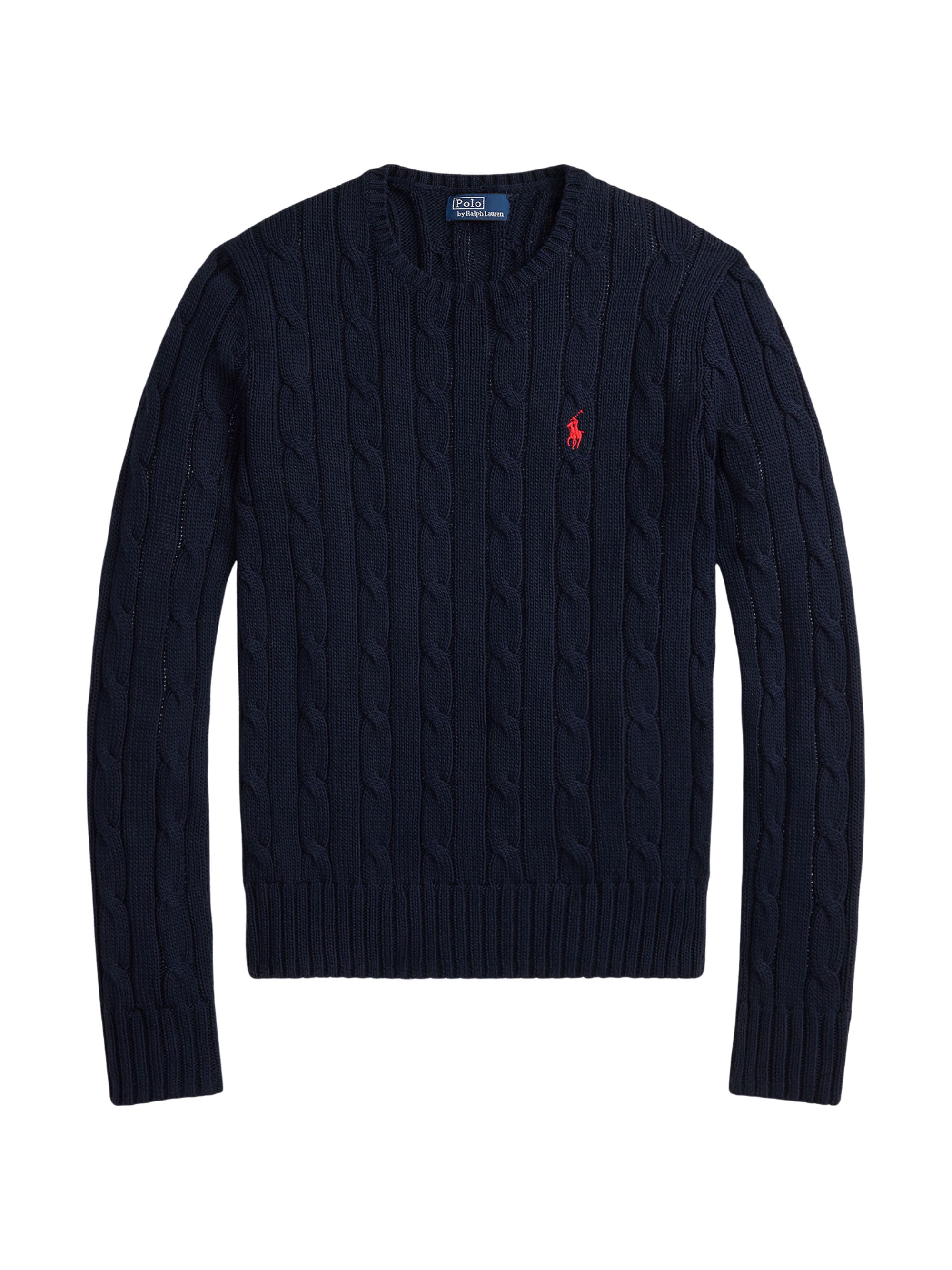 Maglione a trecce con logo di RALPH LAUREN blu in cotone, caratterizzato da motivo a trecce, maniche lunghe, finiture a coste e logo sul petto.