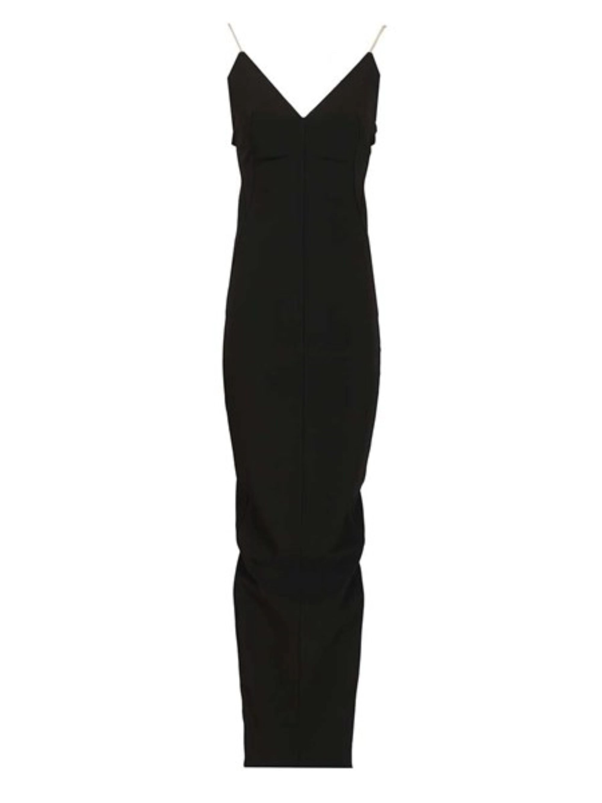 Abito lungo Maillot Gown di RICK OWENS nero in viscosa e acetate, caratterizzato da spalline sottili, scollo a V, chiusura con zip e spacco posteriore.