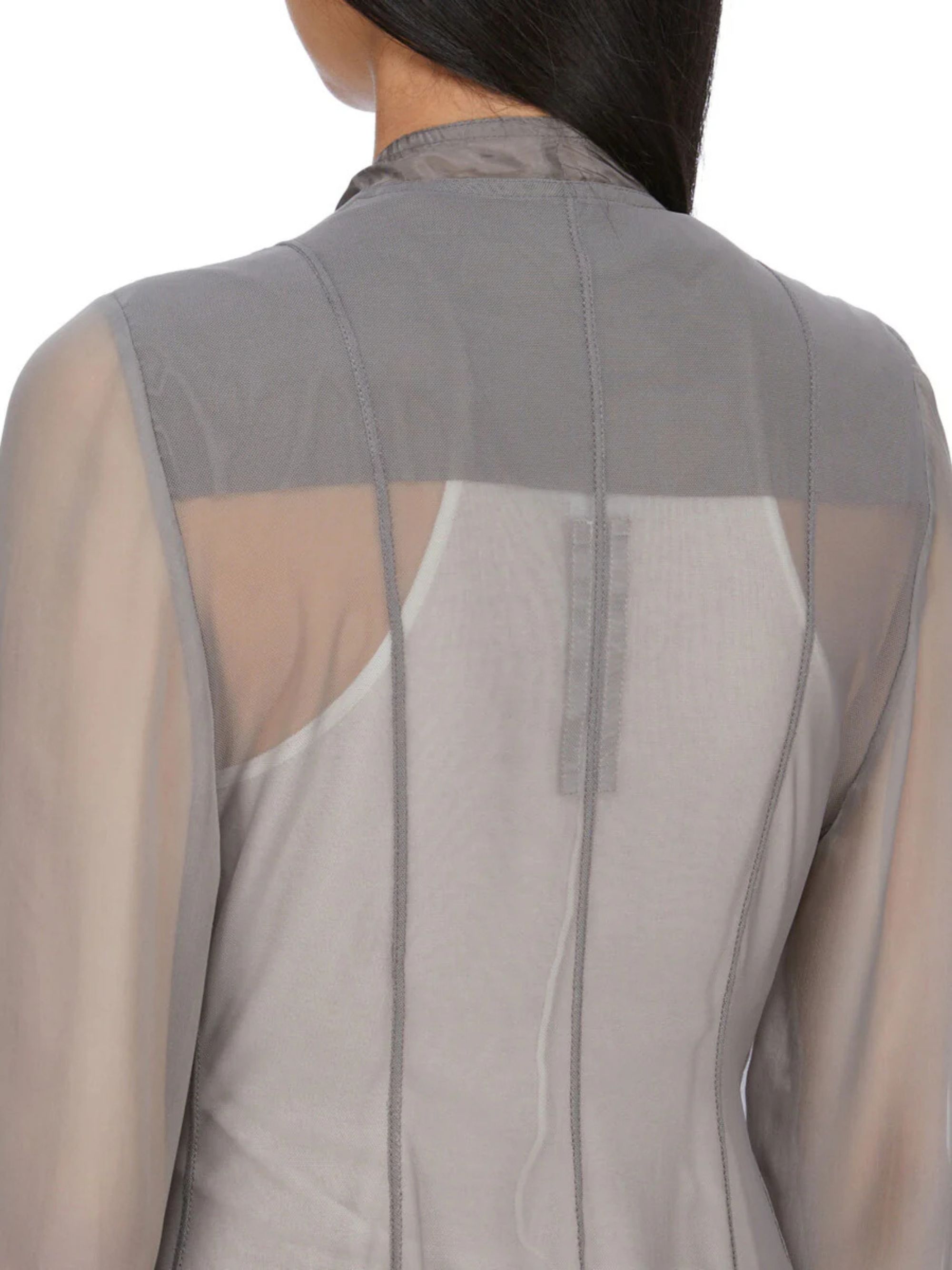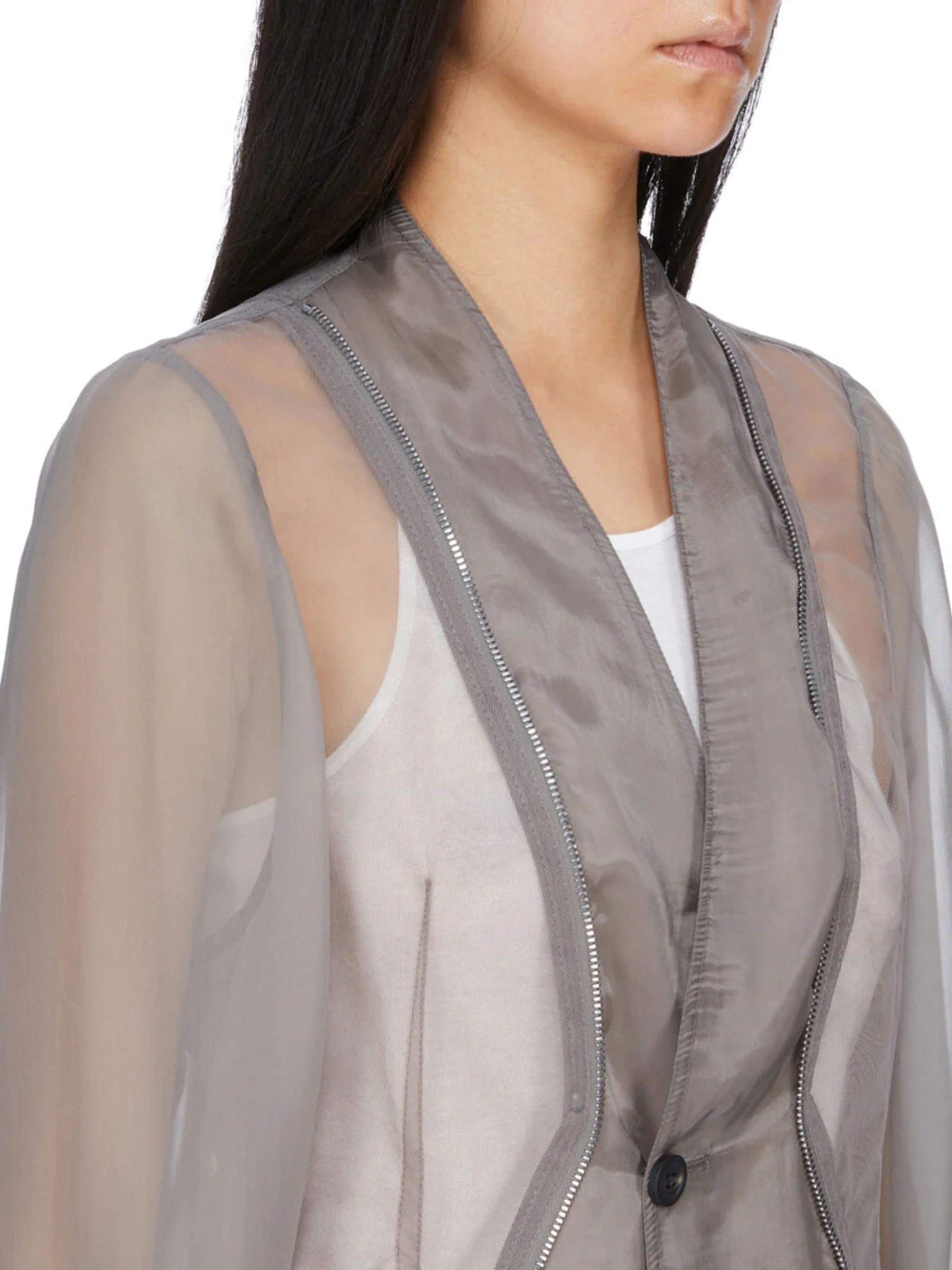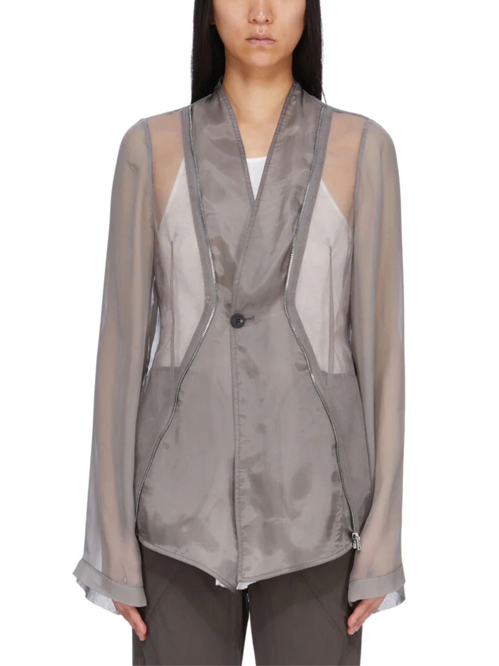Blazer Stag JKT di RICK OWENS verde in seta, cotone e nylon, caratterizzato da maniche lunghe, chiusura frontale con bottone, scollo a V, tasche laterali e zip sagomata sul davanti.