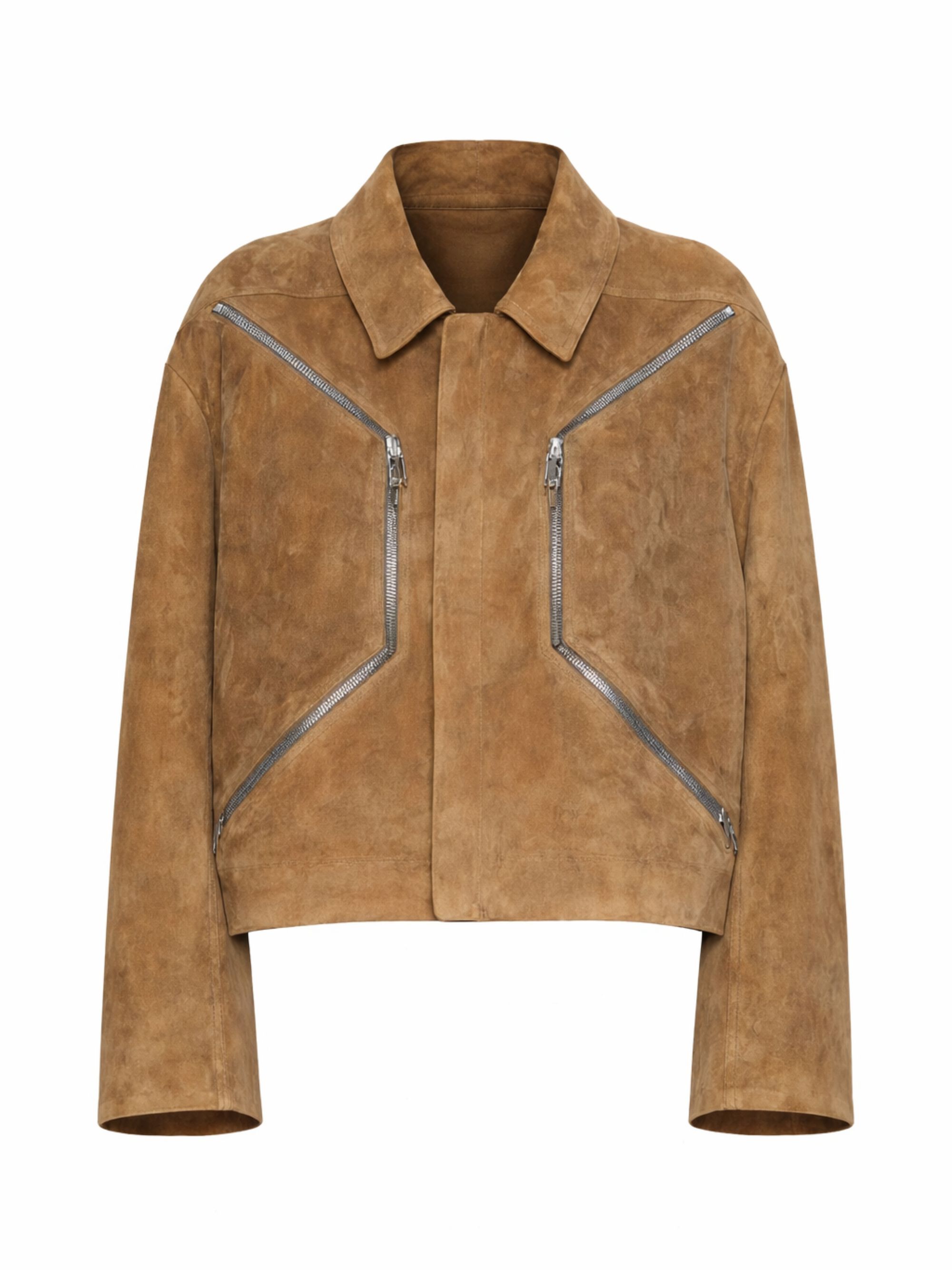 Giacca Heizer Mac JKT di RICK OWENS marrone in pelle scamosciata, caratterizzata da collo classico, chiusura con zip, tasche sul petto con zip e maniche lunghe.