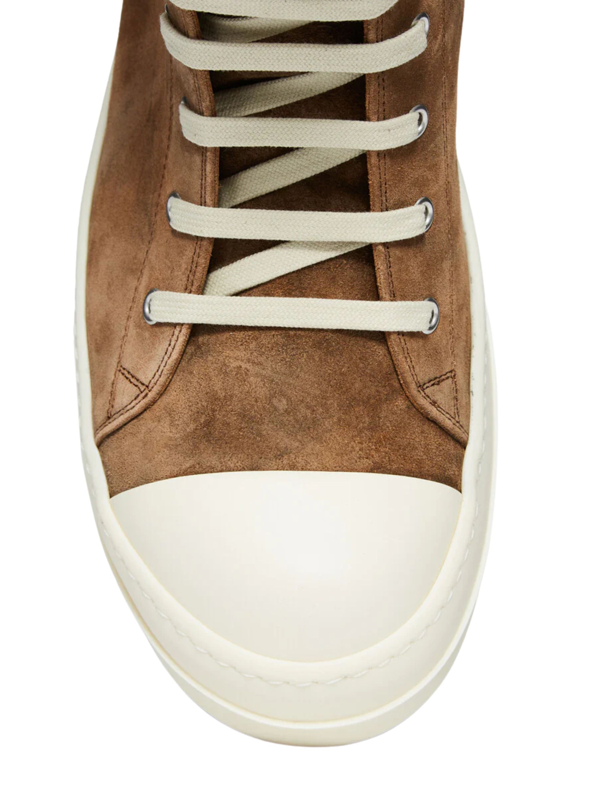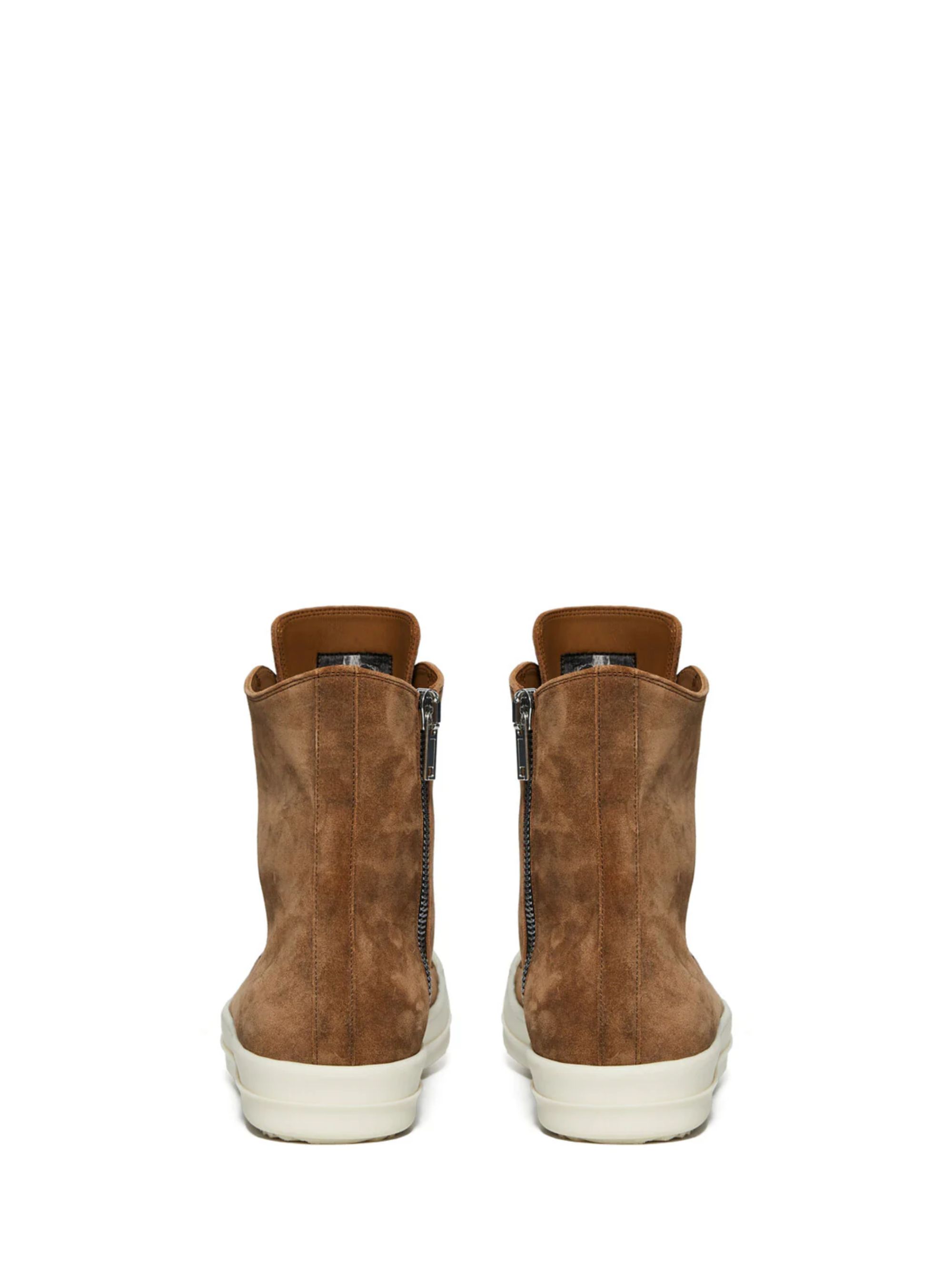 Sneaker Sneaks di RICK OWENS marrone in pelle scamosciata, caratterizzata da chiusura con lacci, zip laterale, occhielli e suola a denti di squalo.