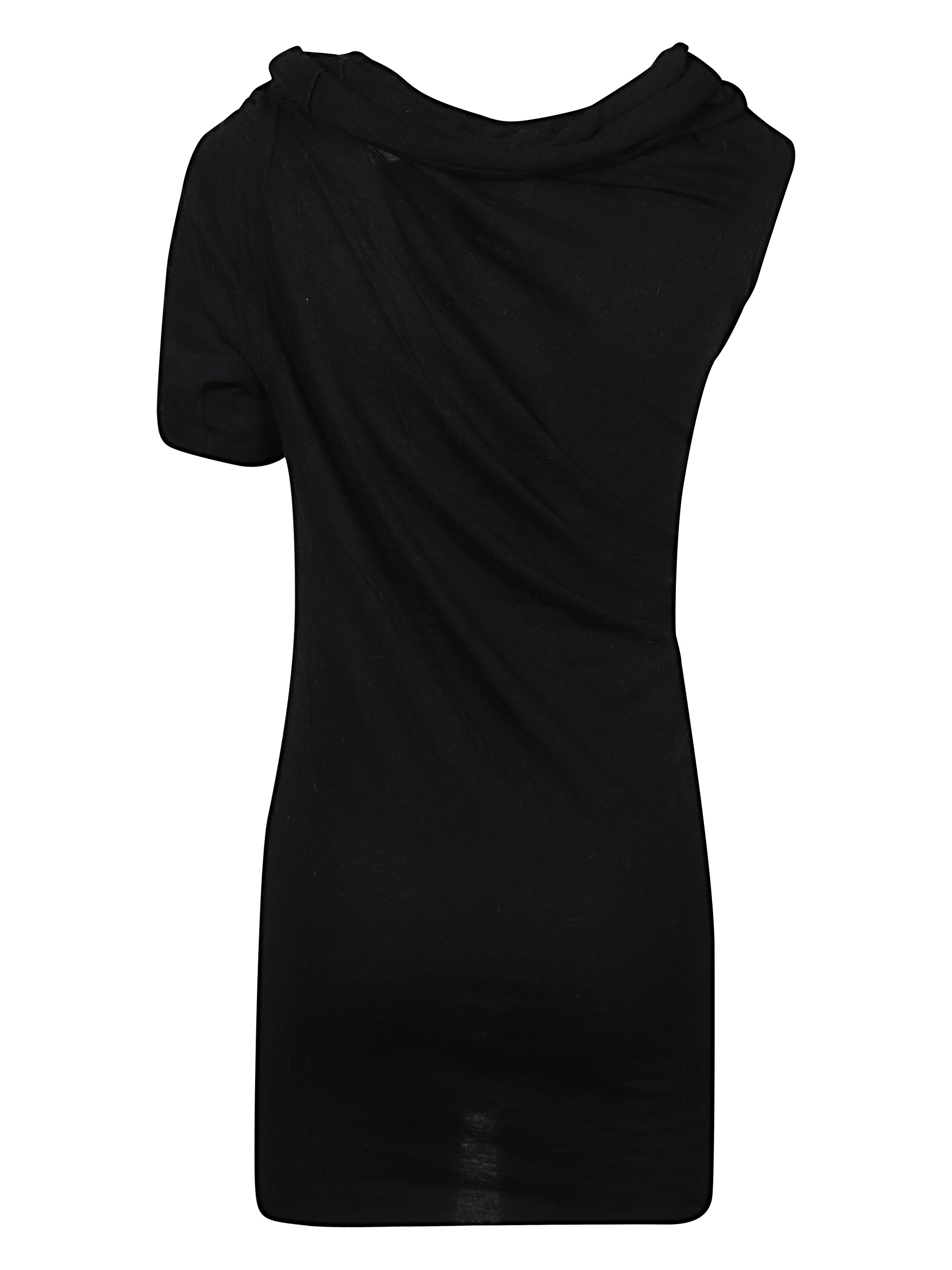 Top nero di RICK OWENS caratterizzato da maniche asimmetriche e tessuto arricciato su una spalla.