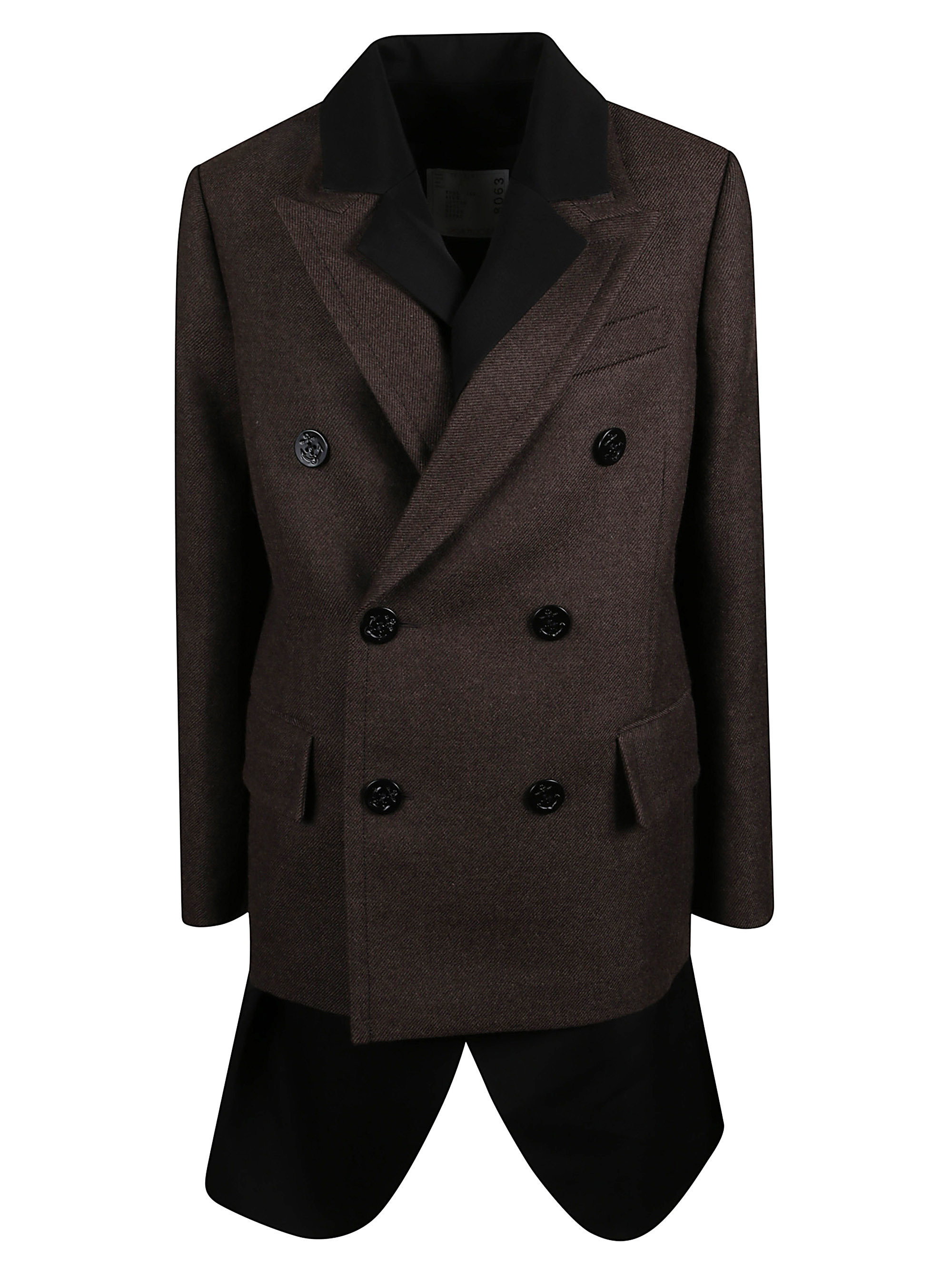 Blazer double-faced di SACAI marrone in lana, caraterizzato da chiusura doppiopetto con bottoni, revers a lancia, tasche con patta, taschino sul petto e gilet interno removibile in nylon e lana.