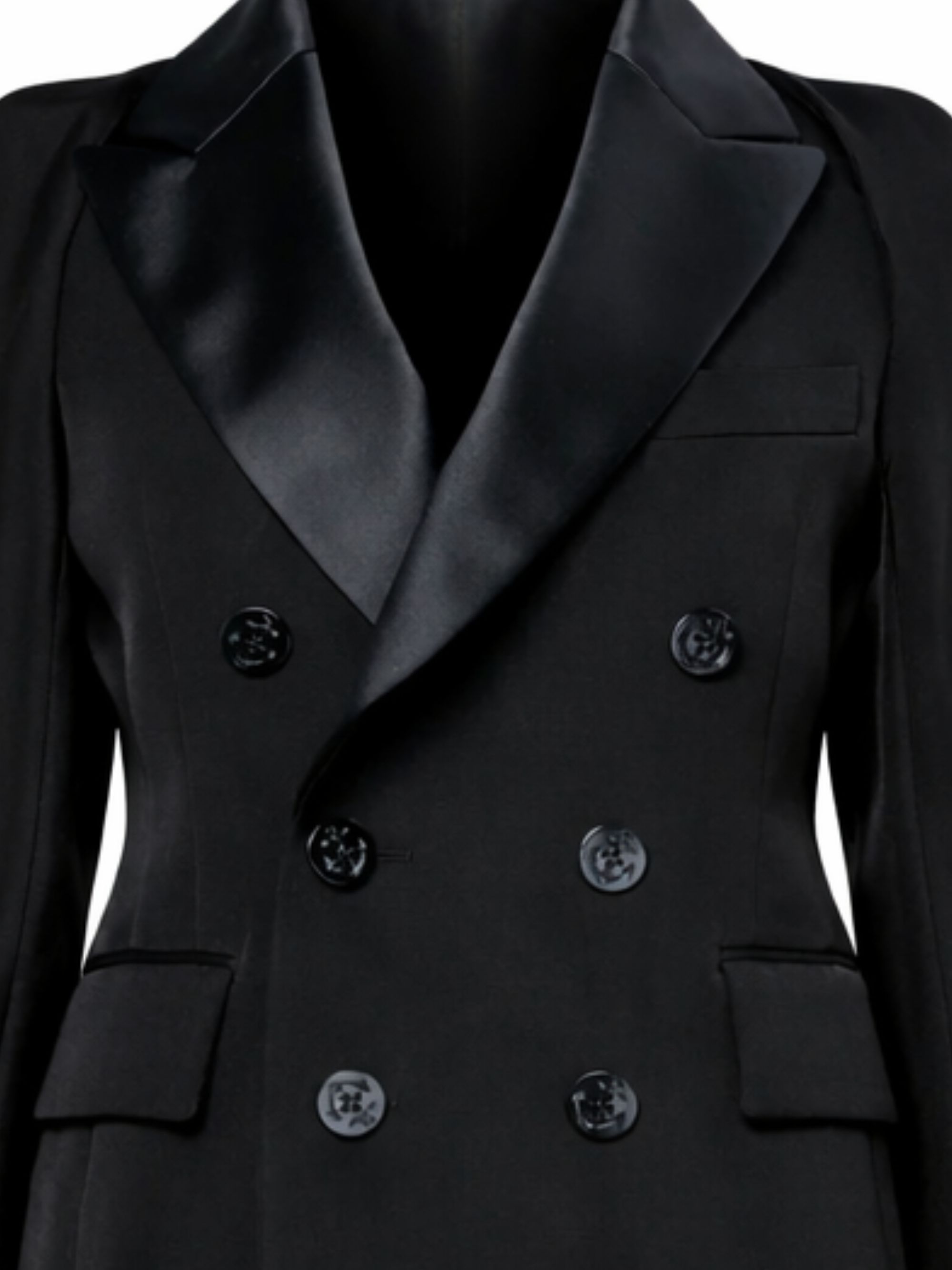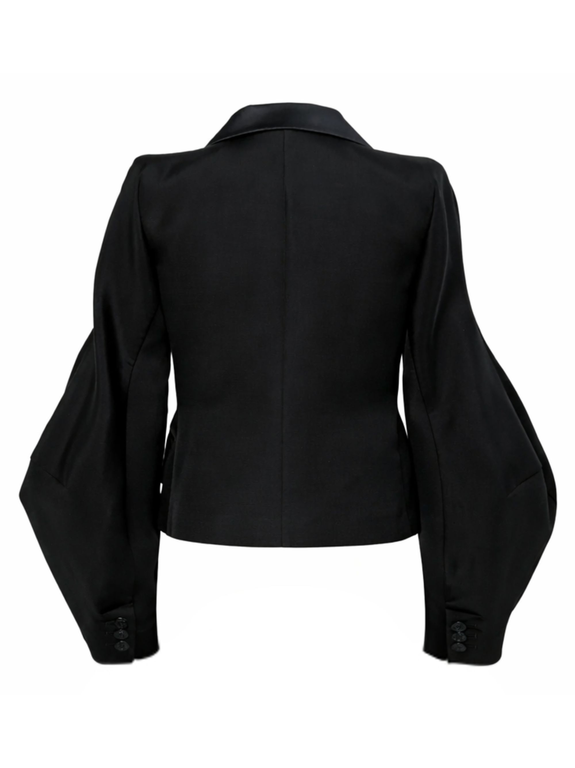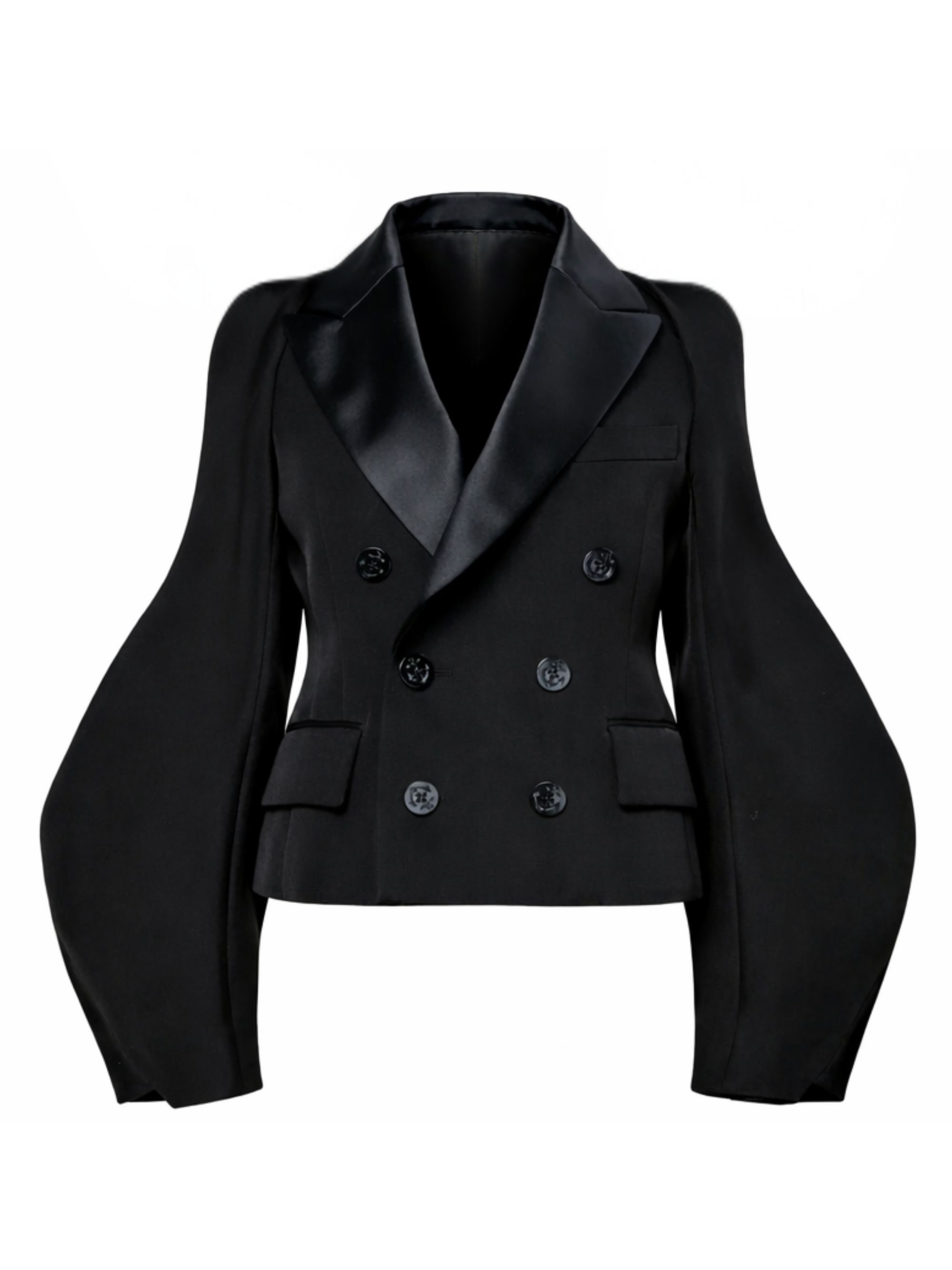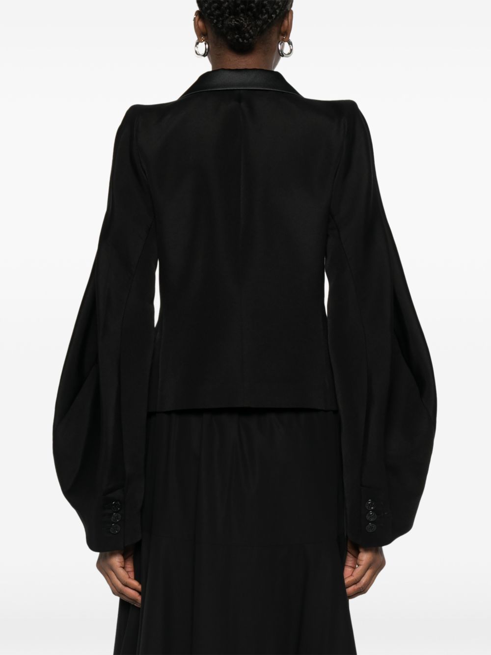 Giacca doppiopetto double-face di SACAI nera in seta e cotone, caratterizzata da chiusura a doppiopetto con bottoni, revers a lancia, maniche ampie e voluminose, taschino sul petto e due tasche con patta sul fronte.