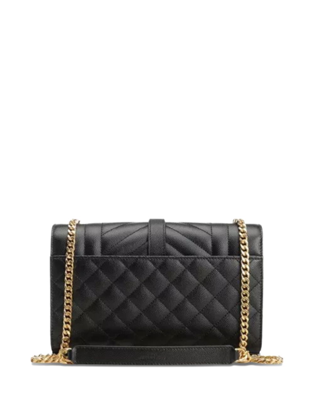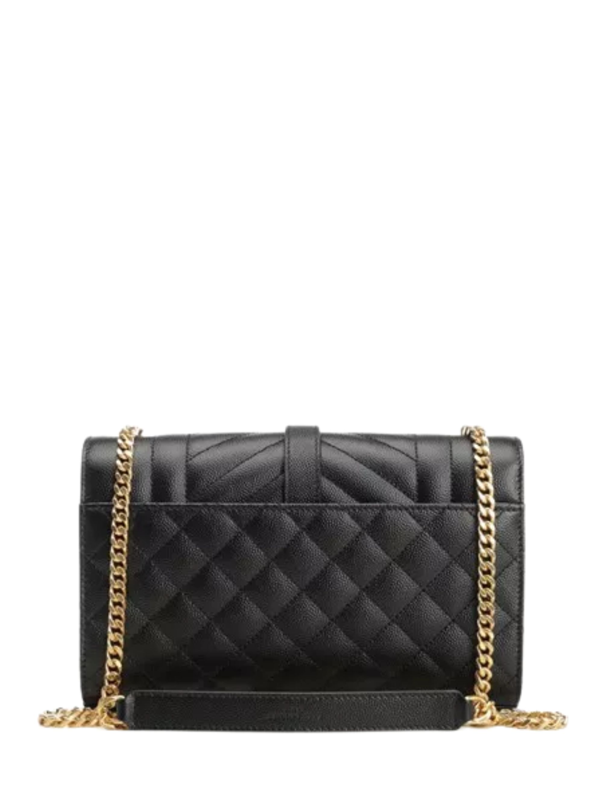Borsa Envelope small di SAINT LAURENT nera in pelle trapuntata chevron a rombi, hardware oro, catena lunga, tasca esterna sul retro, tasca interna applicata e chiusura magnetica a pressione. Dimensioni: 21 x 13 x 6 cm.