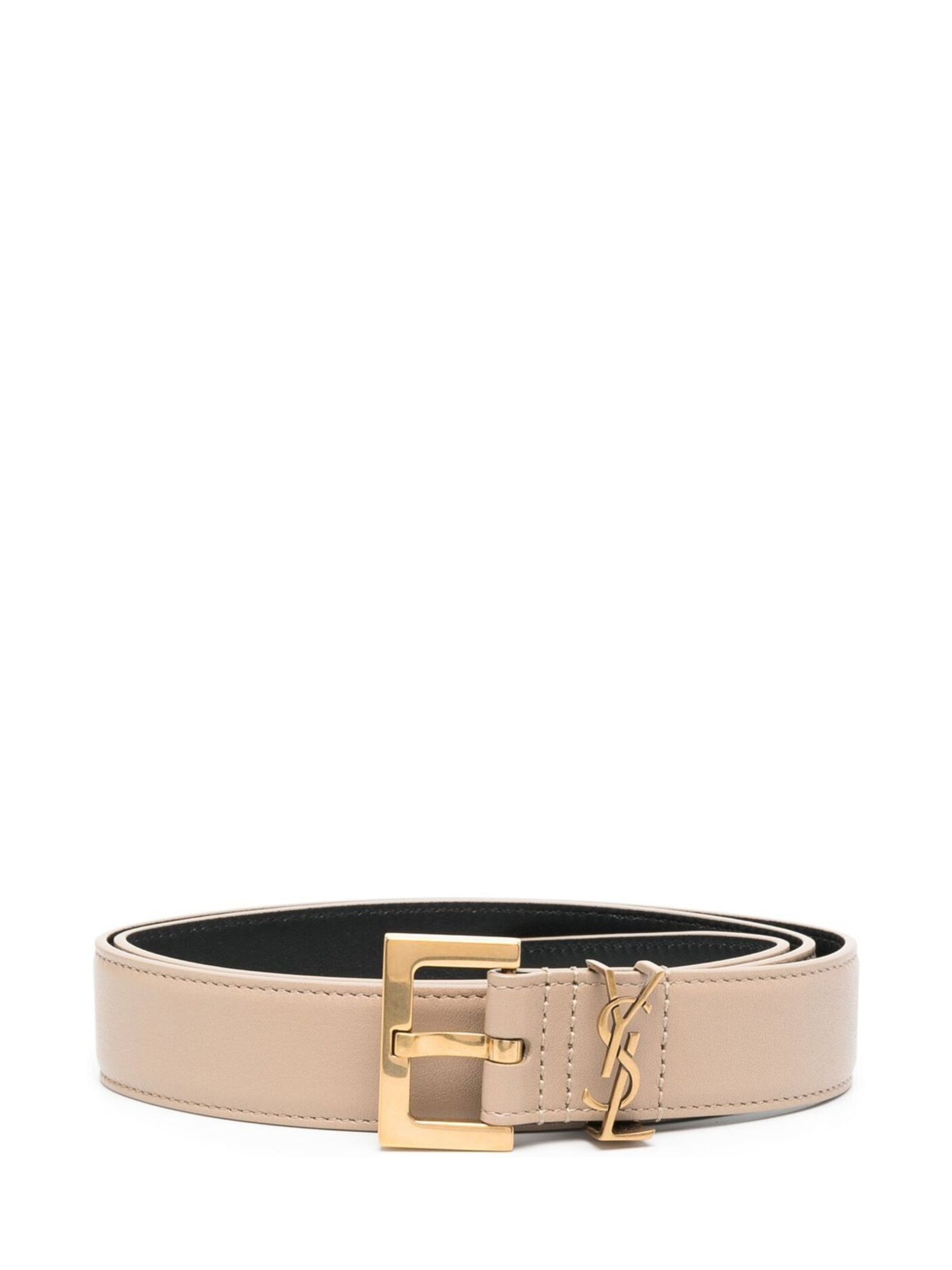 Cintura Cassandre di SAINT LAURENT beige in pelle, caratterizzata da hardware in bronzo, chiusura con fibbia regolabile e passante con iscrizione YSL.