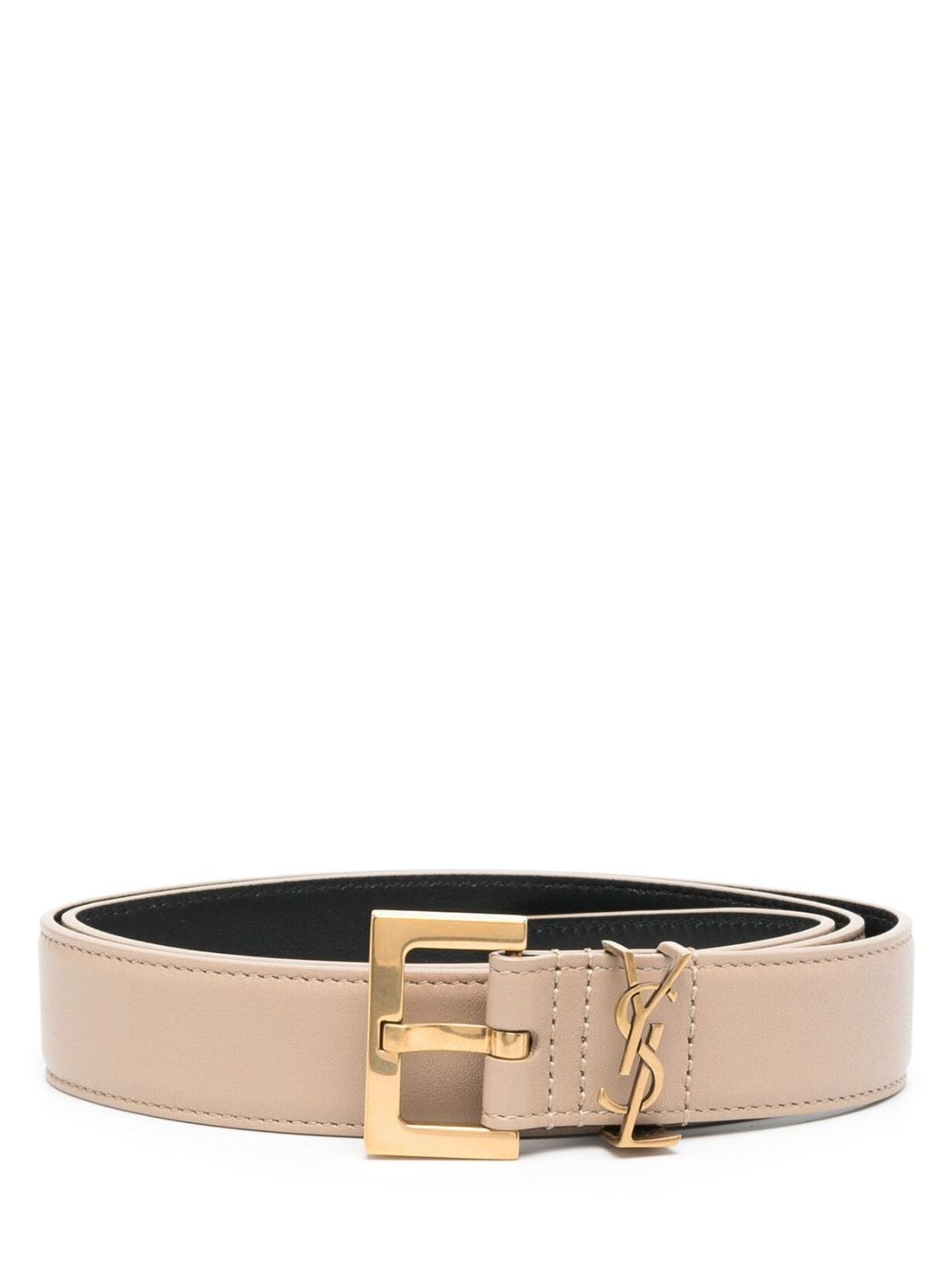 Cintura Cassandre con fibbia in metallo di SAINT LAURENT beige in pelle, caratterizzata da parti metalliche in bronzo e chiusura con fibbia regolabile.