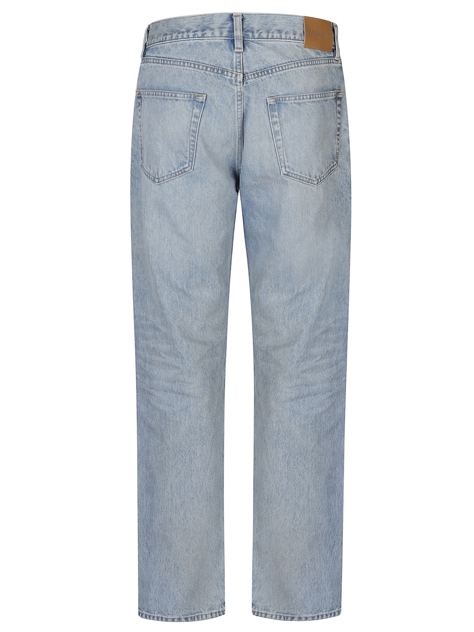 Jeans straight di SAINT LAURENT in denim di cotone chiaro con patch logo in pelle sul retro, passanti per cintura e chisuura frontale nascosta con zip e bottone.