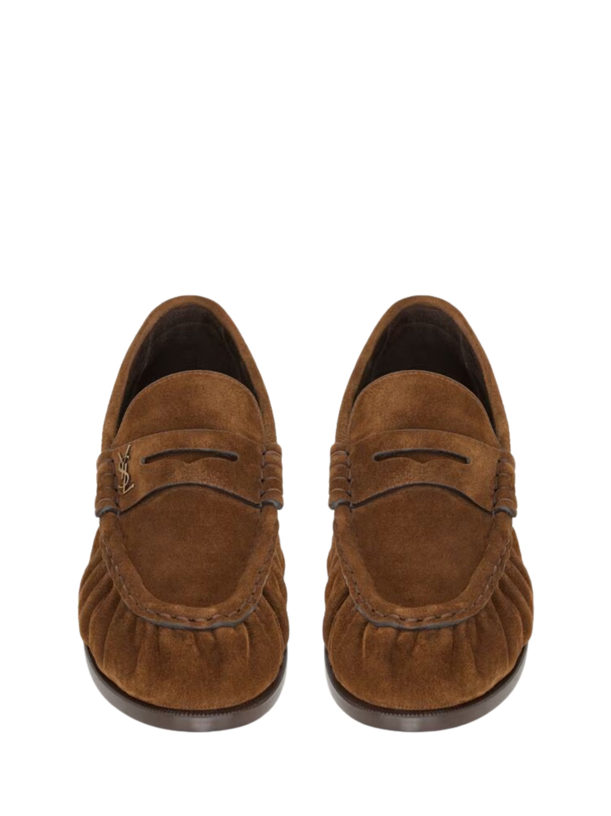 Mocassino Le Loafer di SAINT LAURENT marrone in pelle scamosciata, caratterizzato da decorazione cassandre in metallo dorato, punta moc cucita a mano e suola in cuoio.