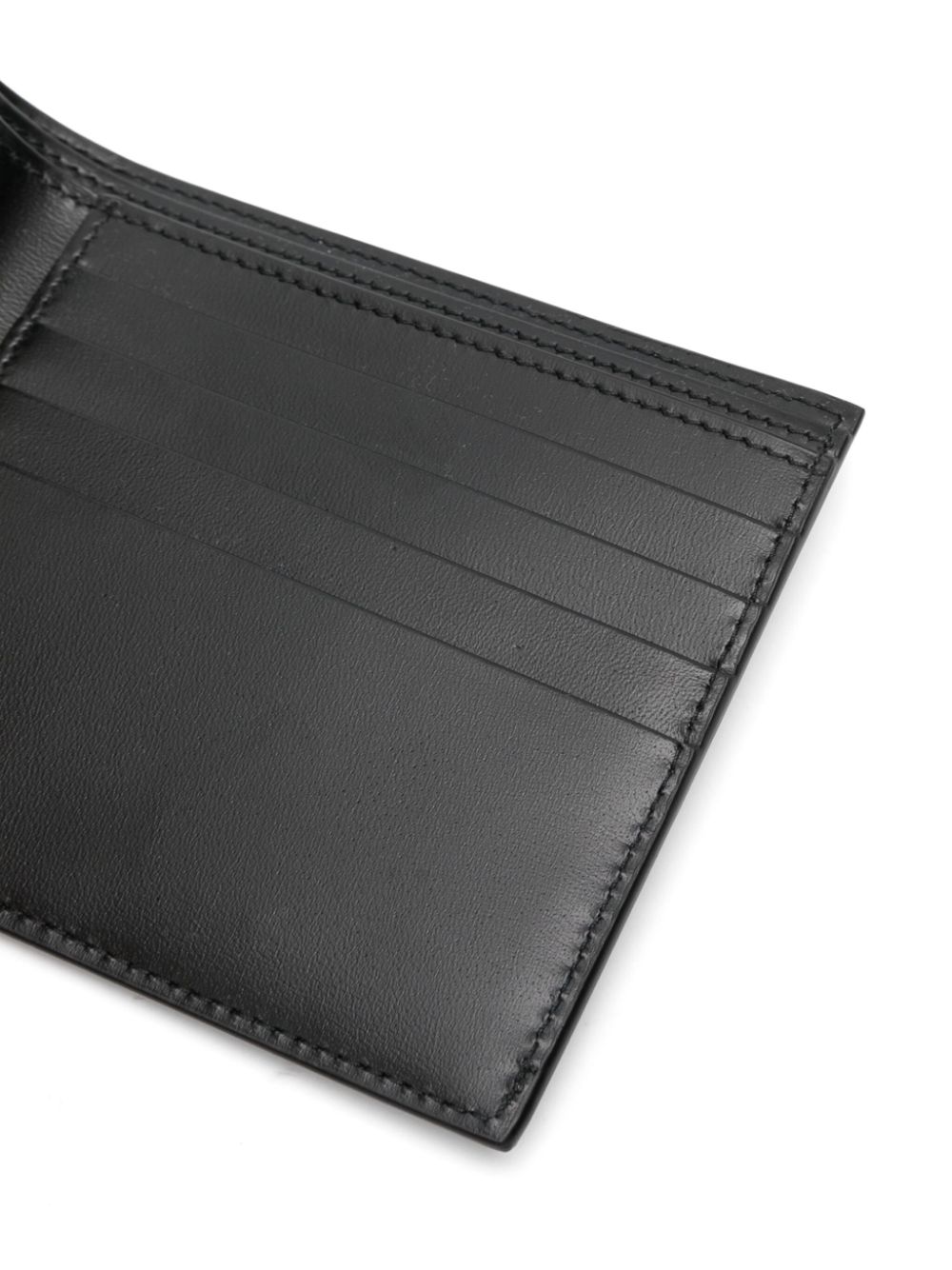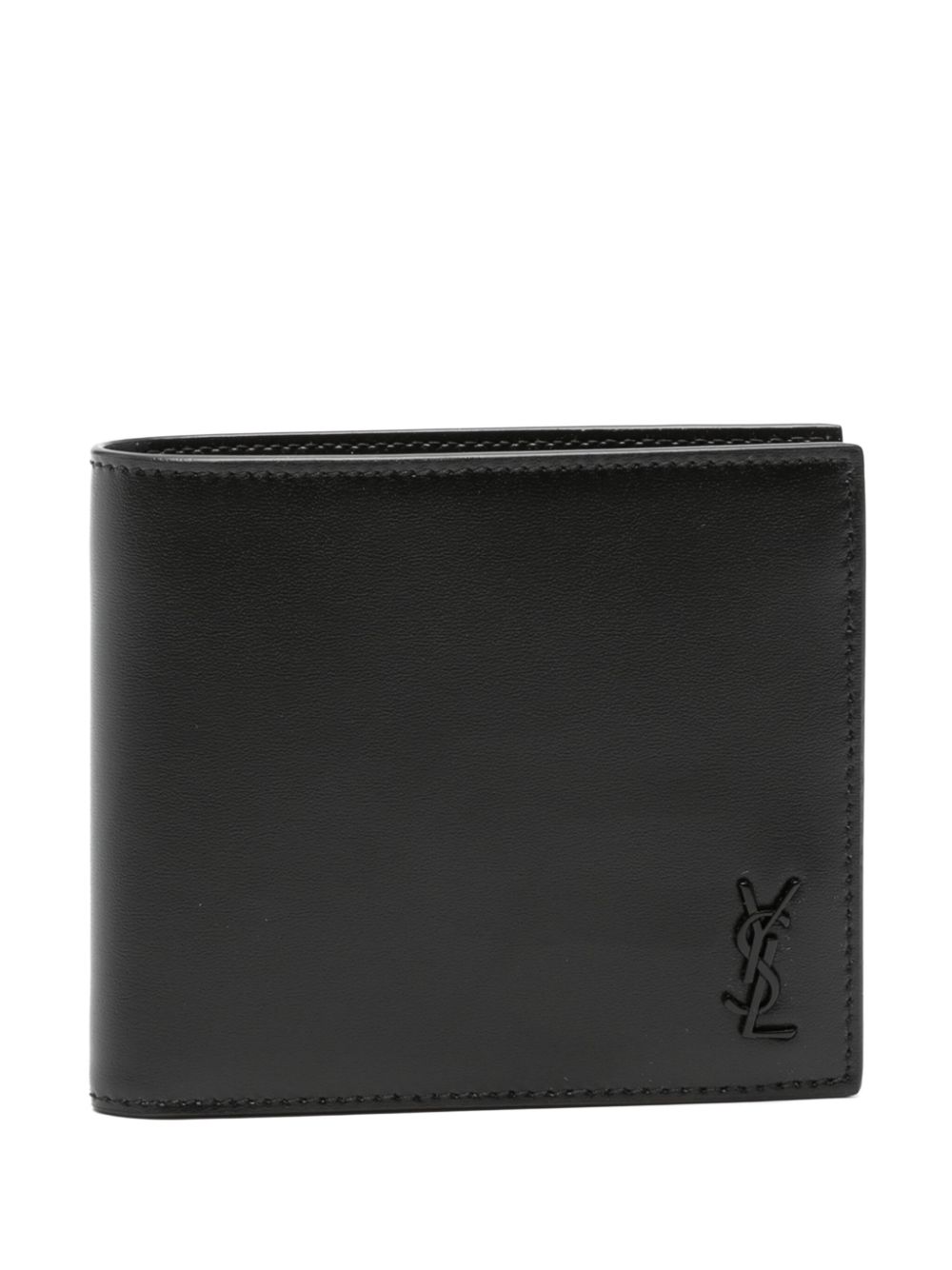 Portafoglio Tiny Cassandre di SAINT LAURENT nero in pelle opaca con hardware argento, scomparti per banconote, fessure per carte e scomparti per ricevute. Dimensioni: 11,5 x 9,5 x 1,5 cm