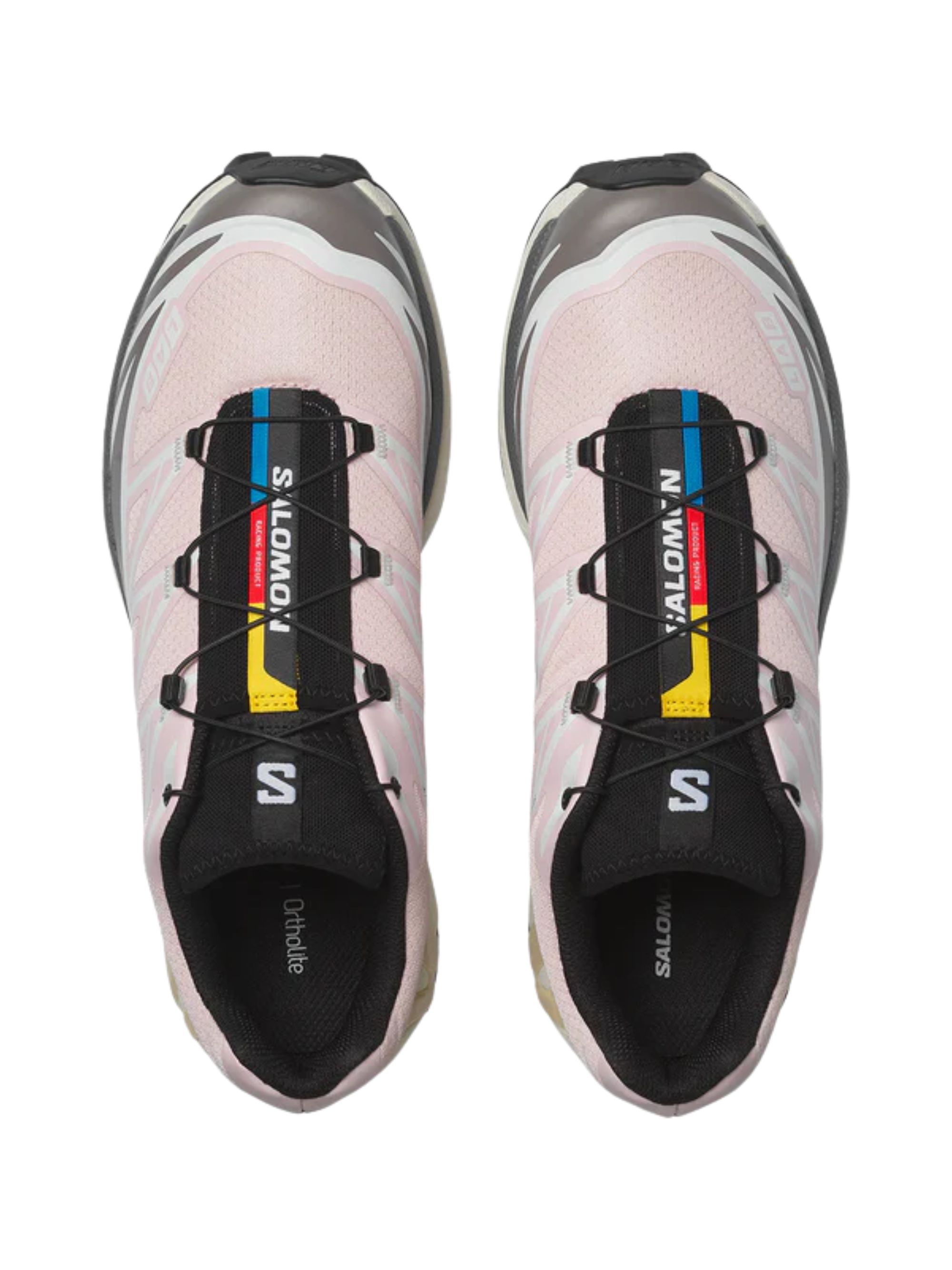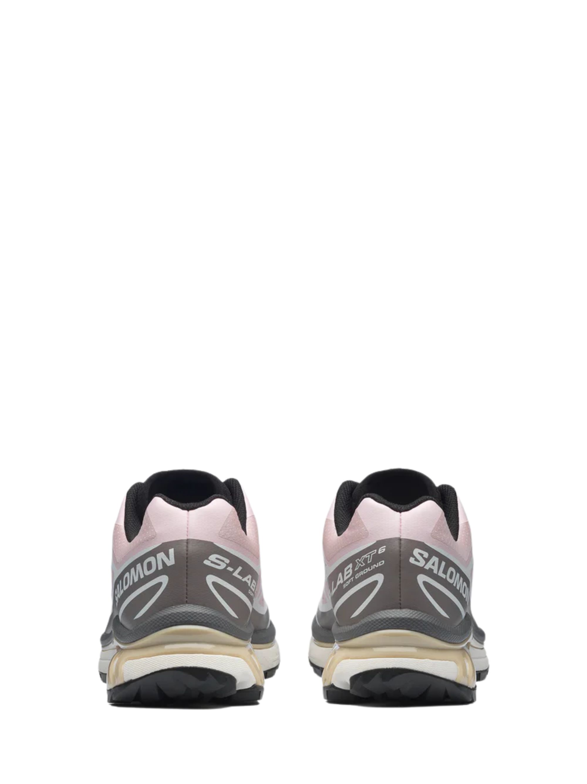 Sneaker XT-6 di SALOMON rosa con dettagli grigi e bianchi, punta arrotondata, suola in gomma e chiusura Quicklace.