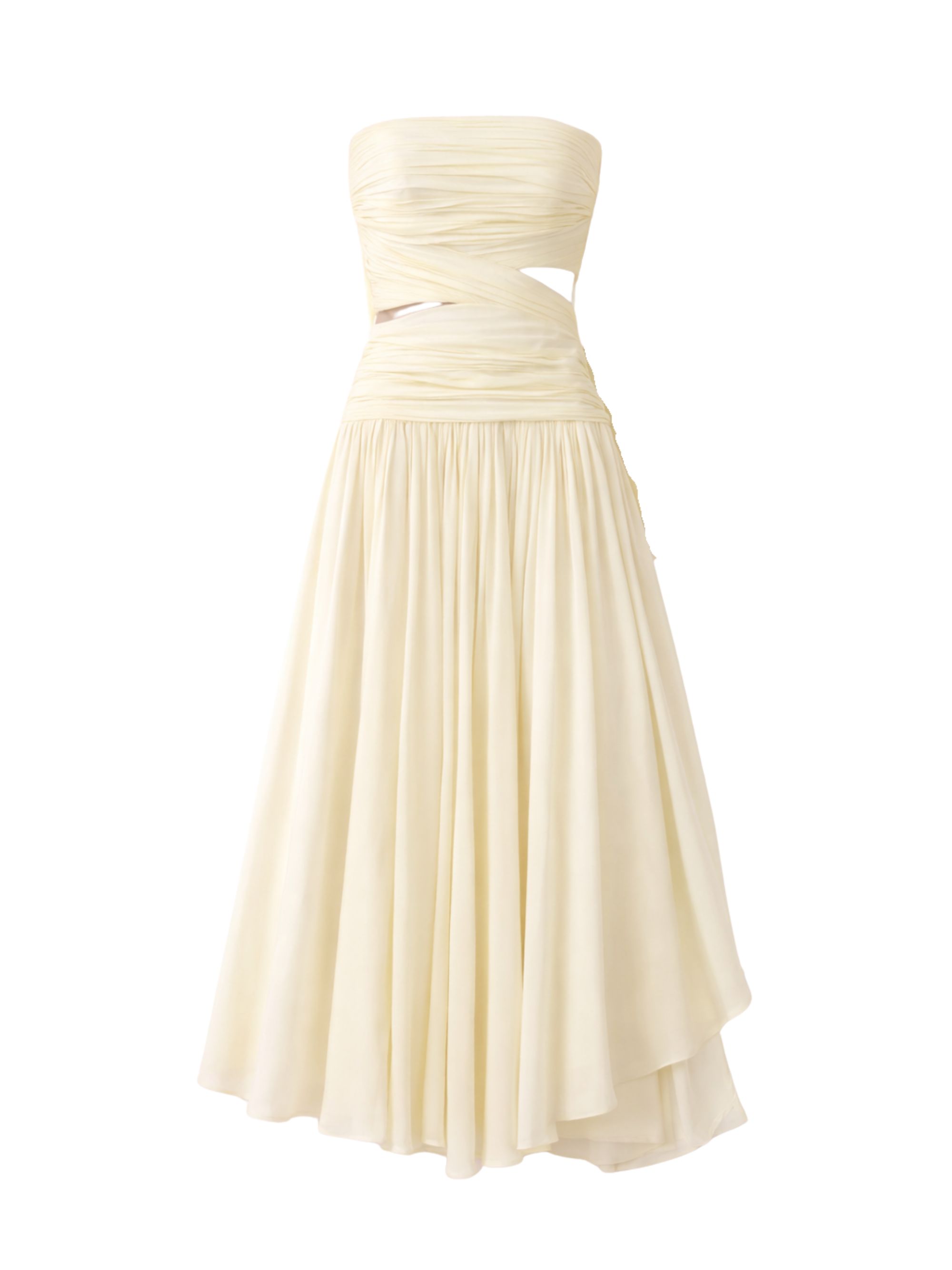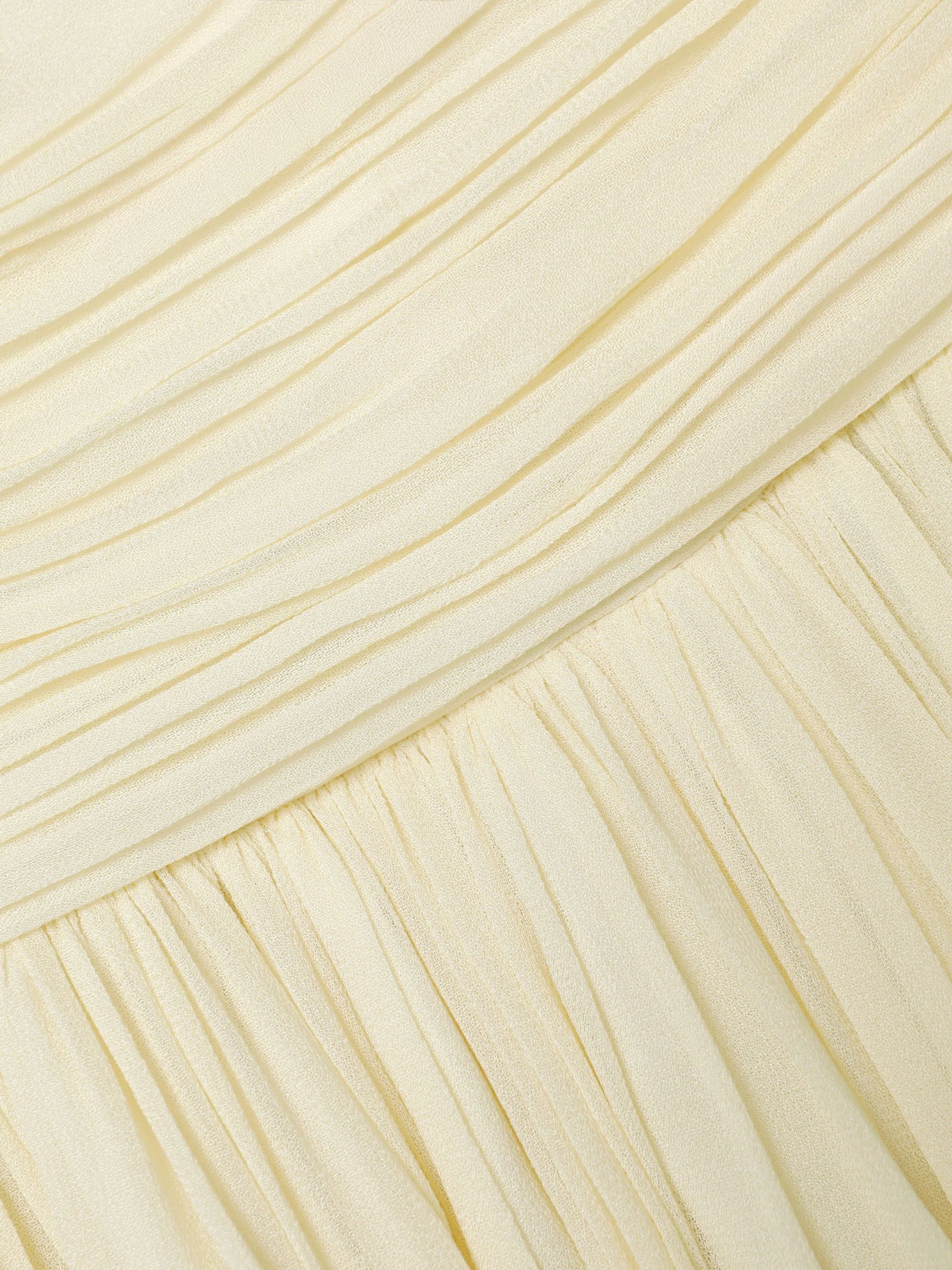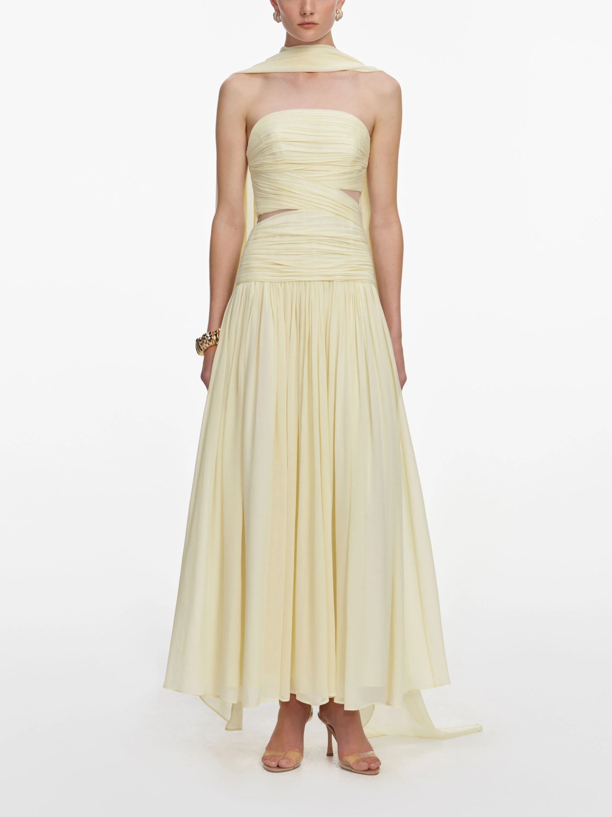 Abito midi con sciarpa di SELF PORTRAIT giallo in georgette, caratterizzata da spalle scoperte, arricciature avvolgenti, stile aderente, chiusura con zip nascosta sul retro, corsetto interno e ritagli sul davanti.